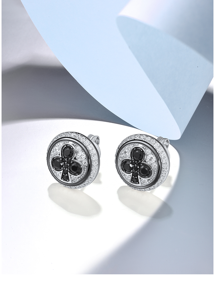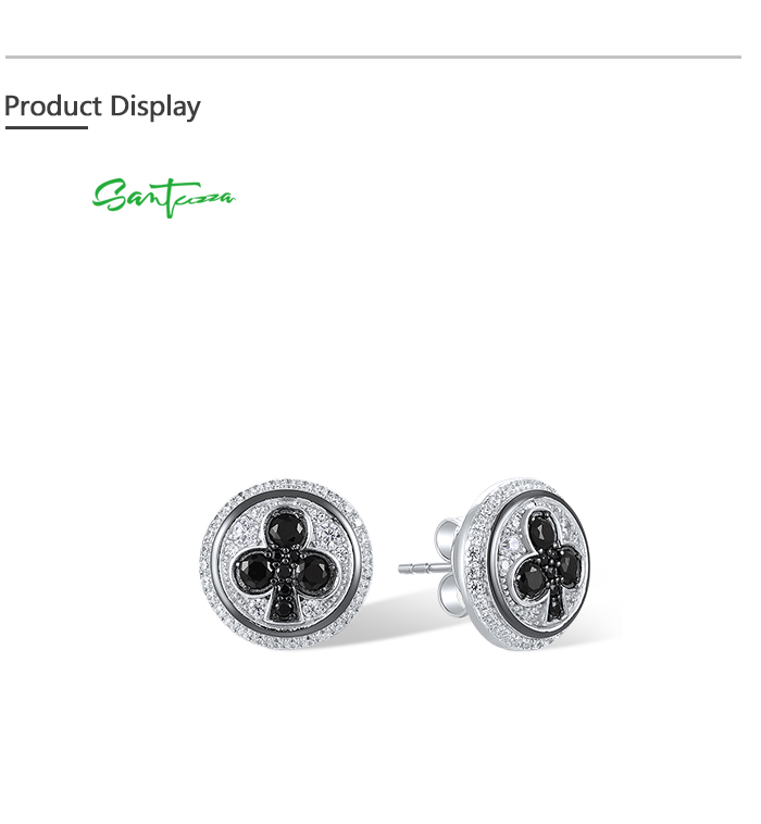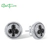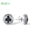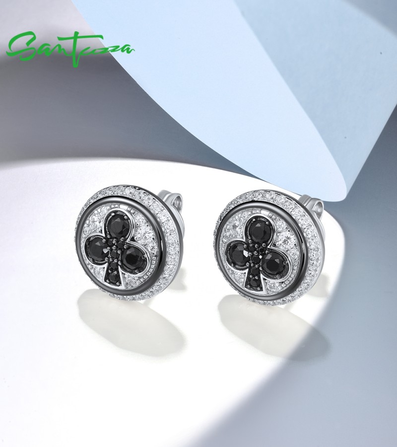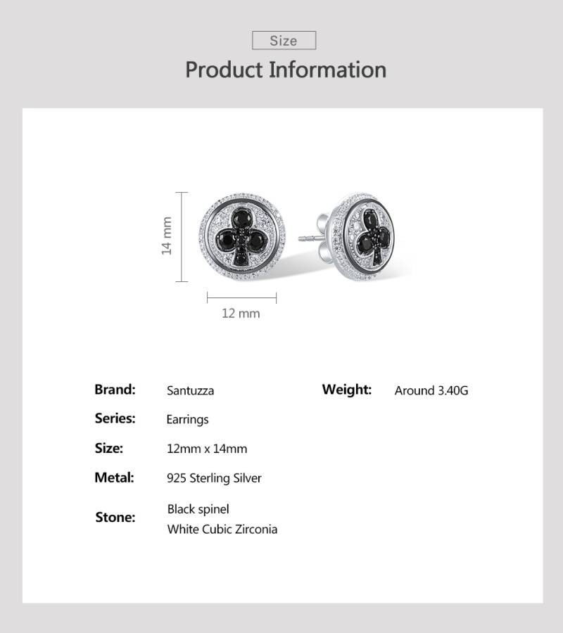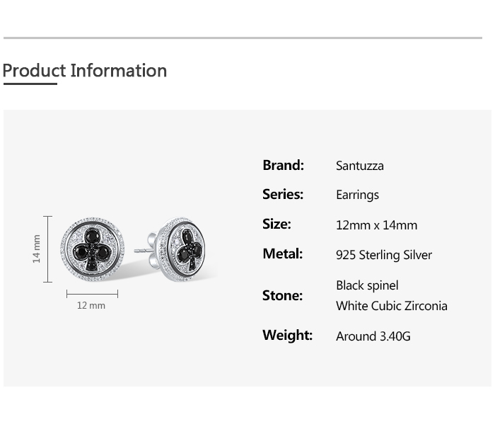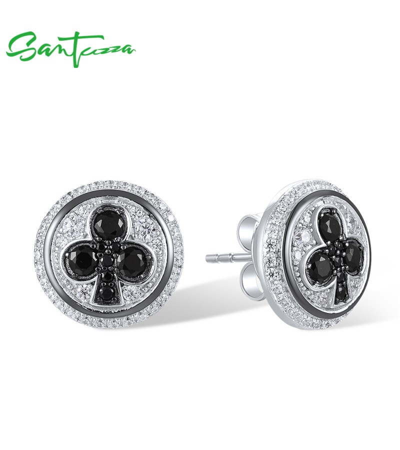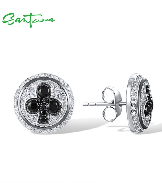 SANTUZZA 925 Sterling Silver Stud Earrings White Cubic Zirconia Black Spinel Round Jewelry