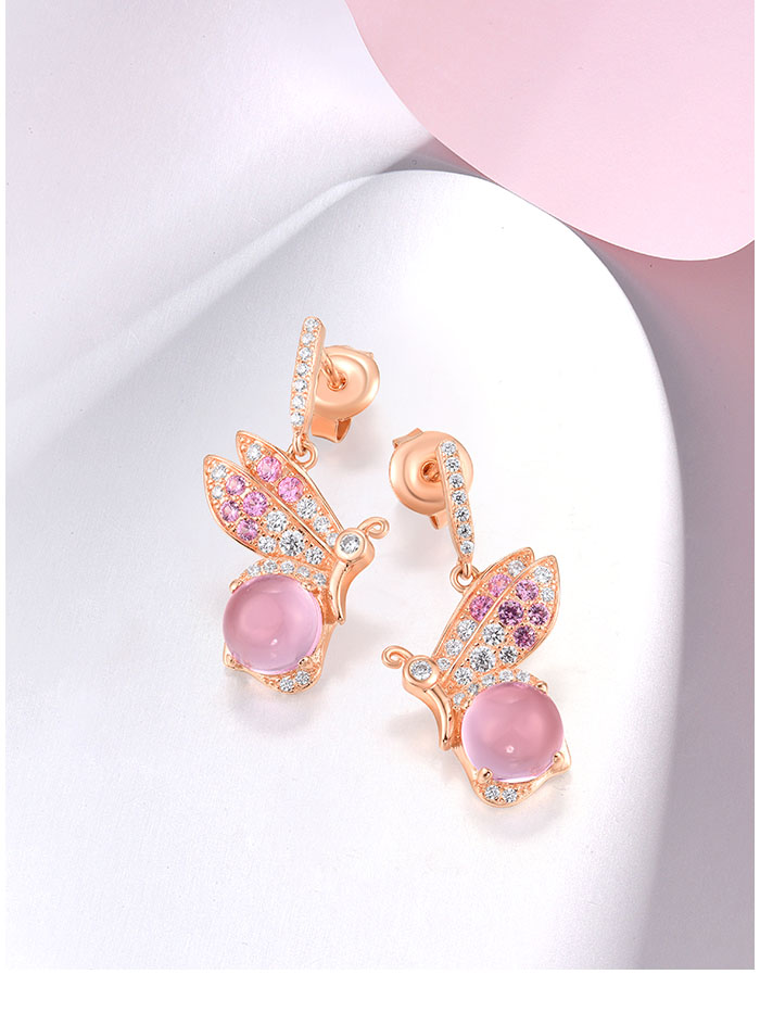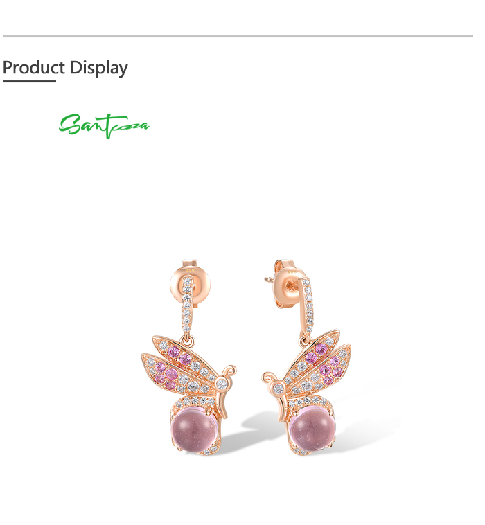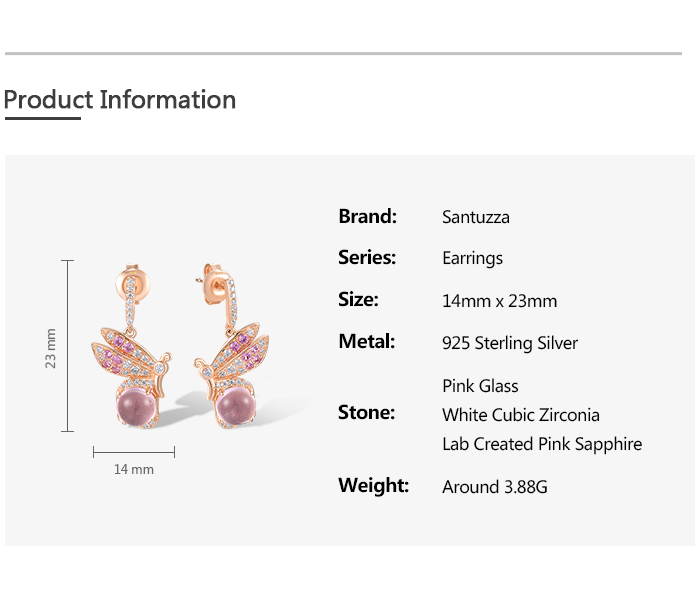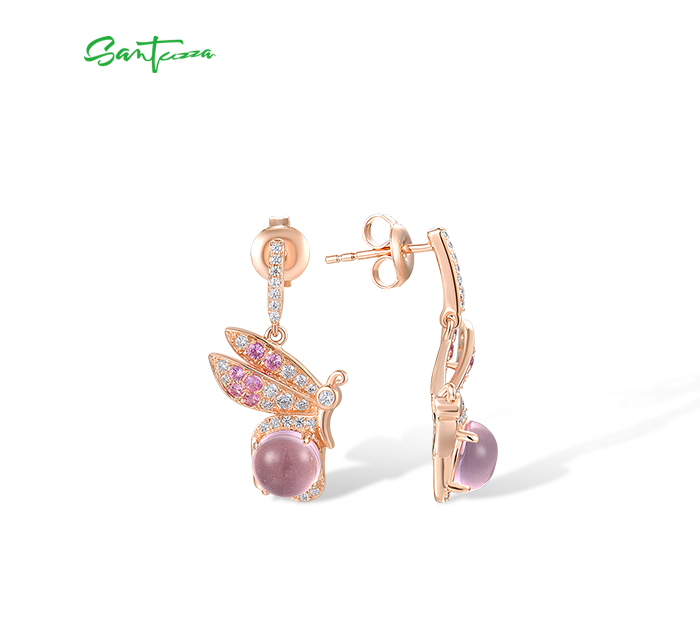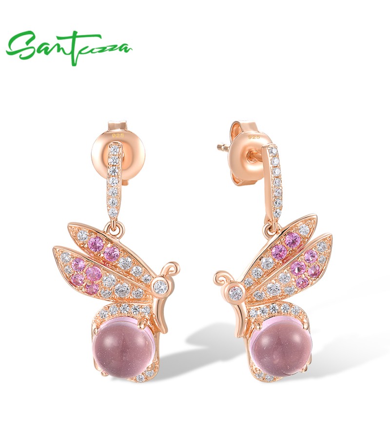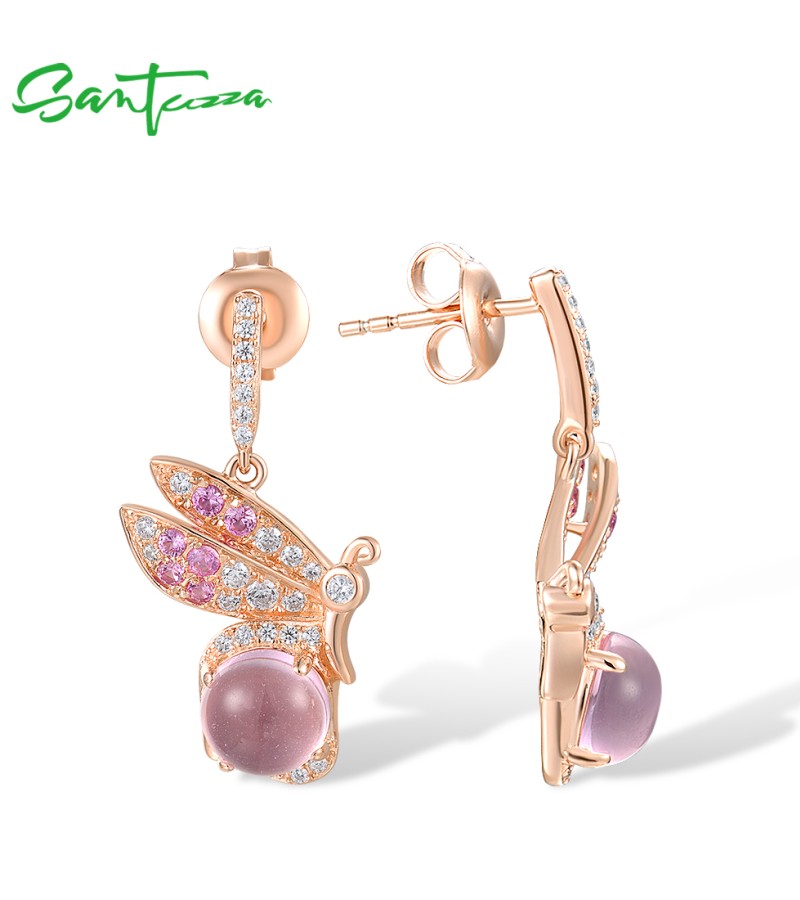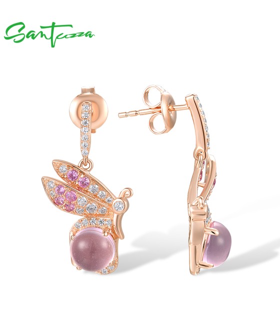 SANTUZZA 925 Sterling Silver Earrings Created Pink Sapphire White CZ Insect Jewelry