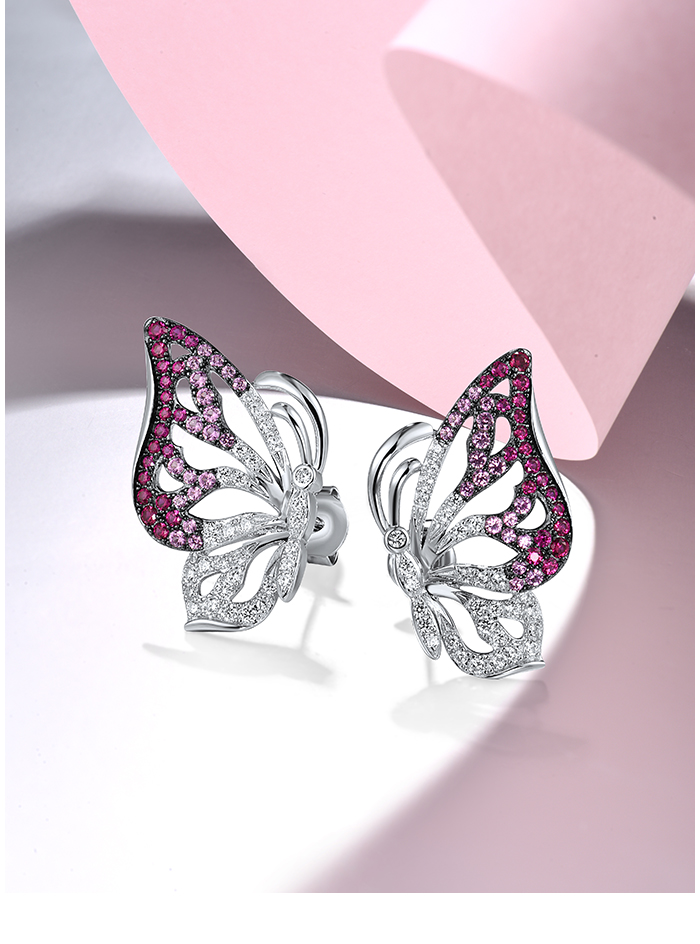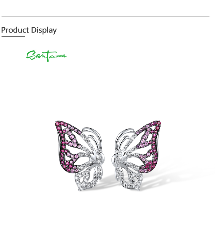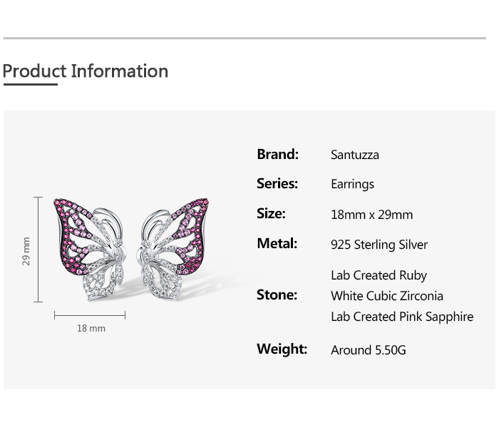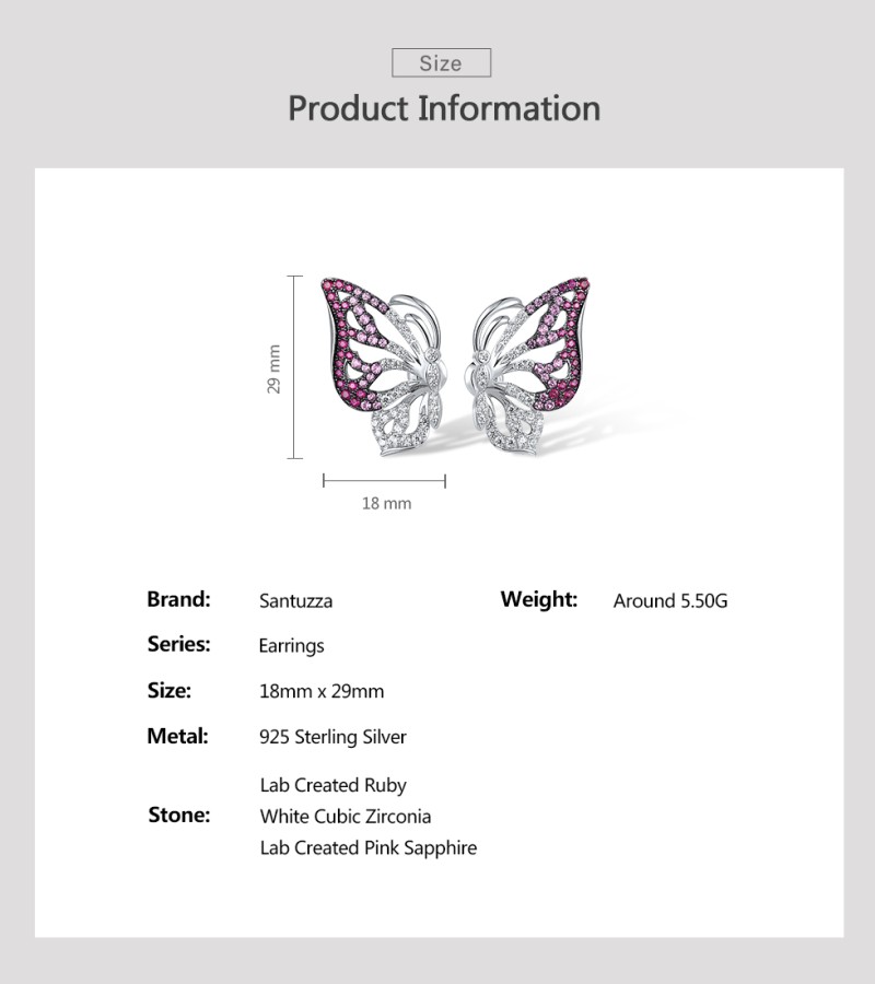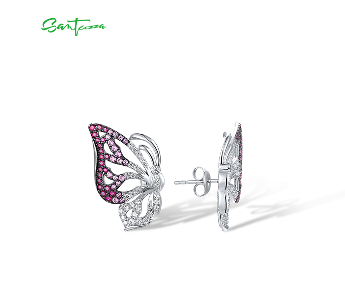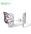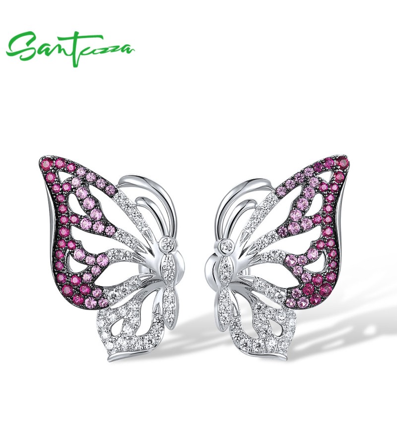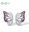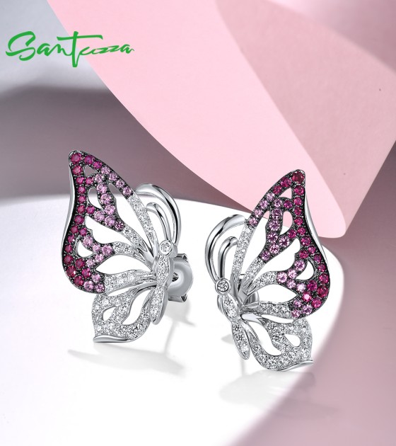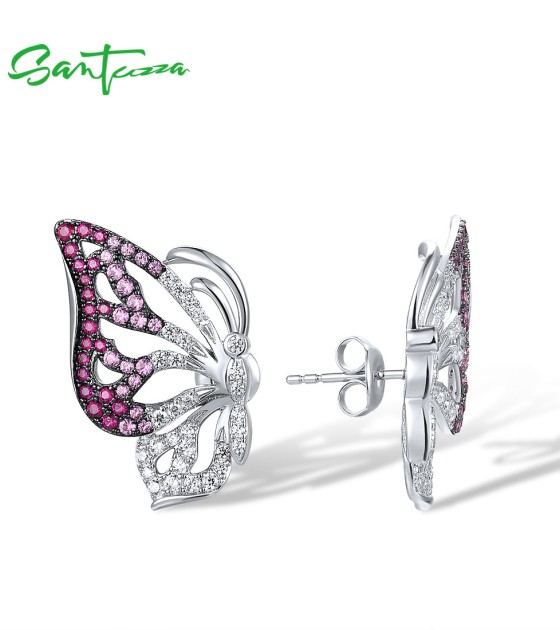 SANTUZZA 925 Sterling Silver Stud Earrings White CZ Pink And Red Butterfly Jewelry