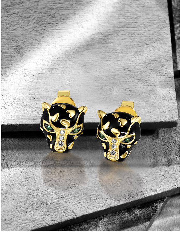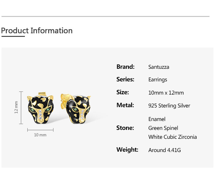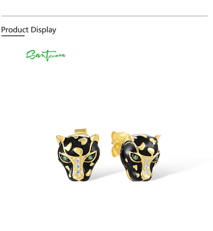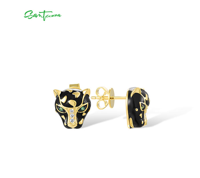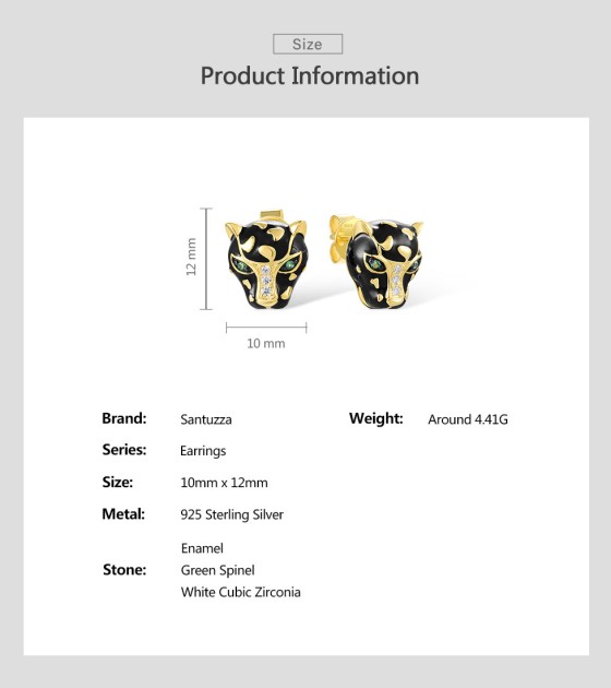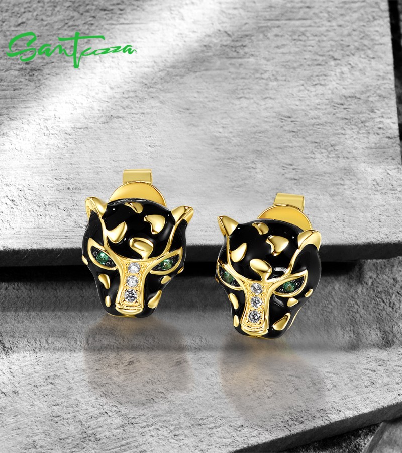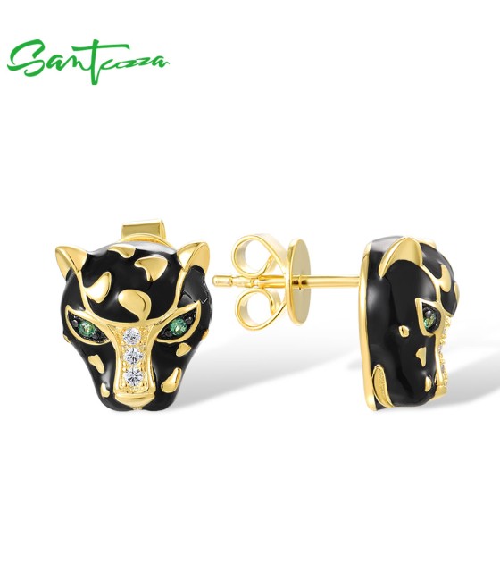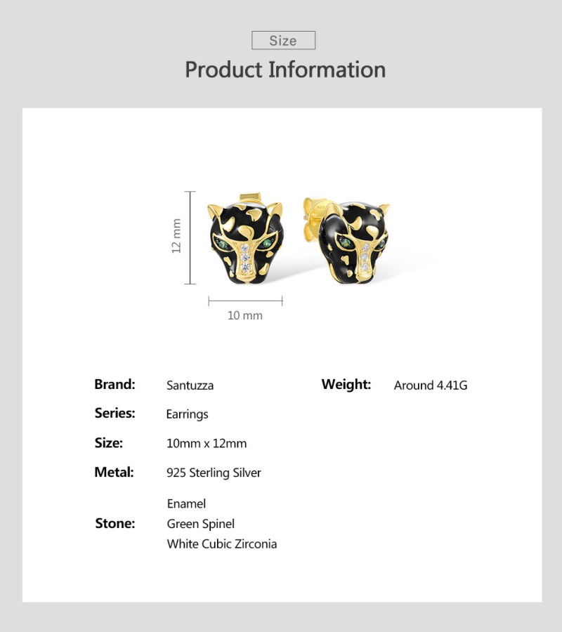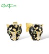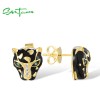 SANTUZZA 925 Sterling Silver Stud Black Leopard Earrings Green Spinel White CZ Animal Enamel Jewelry