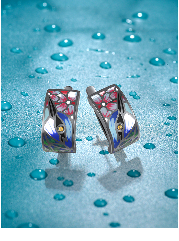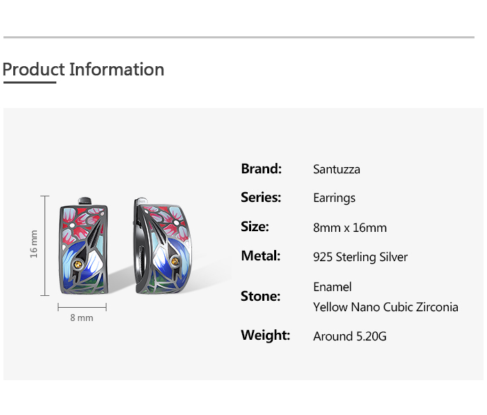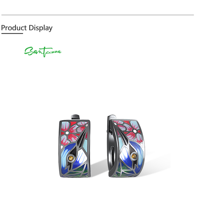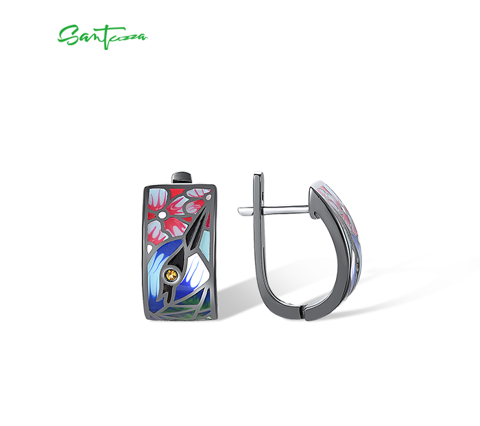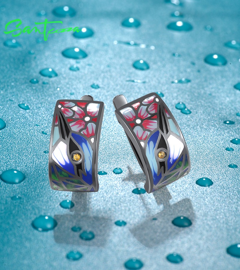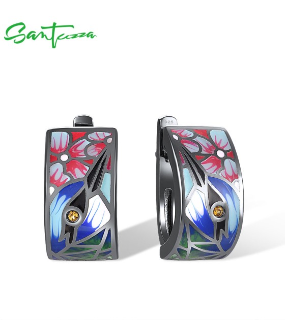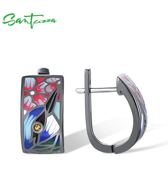 SANTUZZA 925 Sterling Silver Earrings Nightingale Bird Pink Flower Colorfull Enamel Jewelry