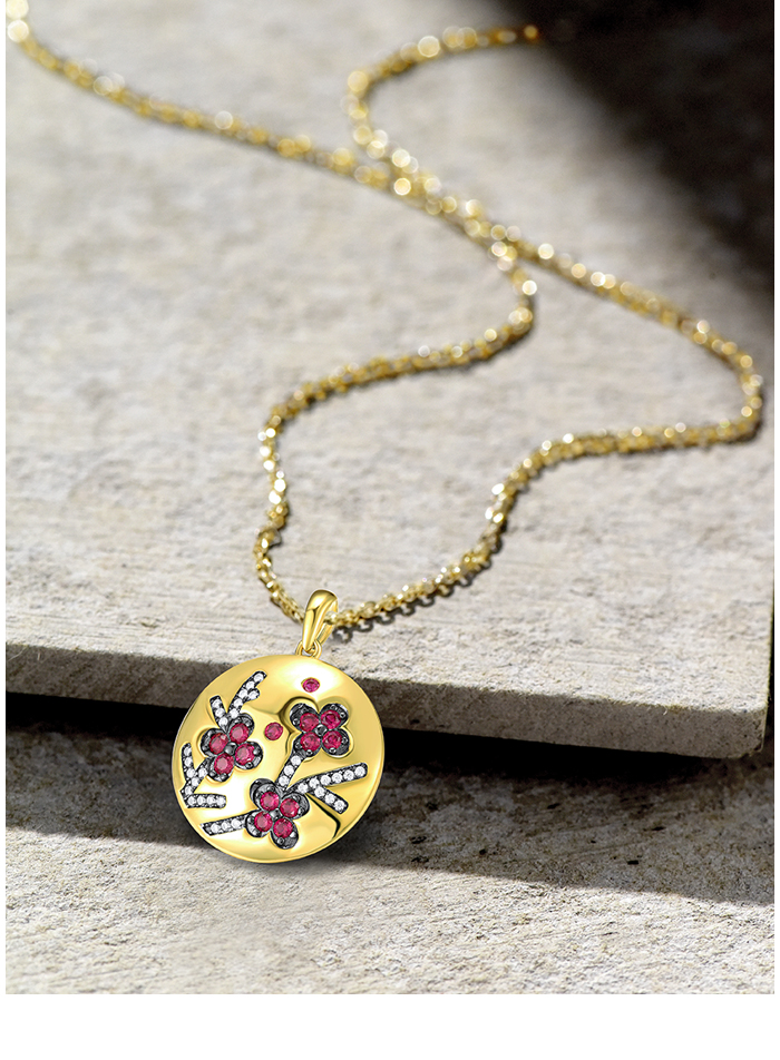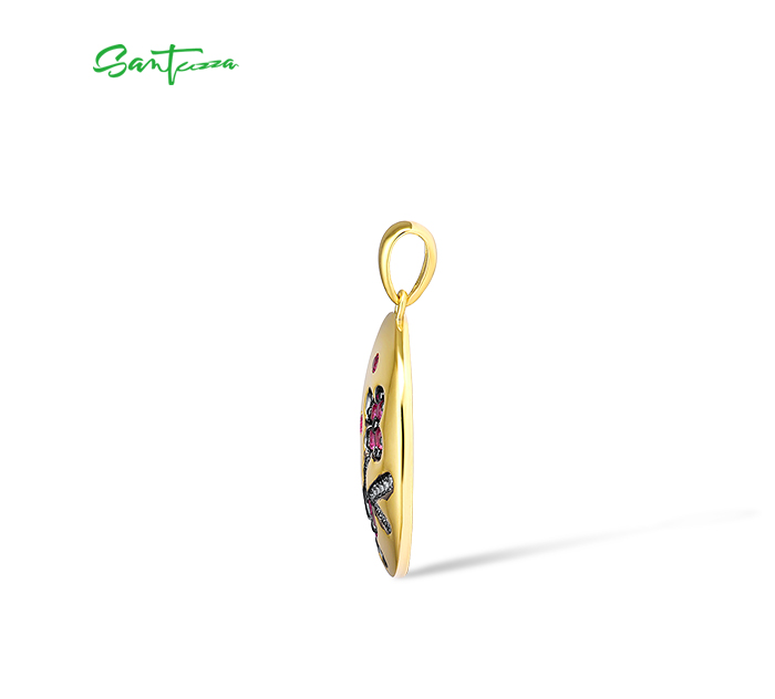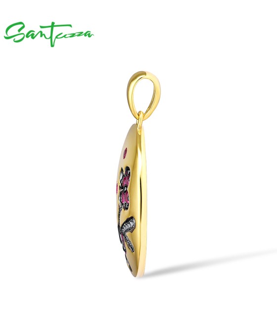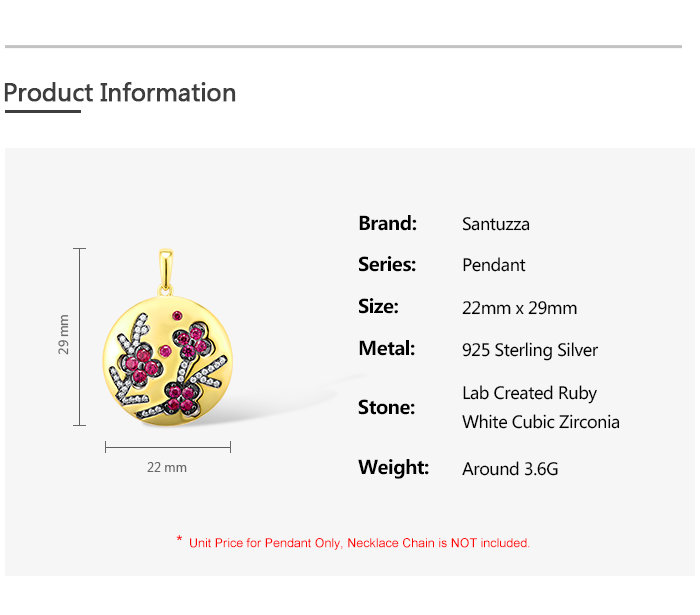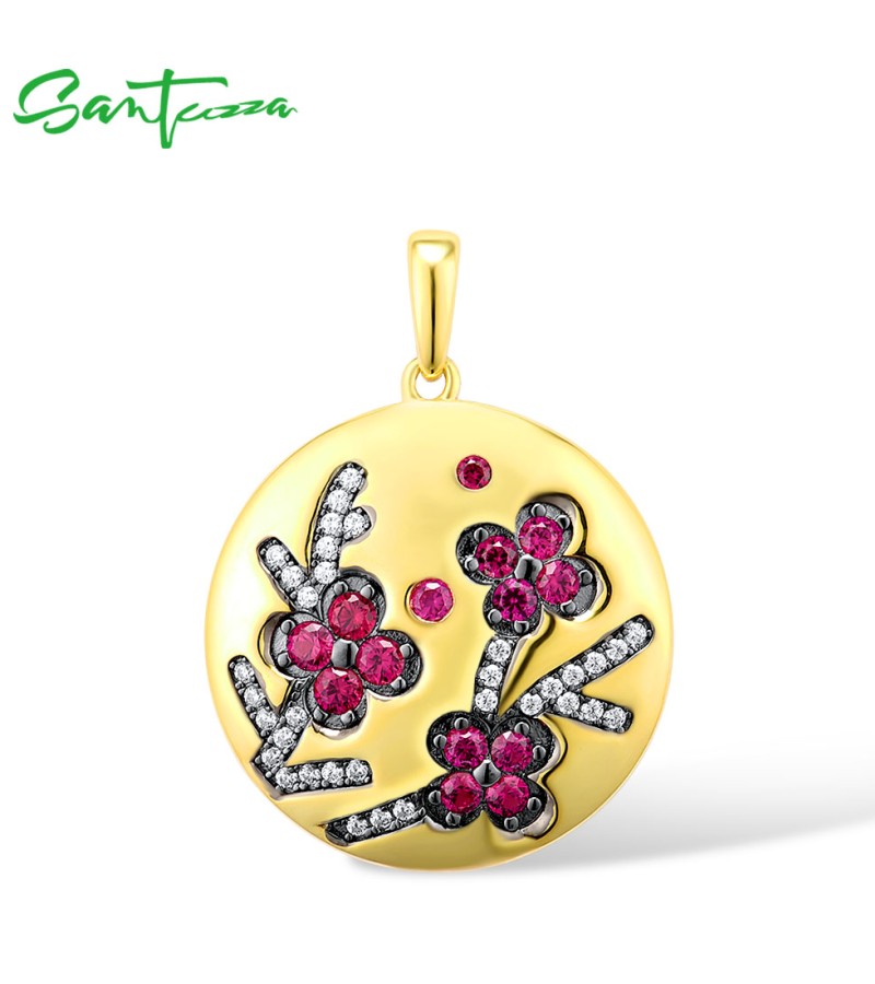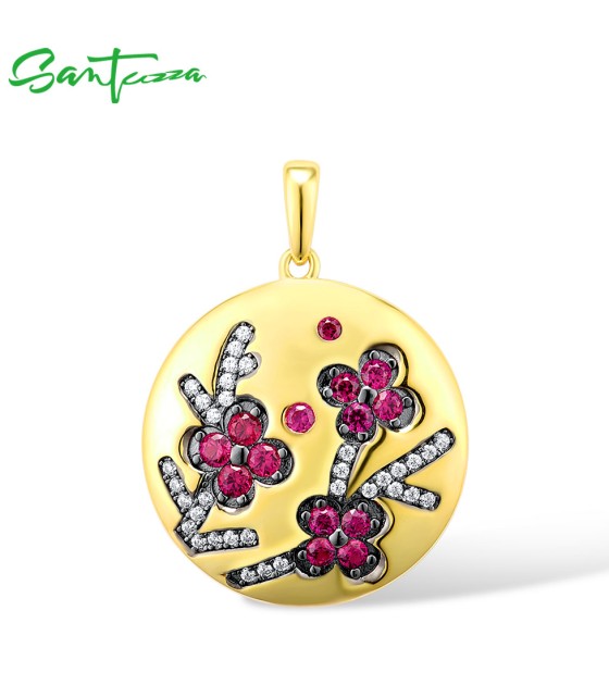 SANTUZZA 925 Sterling Silver Red Flower Pendant Created Ruby White Cubic Zirconia Round Jewelry