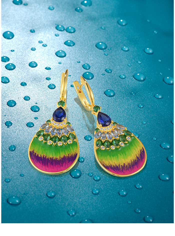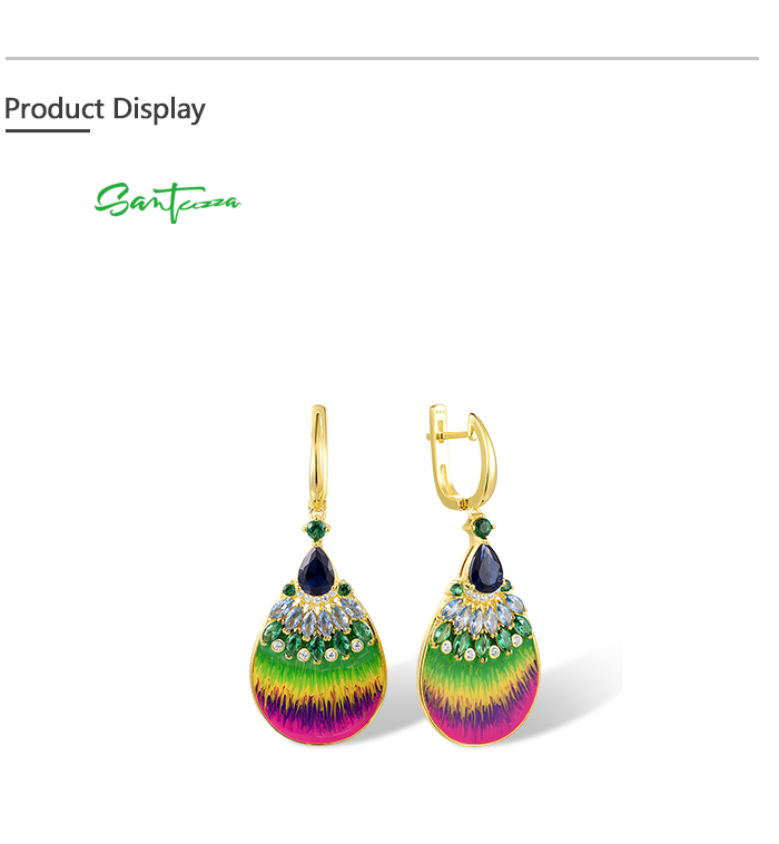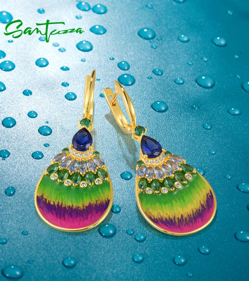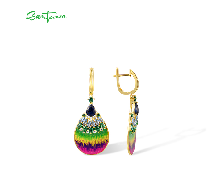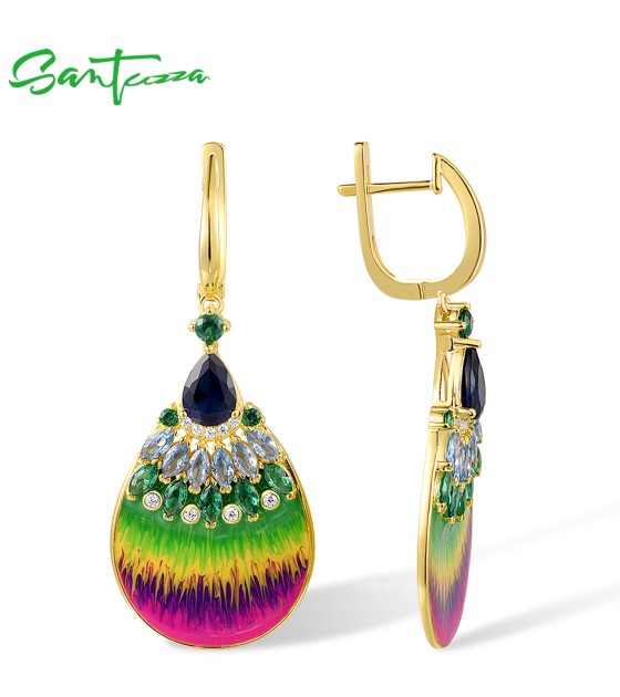 SANTUZZA 925 Sterling Silver Rainbow Earrings Colorful Stone Fan Shape Yellow Plate Enamel Jewelry