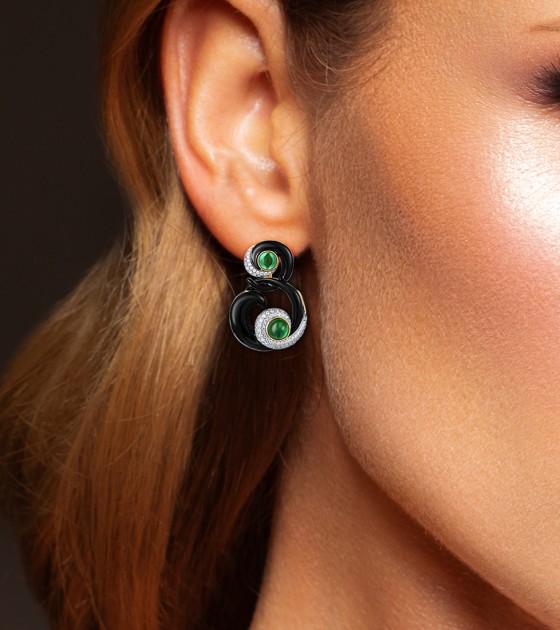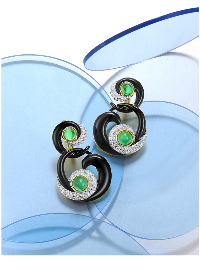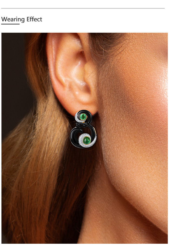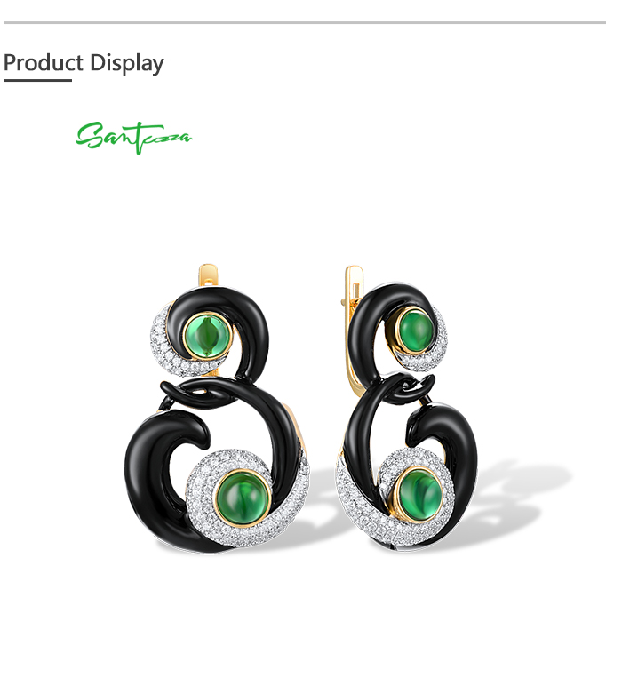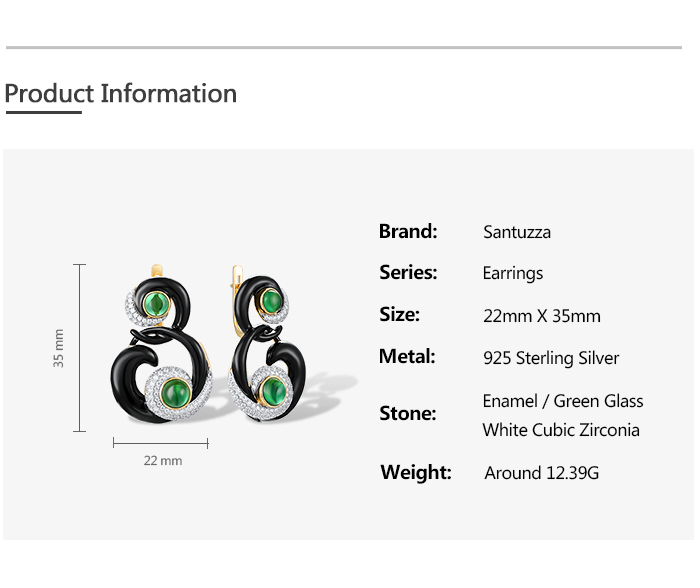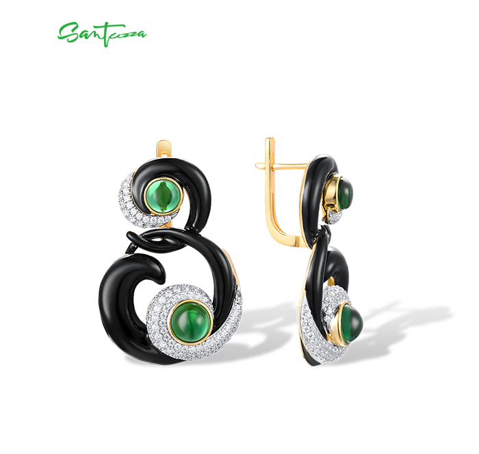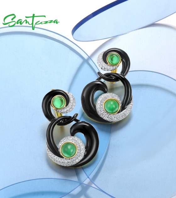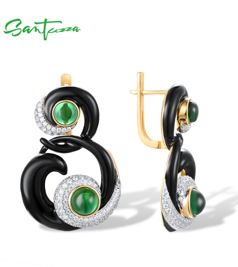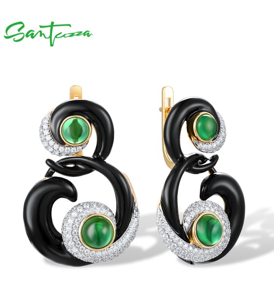SANTUZZA 925 Sterling Silver Earrings Green Stones White CZ Black Enamel Curved Line Jewelry