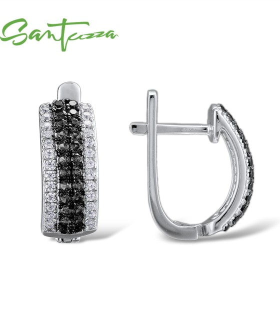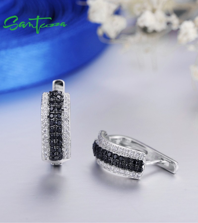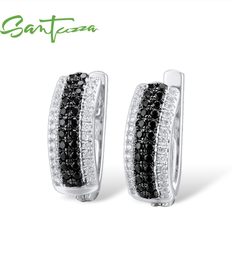 SANTUZZA 925 Sterling Silver Stud Earrings Round Black Stones Fine Jewelry