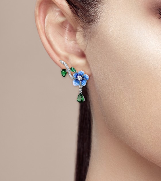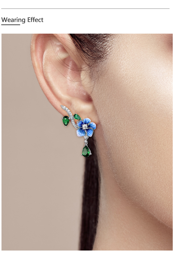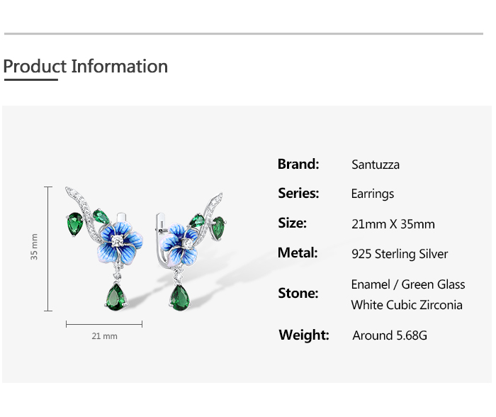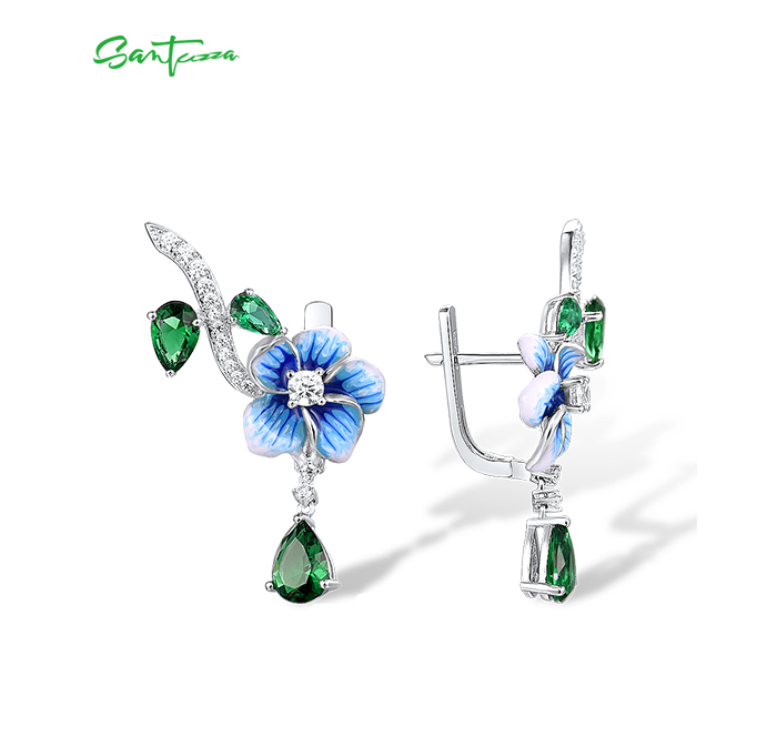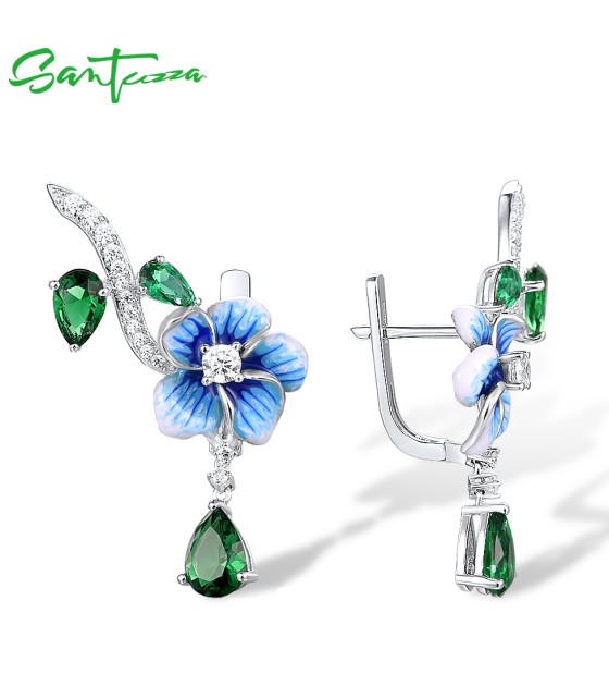 SANTUZZA 925 Sterling Silver Drop Earrings Green Stones White CZ Blue Flower Enamel Fine Jewelry