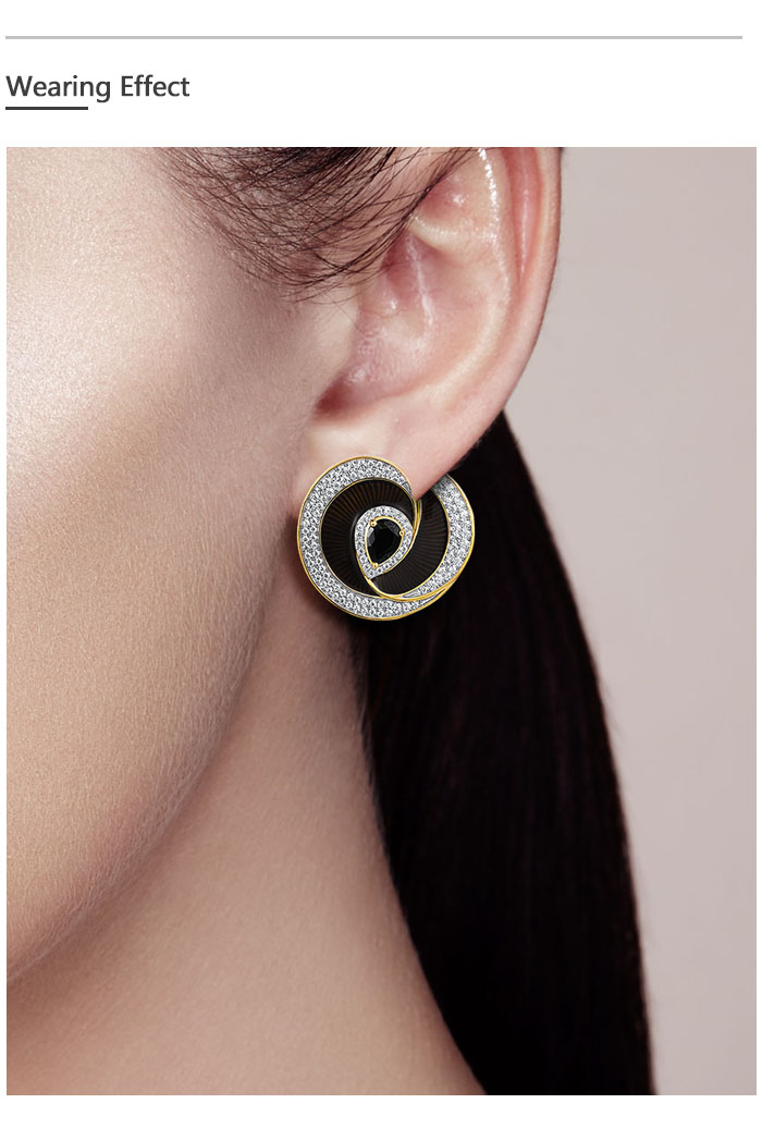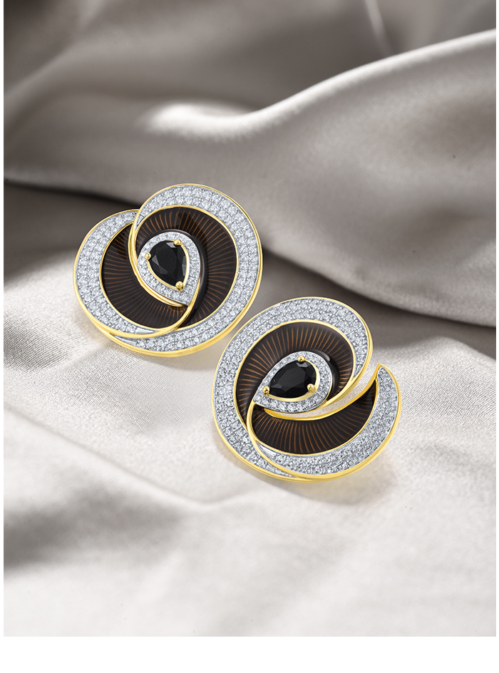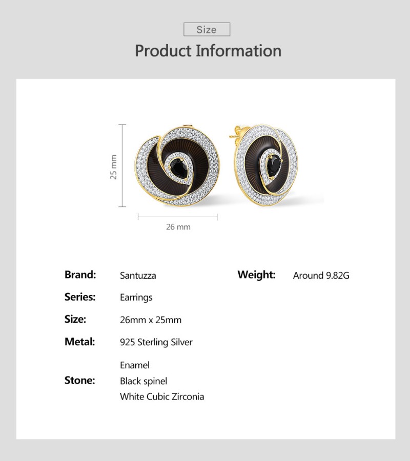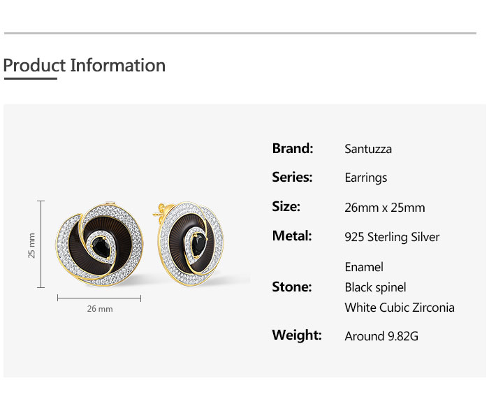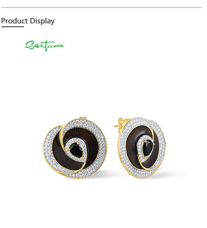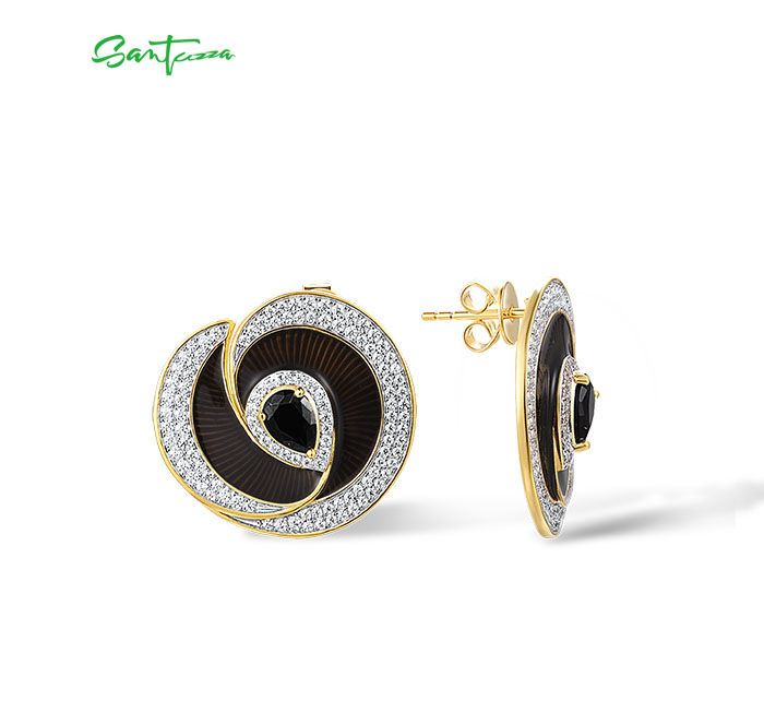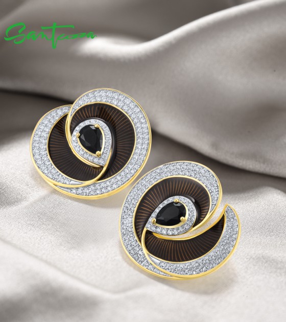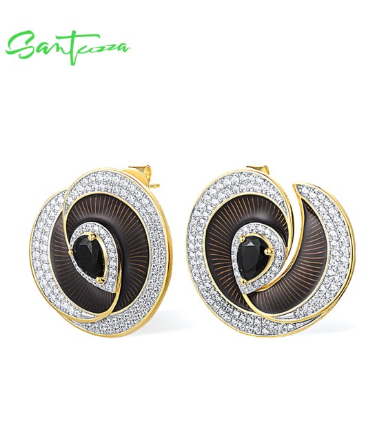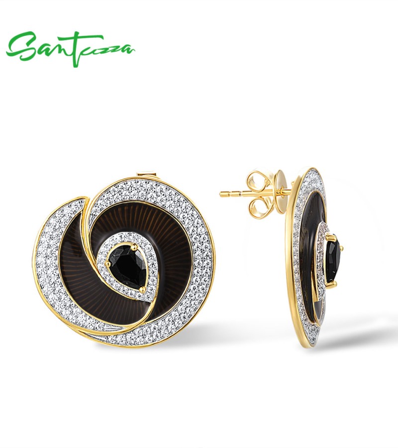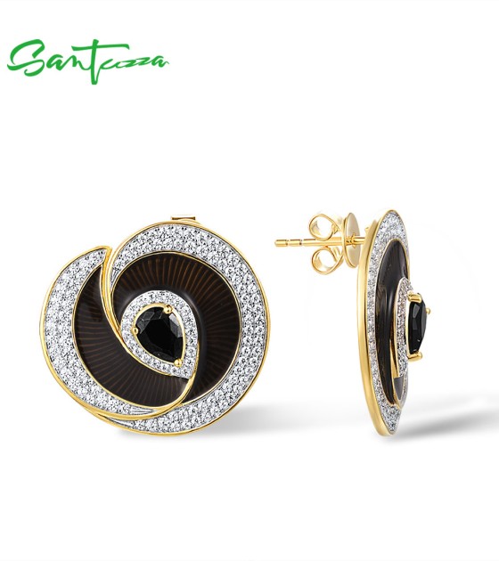 SANTUZZA 925 Sterling Silver Handmade Enamel Stud Earrings Black Spinel White CZ Fine Jewelry