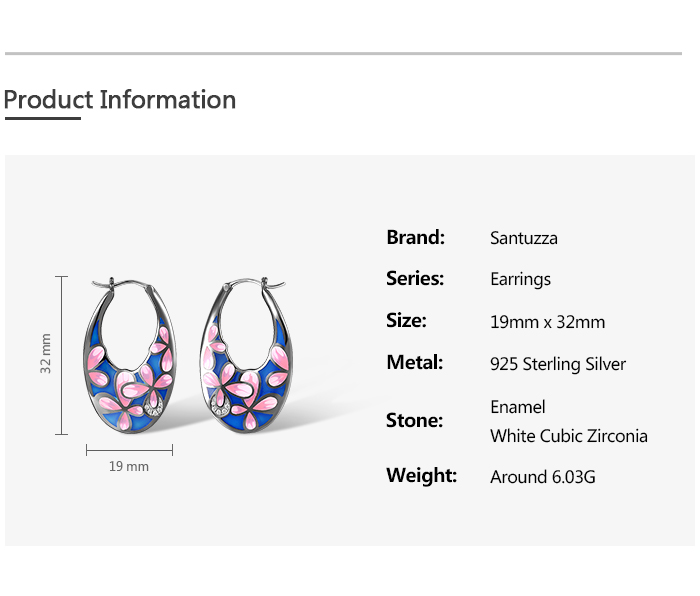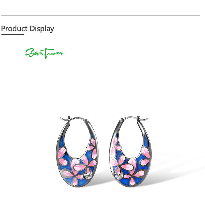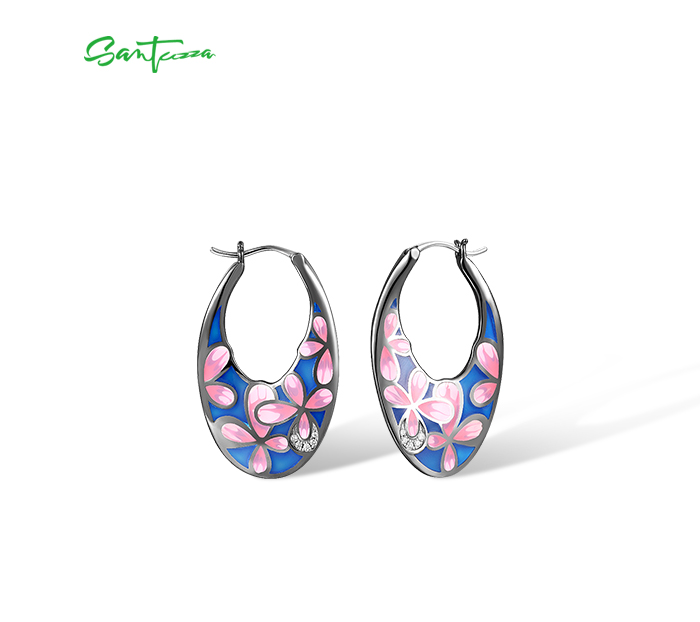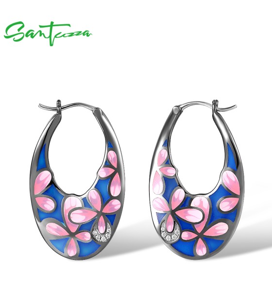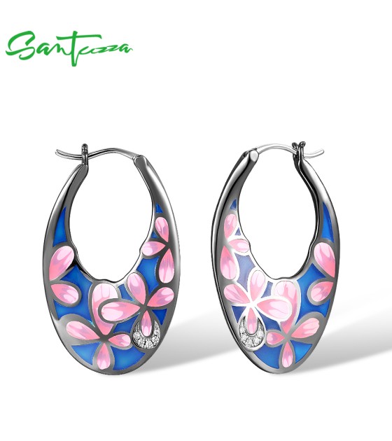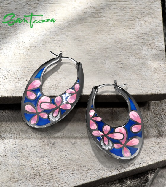 SANTUZZA 925 Sterling Silver Black Plated Pink Flower Hoop Earrings Enamel Brincos Jewelry