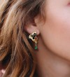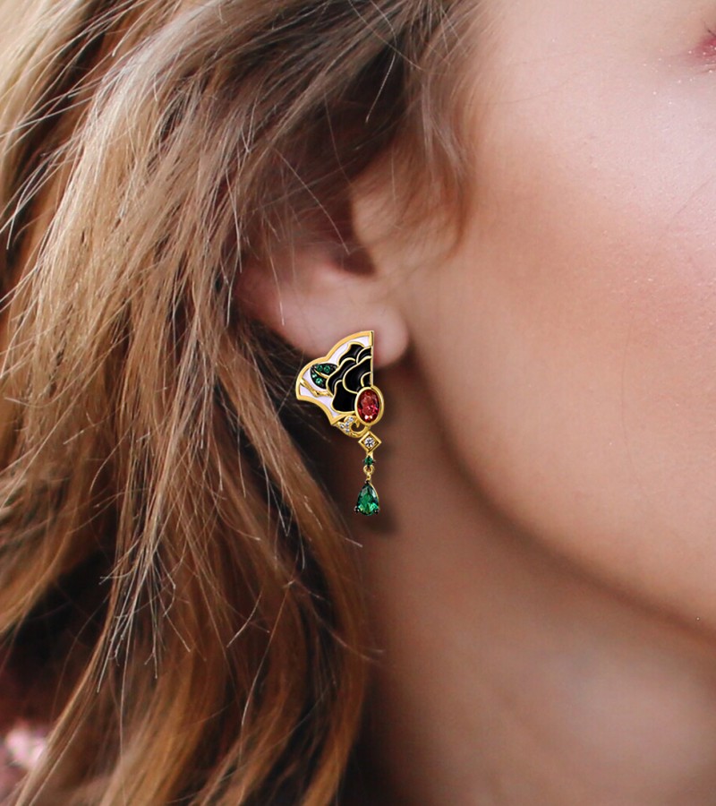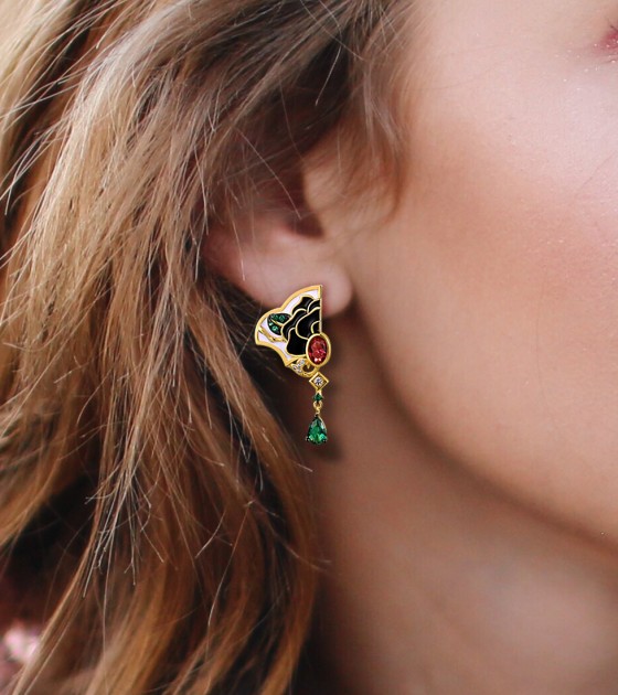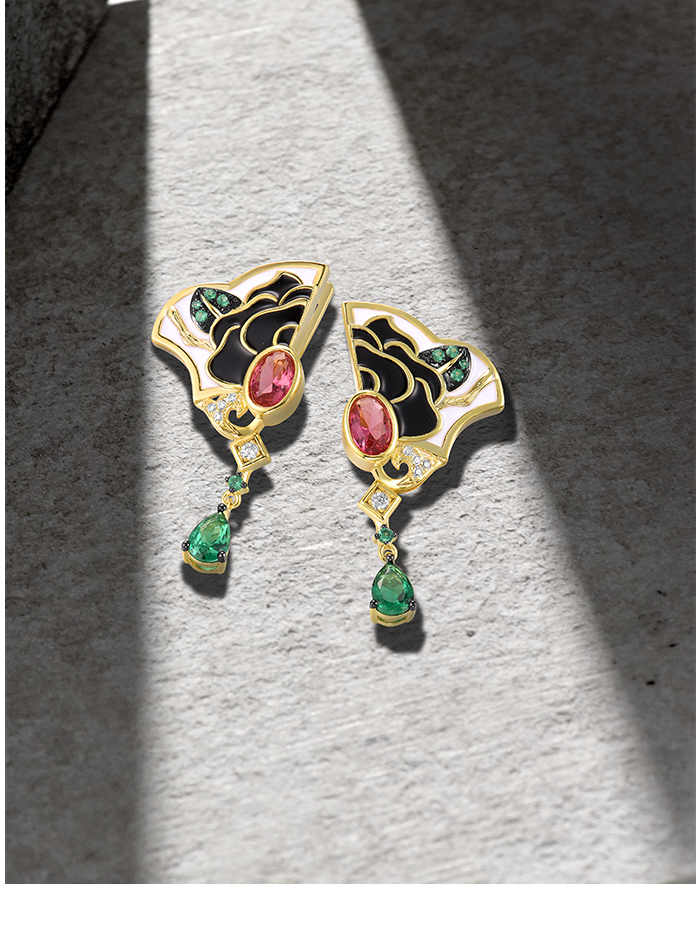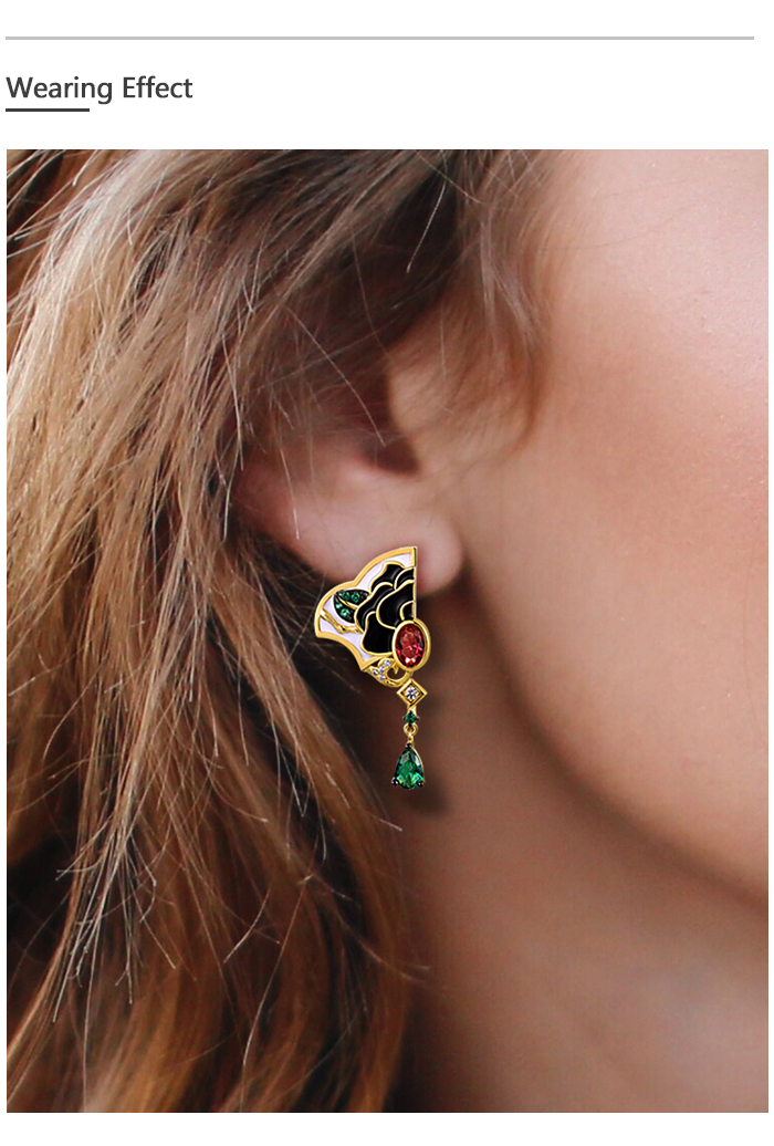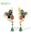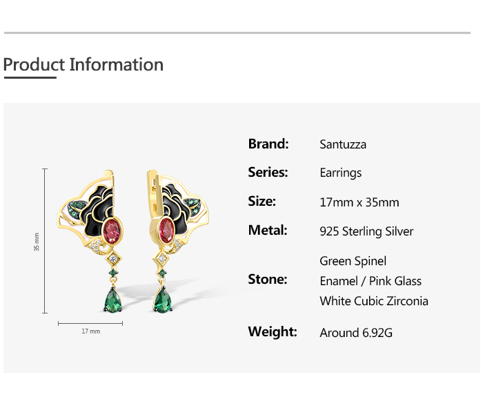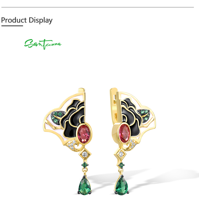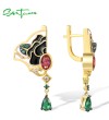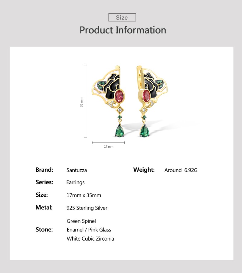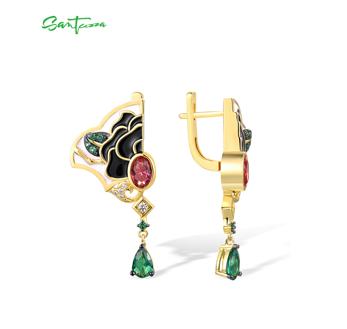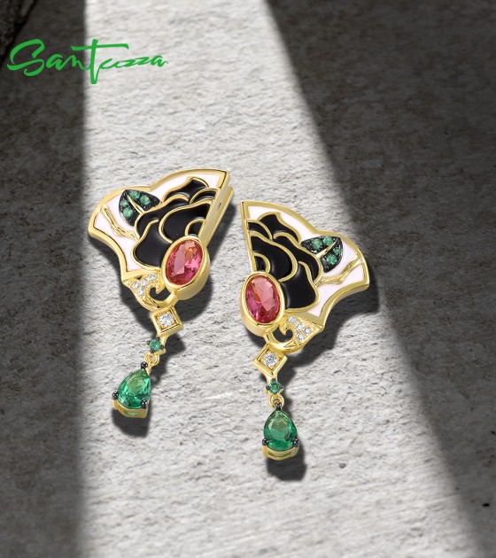 SANTUZZA 925 Sterling Silver Earrings White CZ Green Spinel Enamel Peony Gold Color Fine Jewelry