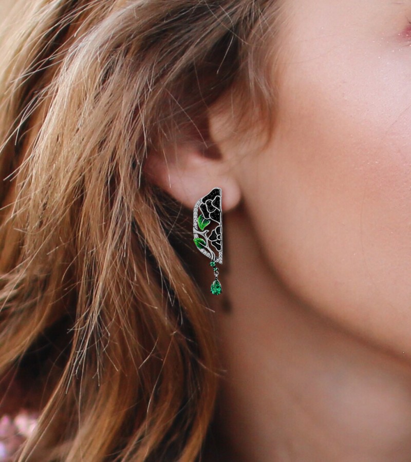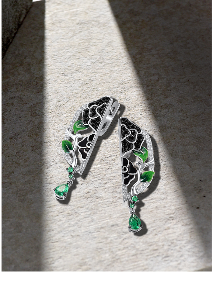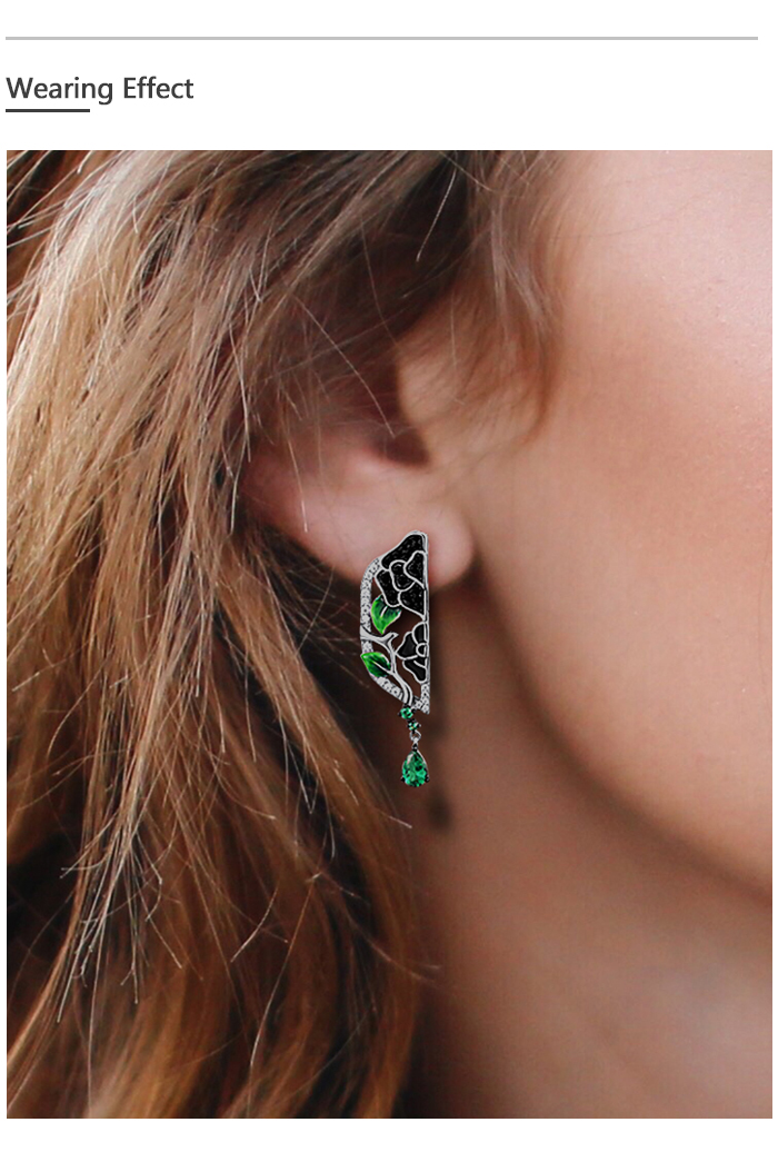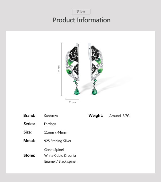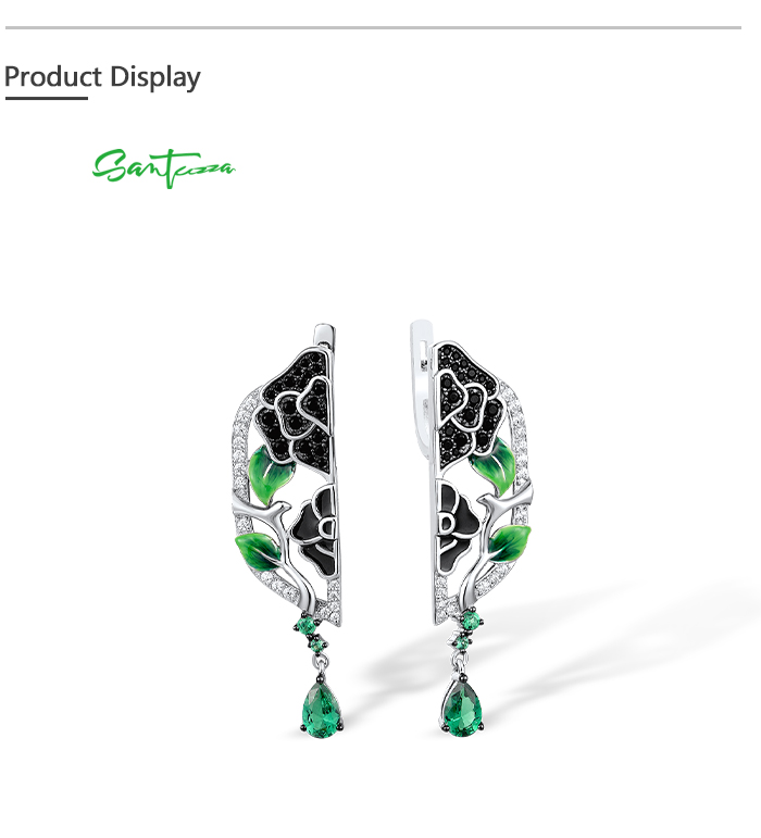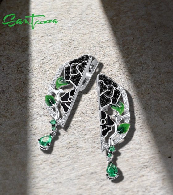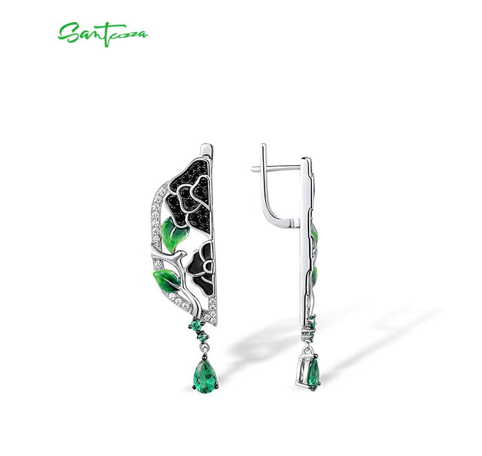 SANTUZZA 925 Sterling Silver Drop Earrings White CZ Black/Green Spine Enamel Peony Fine Jewelry