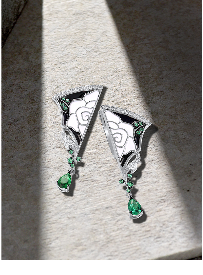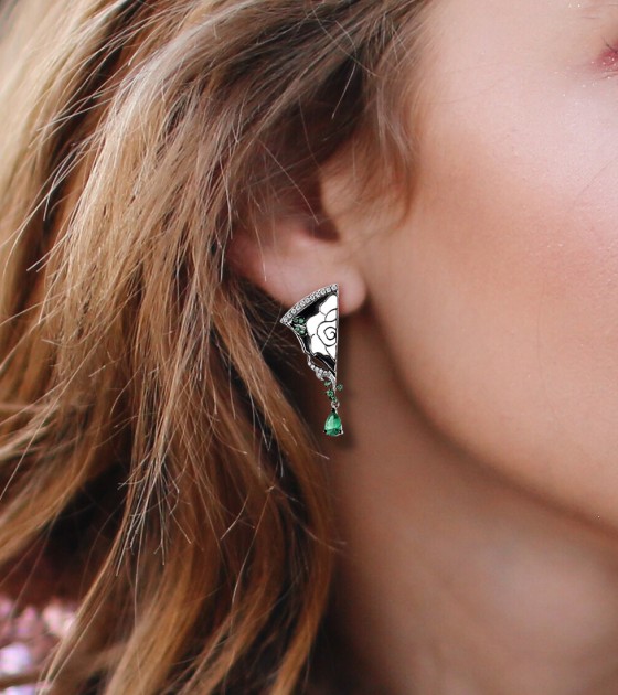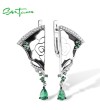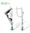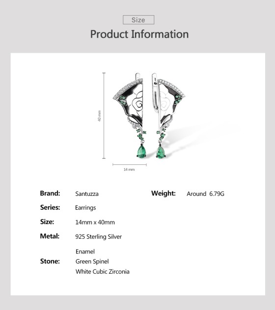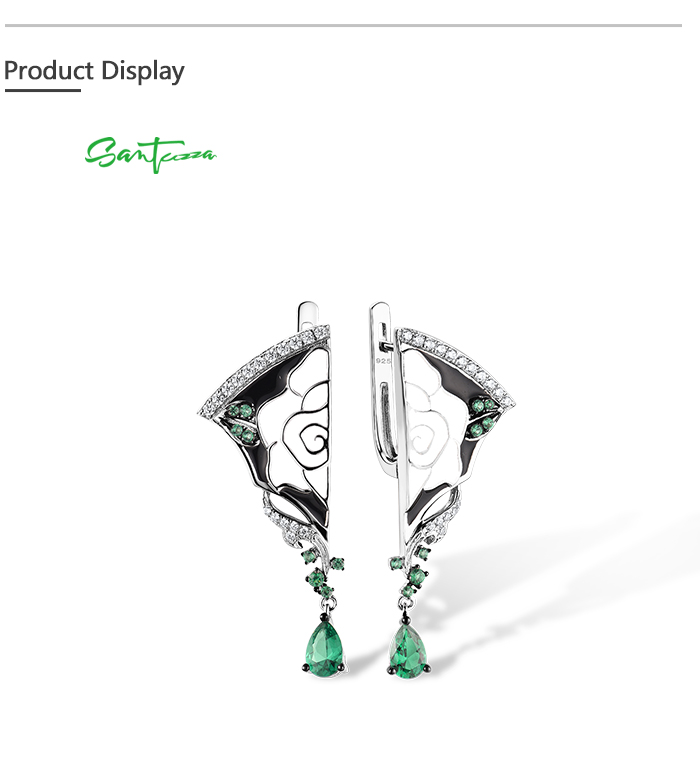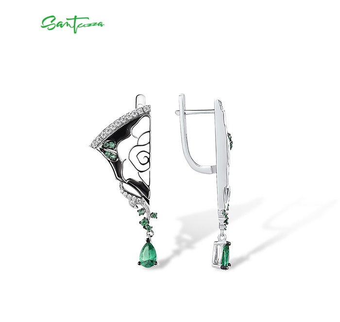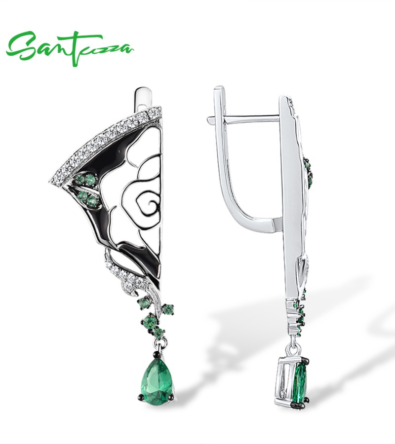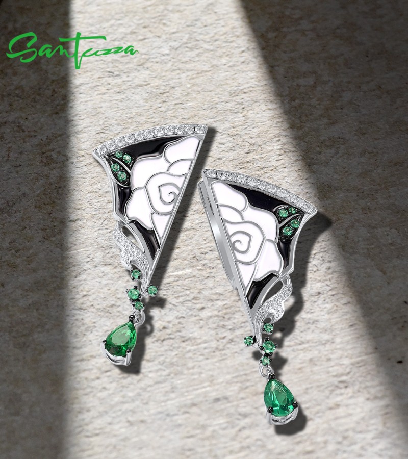 SANTUZZA 925 Sterling Silver Earrings White CZ Green Spinel Peony Handmade Enamel Fine Jewelry