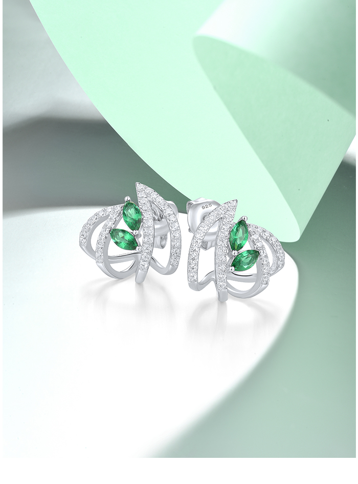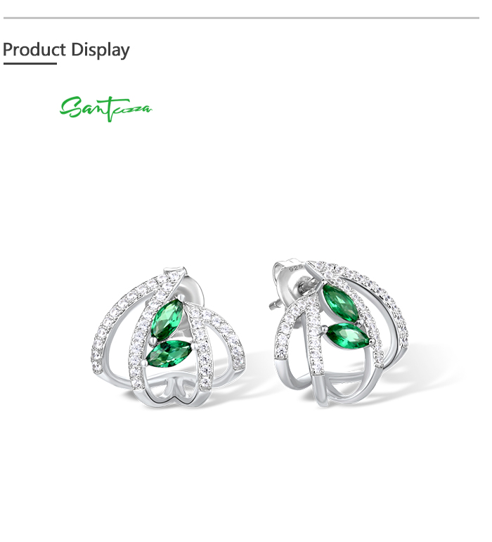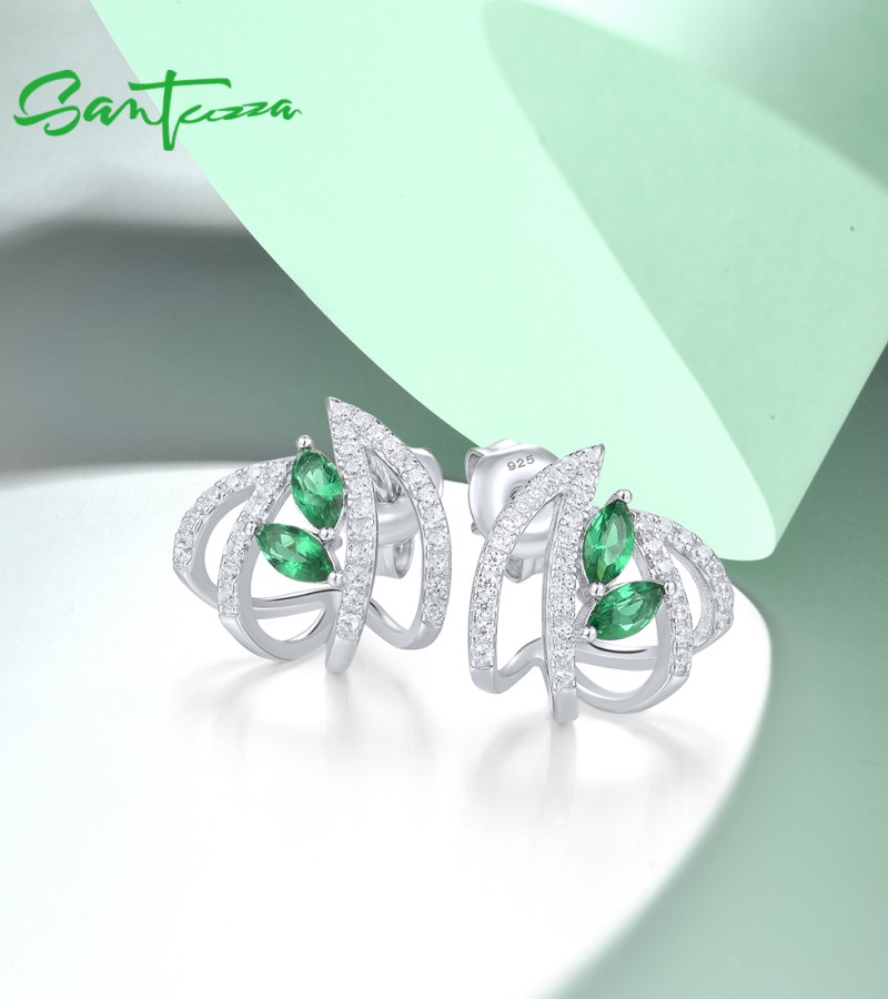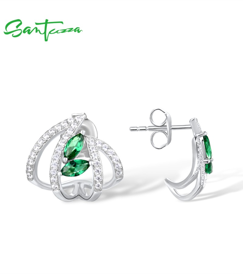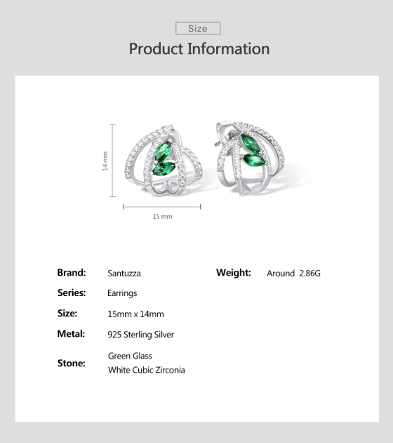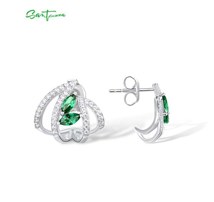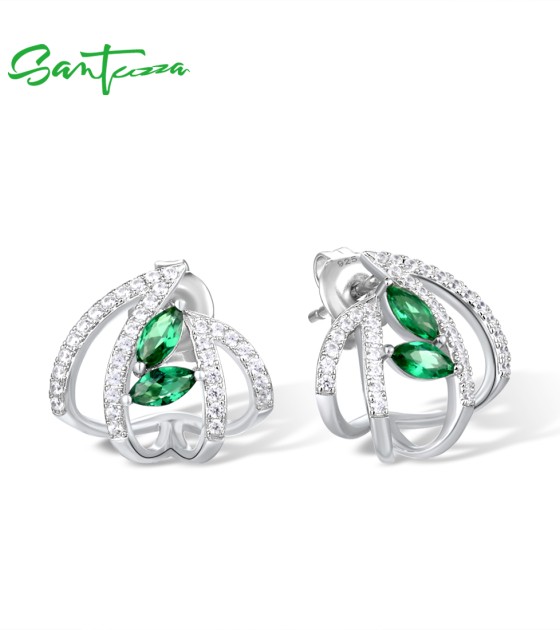 SANTUZZA 925 Sterling Silver Stud Earrings Green Stones White Cubic Zirconia Fine Jewelry