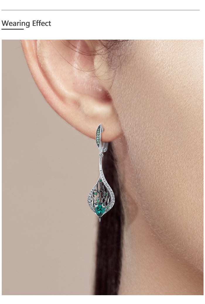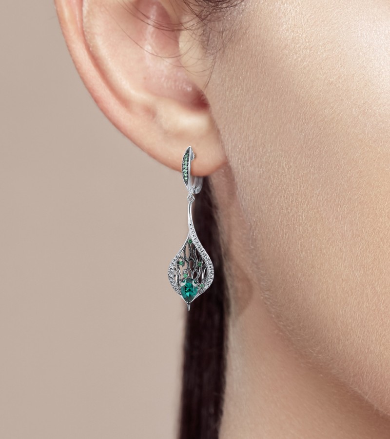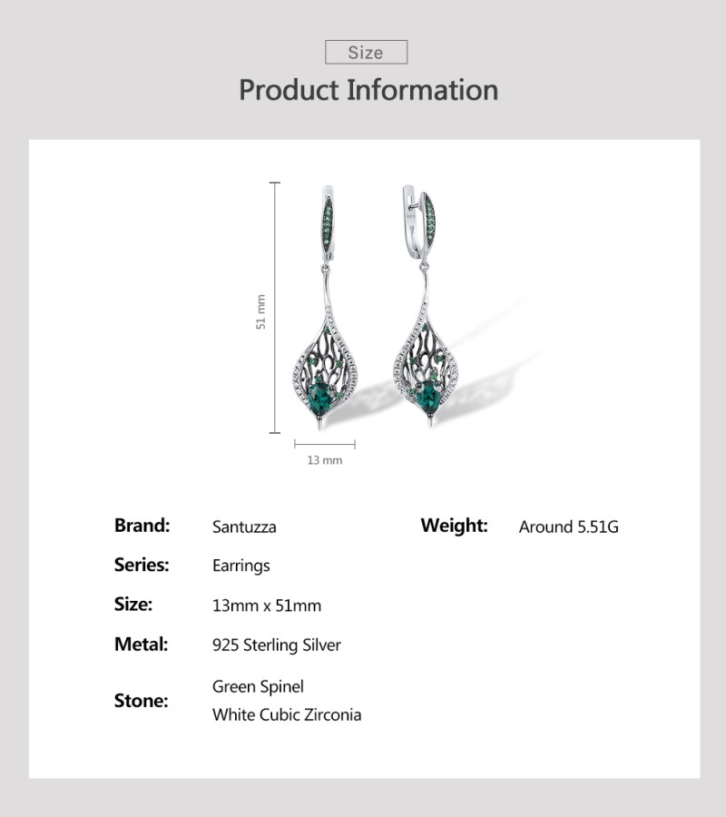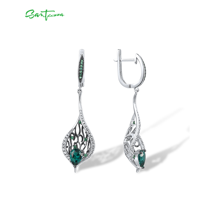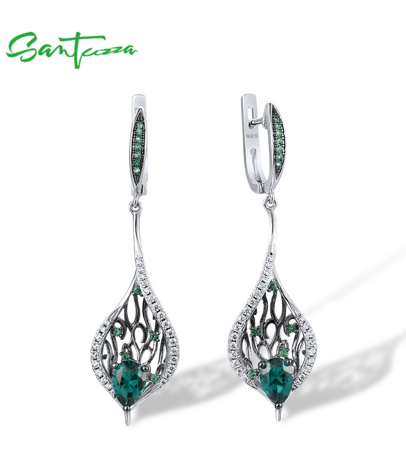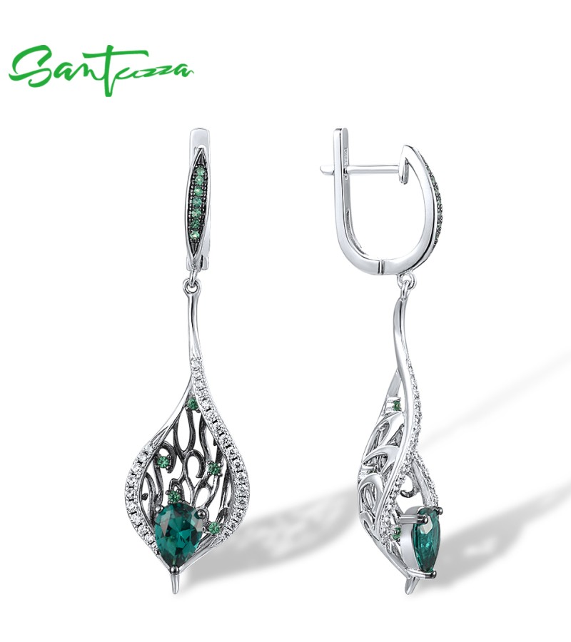 SANTUZZA 925 Sterling Silver Drop Earrings Green Spinel White CZ Leaves Plant Fine Jewelry