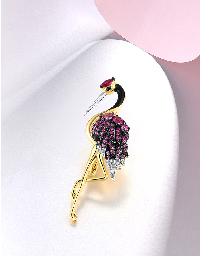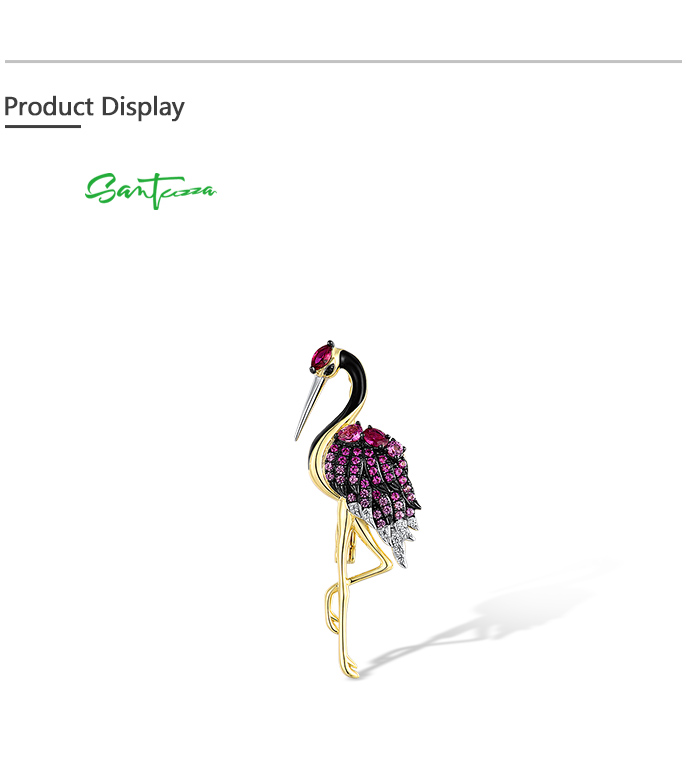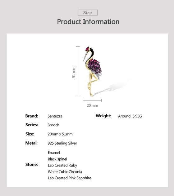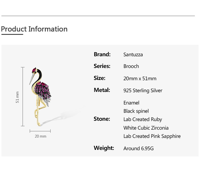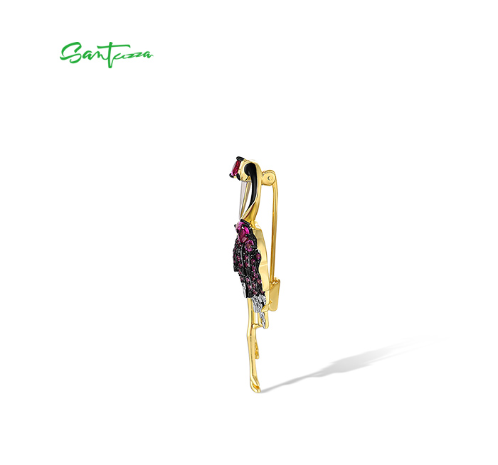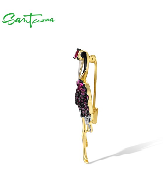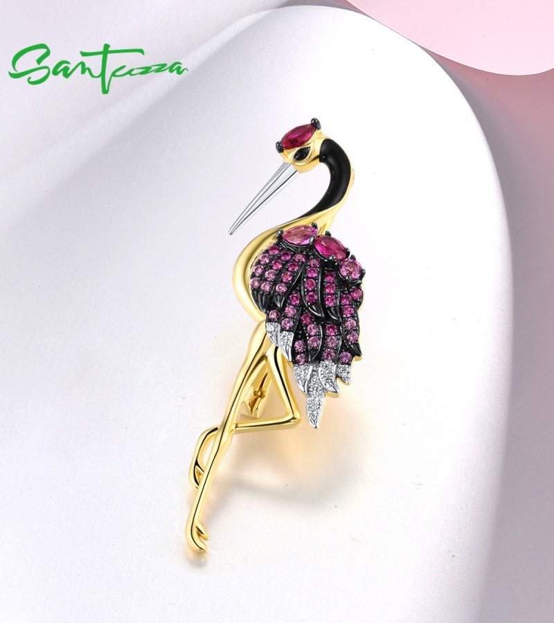 SANTUZZA 925 Sterling Silver Brooch Created Pink Sapphire Ruby Flamingo Bird Animal Jewelry