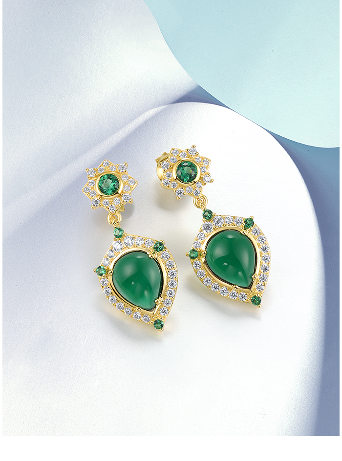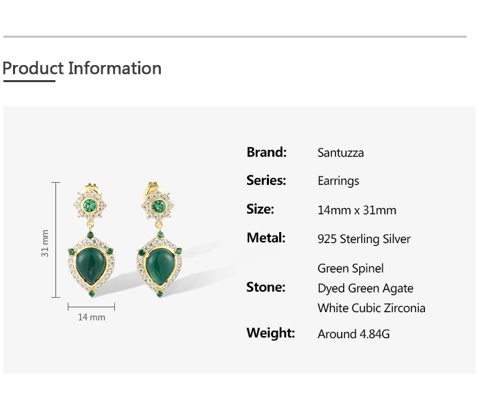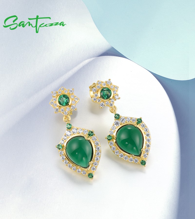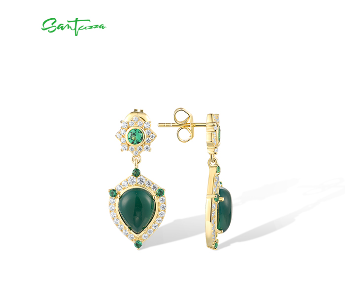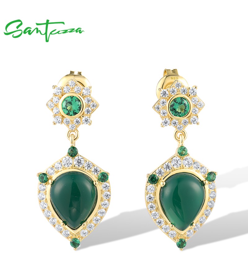 SANTUZZA 925 Sterling Silver Earrings White CZ Dyed Green Agate Jewelry