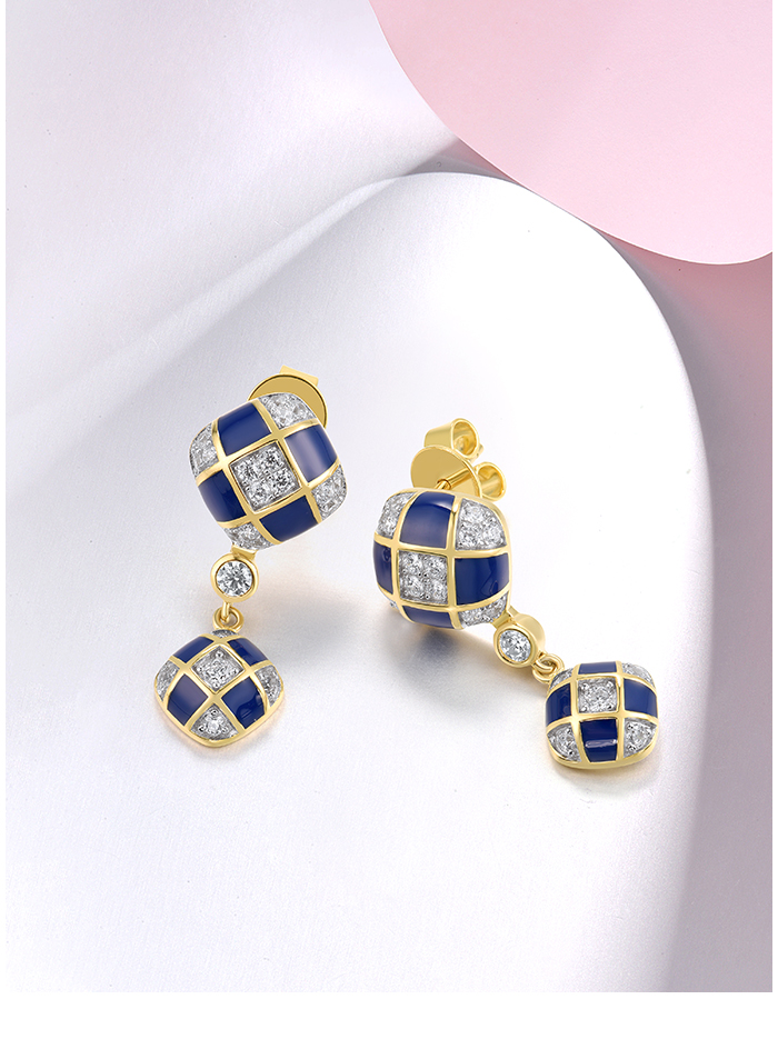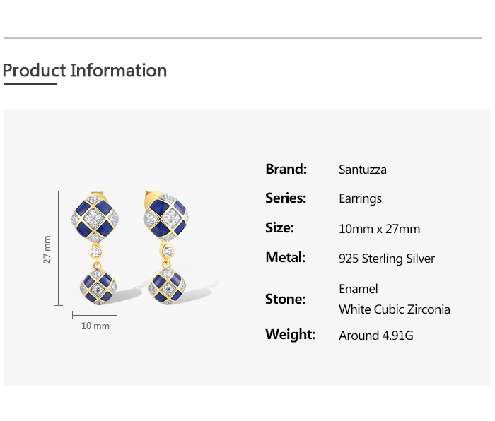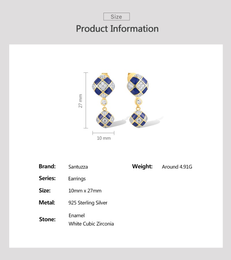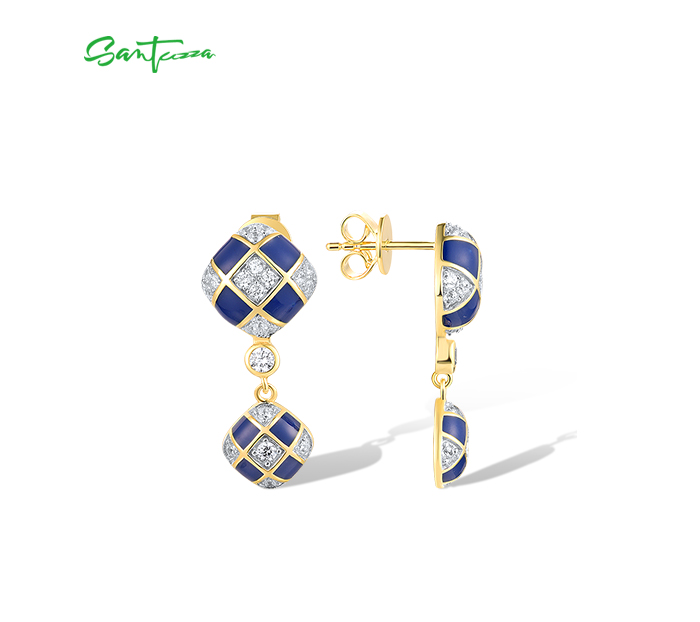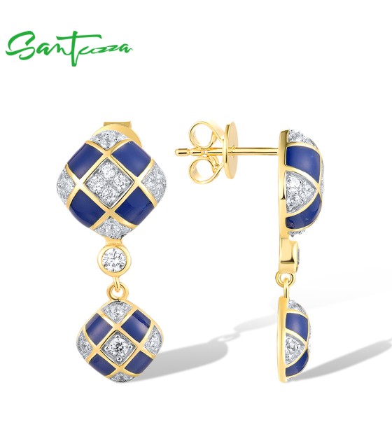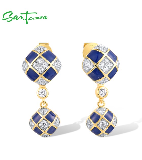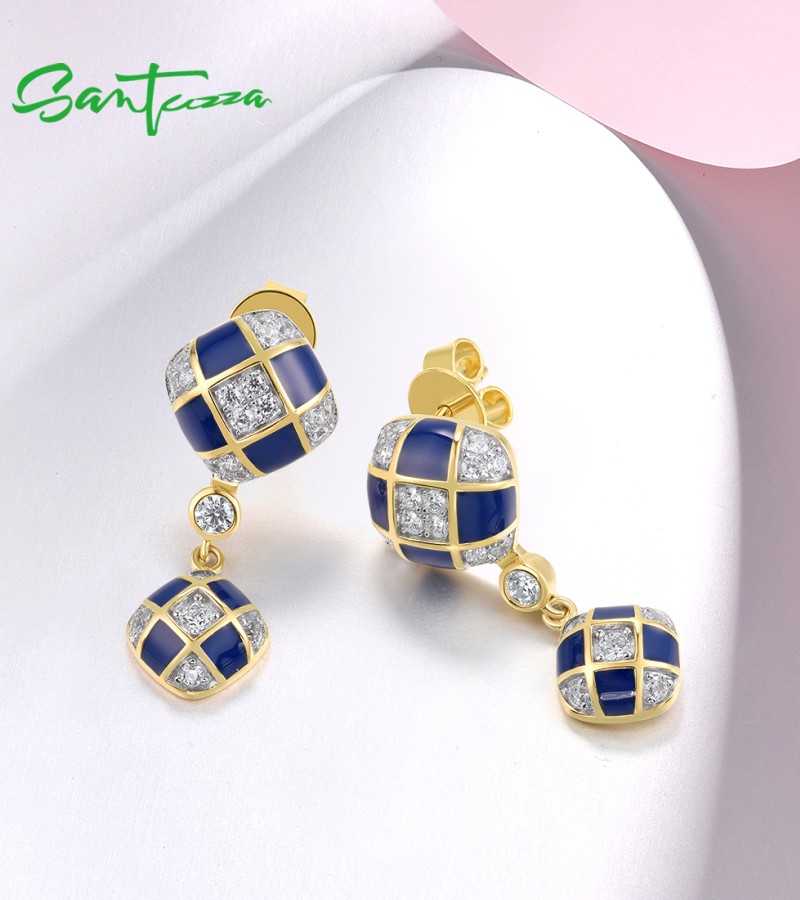 SANTUZZA 925 Sterling Silver Drop Earrings White CZ Blue Square Grid Enamel Jewelry