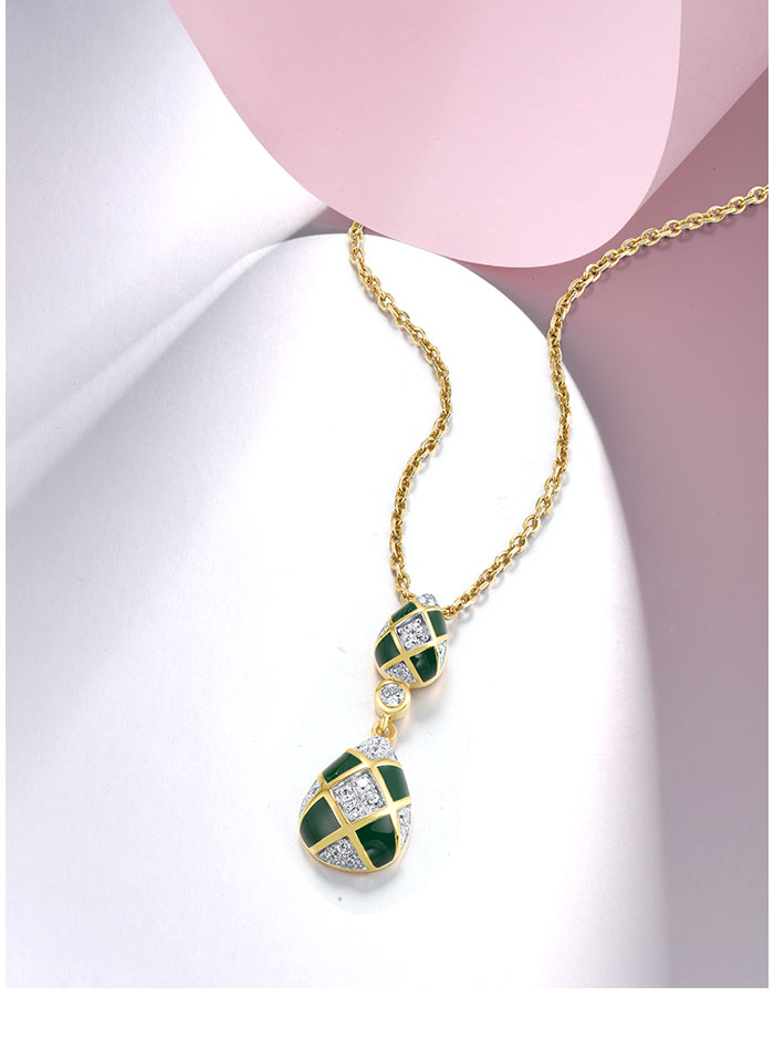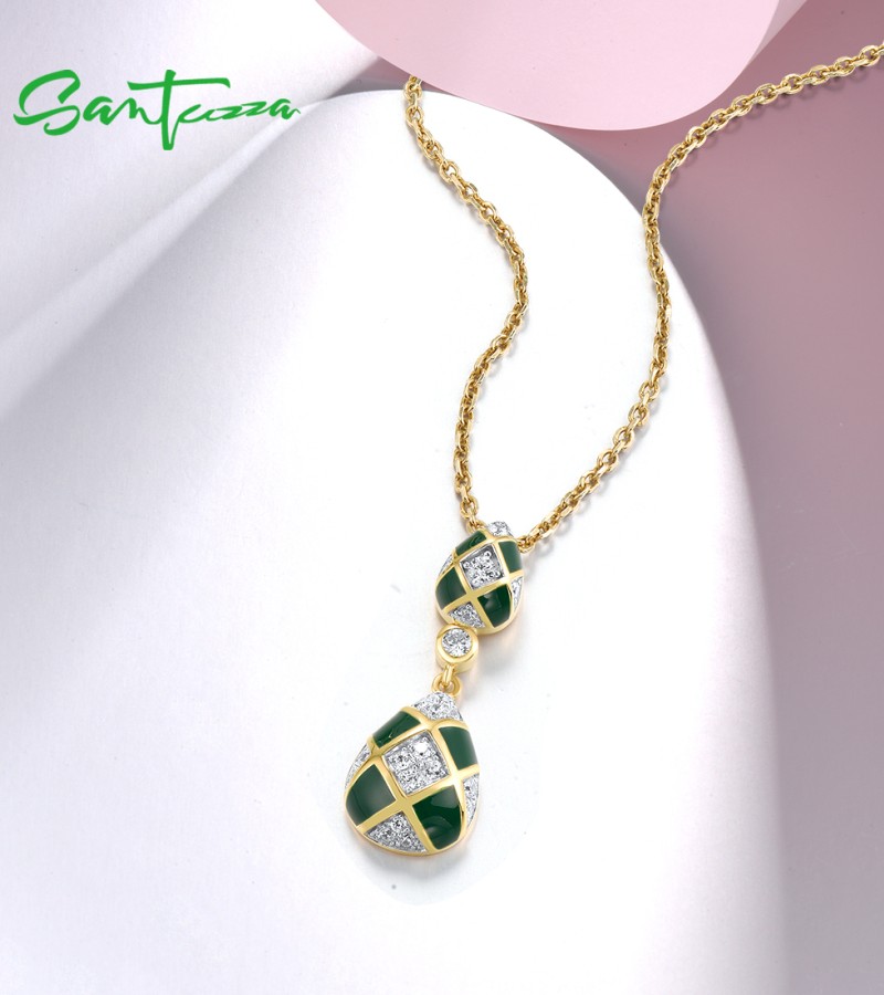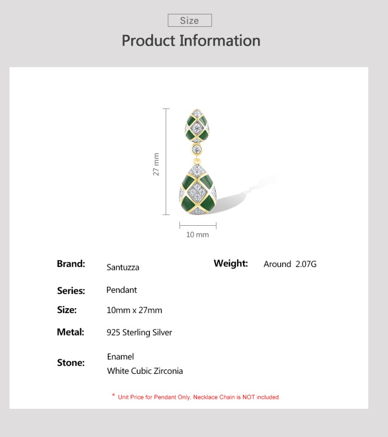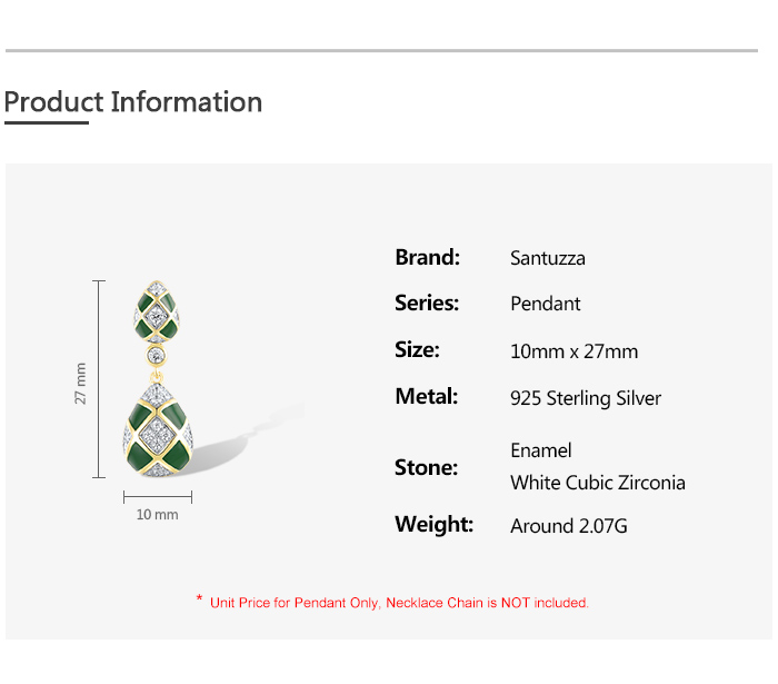 SANTUZZA 925 Sterling Silver Pendant White CZ Green Pear Grid Enamel Jewelry