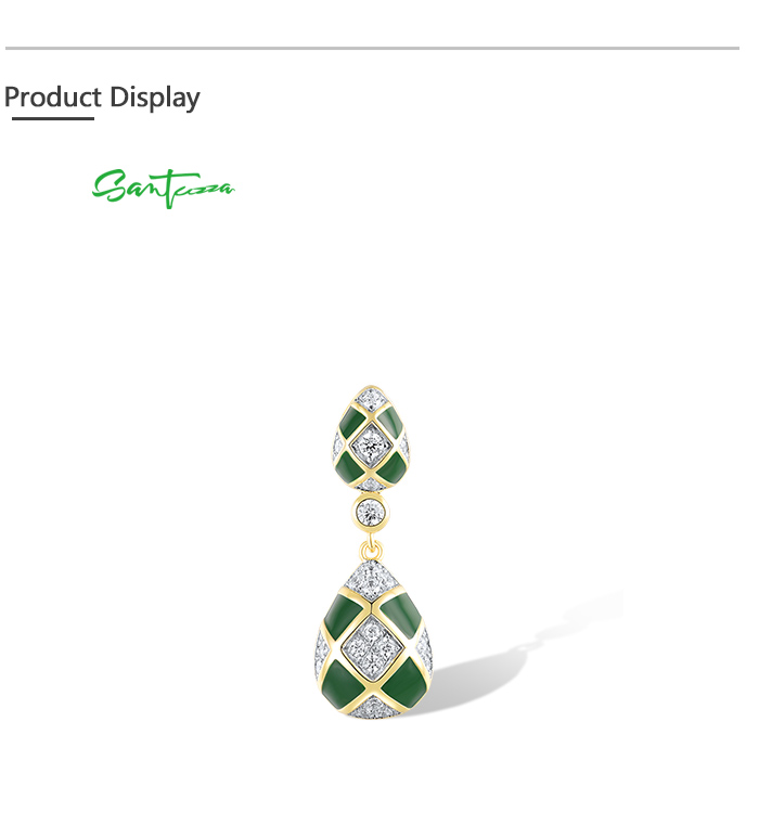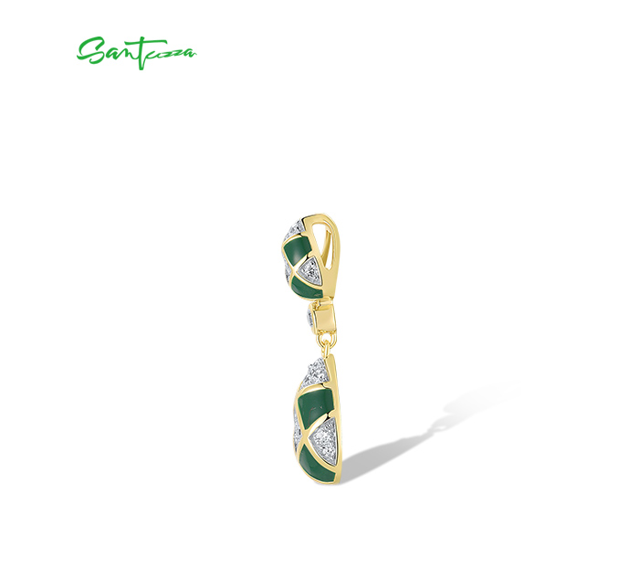SANTUZZA 925 Sterling Silver Stud Earrings White CZ Green Pear Enamel Grid Jewelry