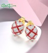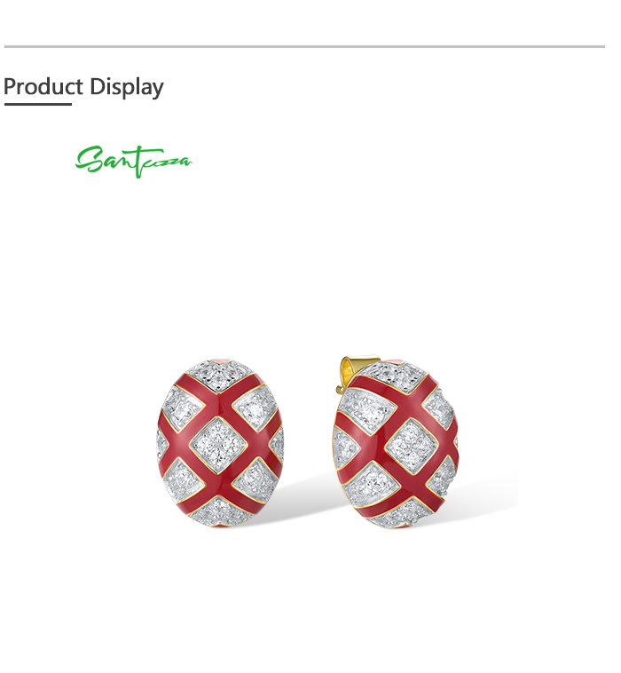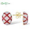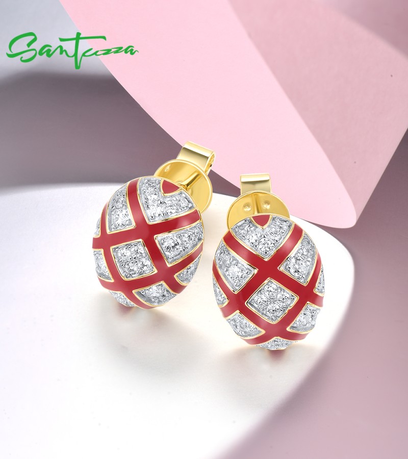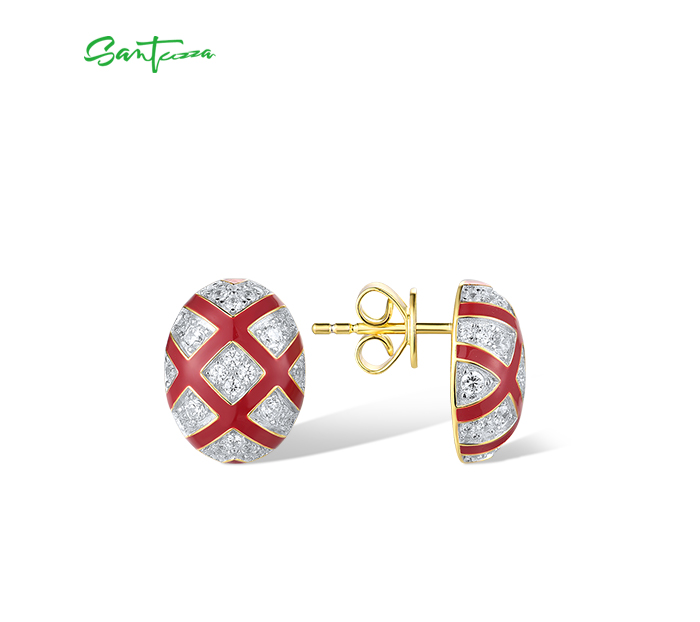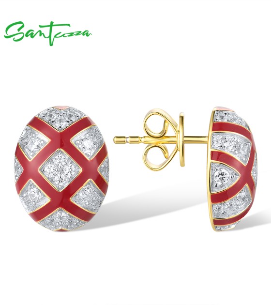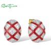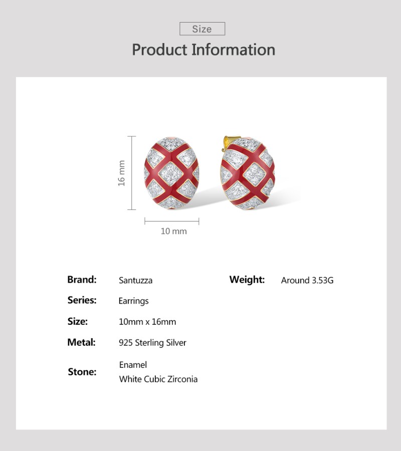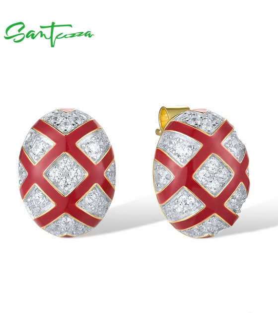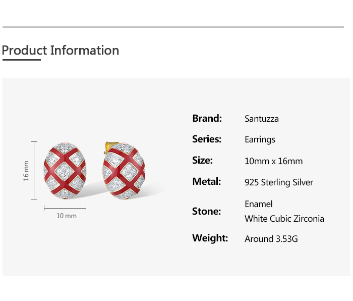 SANTUZZA 925 Sterling Silver Stud Earrings White CZ Red Cross Oval Enamel Jewelry