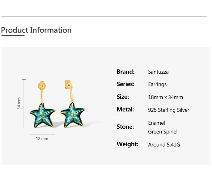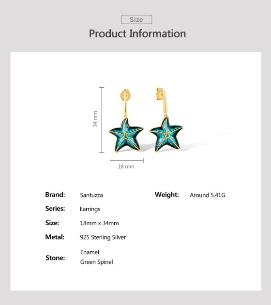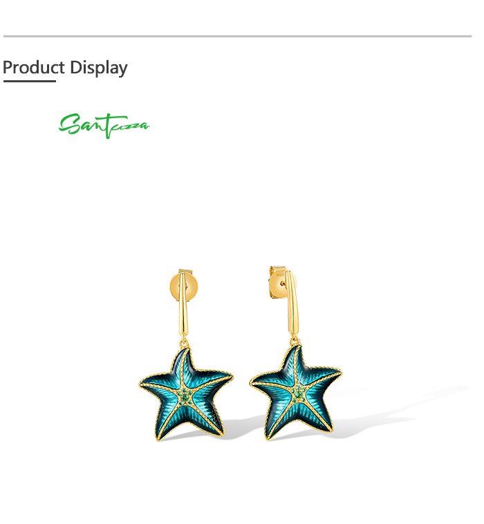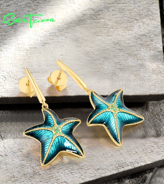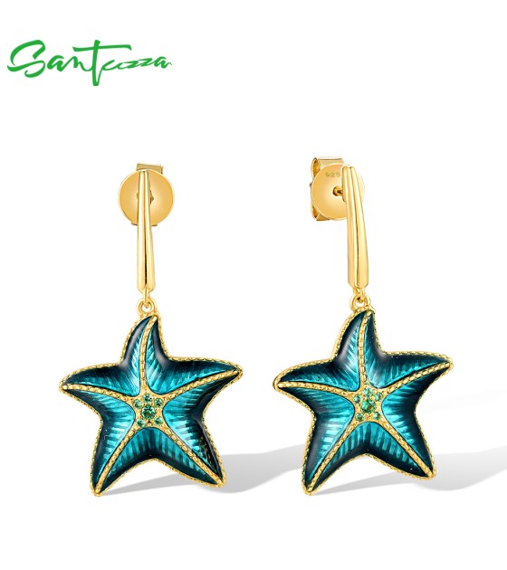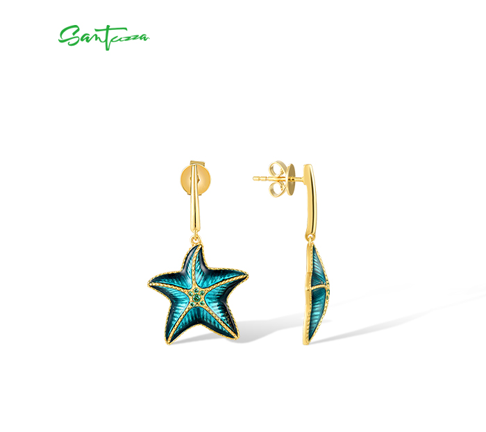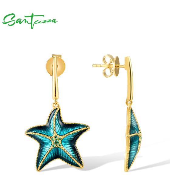SANTUZZA Real 925 Sterling Silver Stud Earrings Green Spinel Enamel Star Fish Summer New Jewelry
