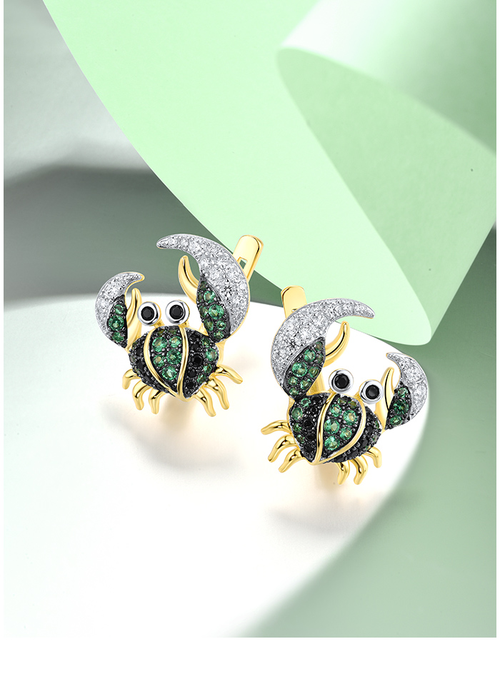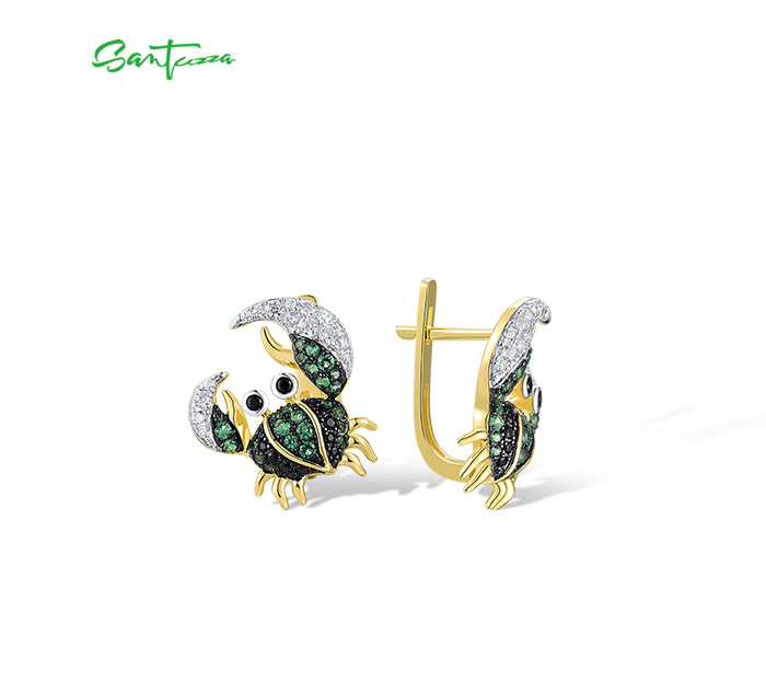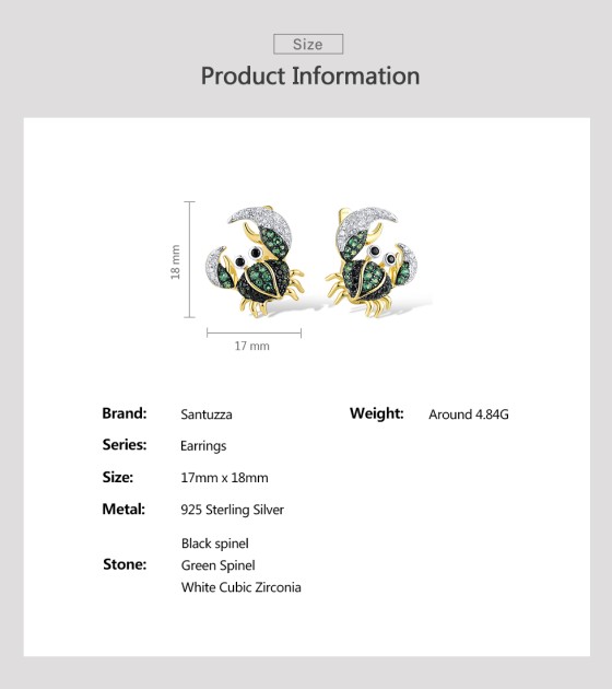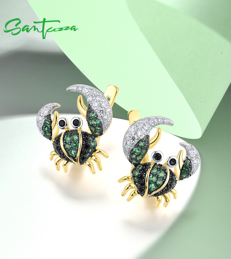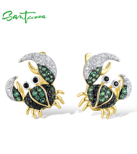 SANTUZZA 925 Sterling Silver Earrings Green Black Spinel Crab Latch Back Animal Jewelry