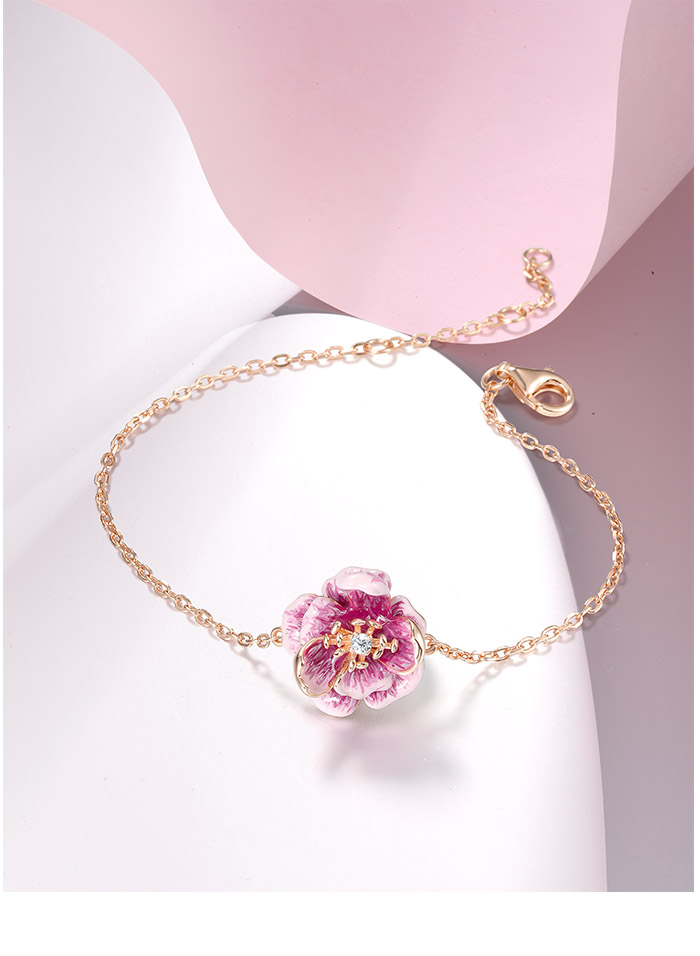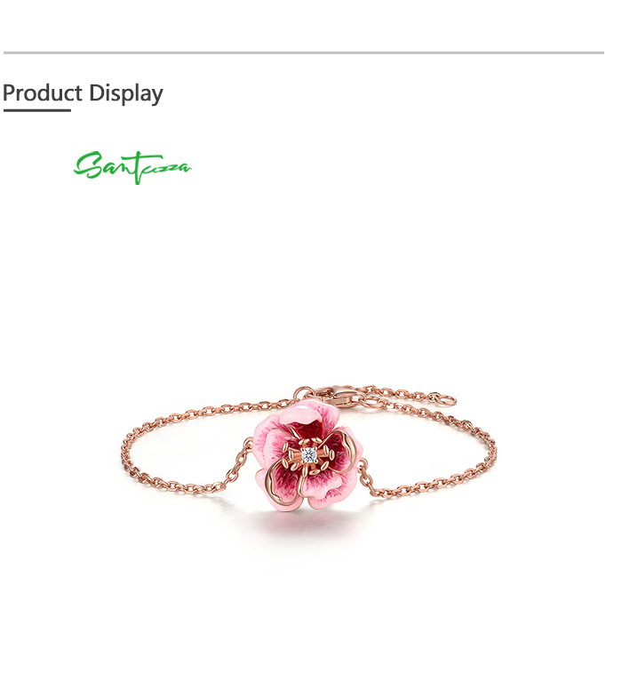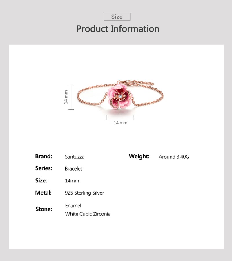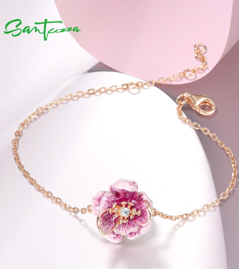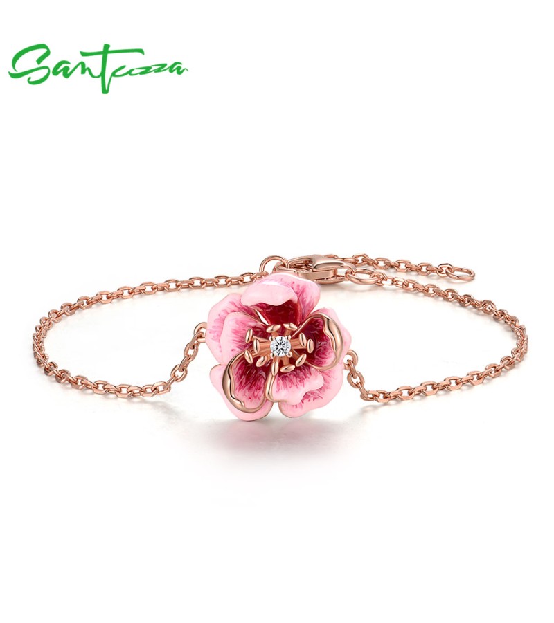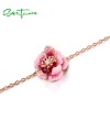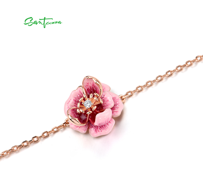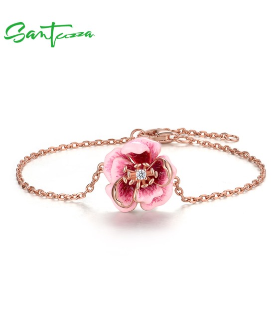 SANTUZZA 925 Sterling Silver Adjustable Bracelet Pink Enamel Flower Jewelry