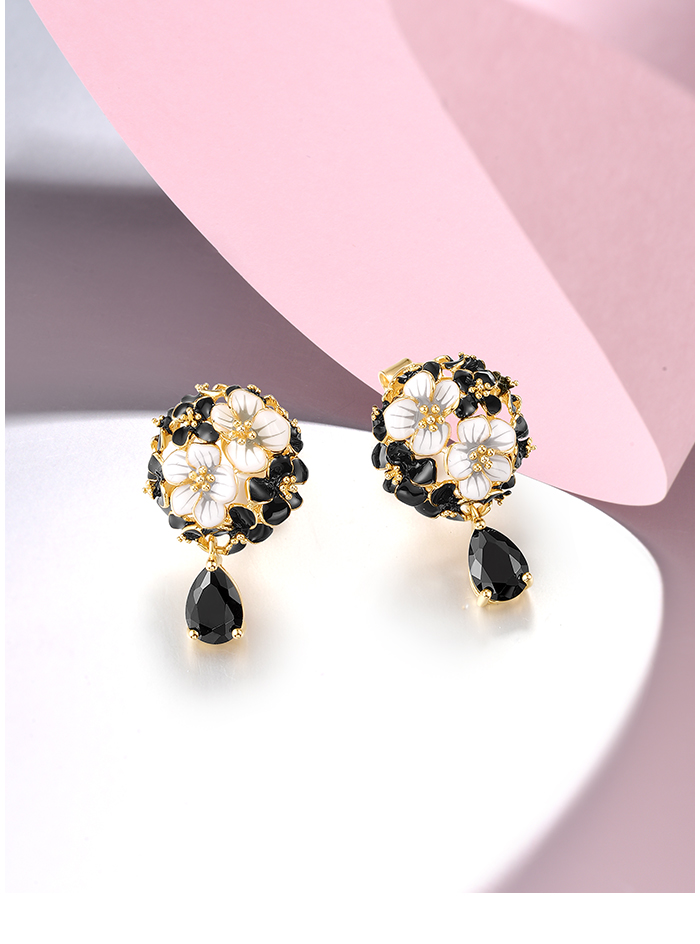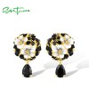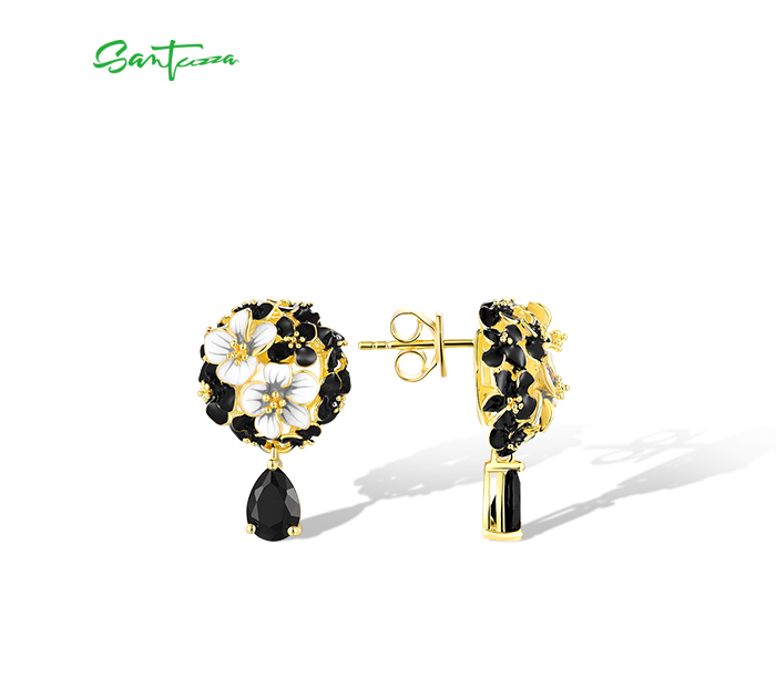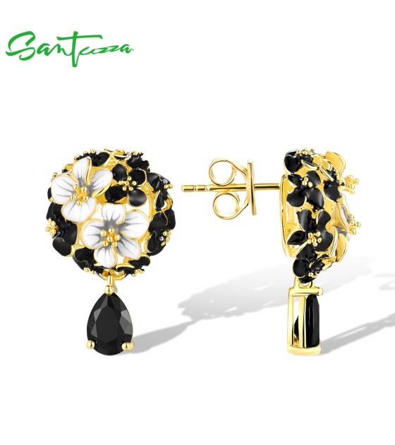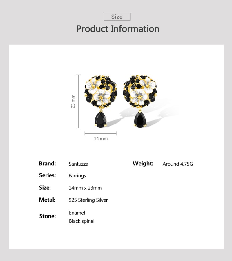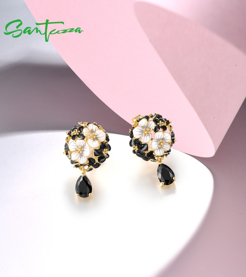 SANTUZZA 925 Sterling Silver Drop Earrings White&Black Flower Enamel Jewelry