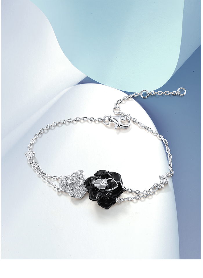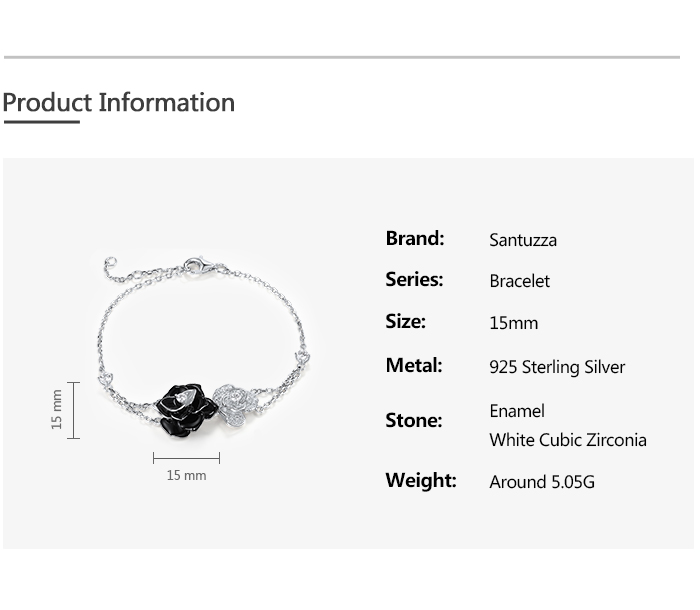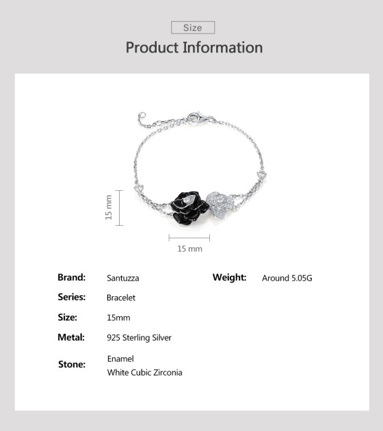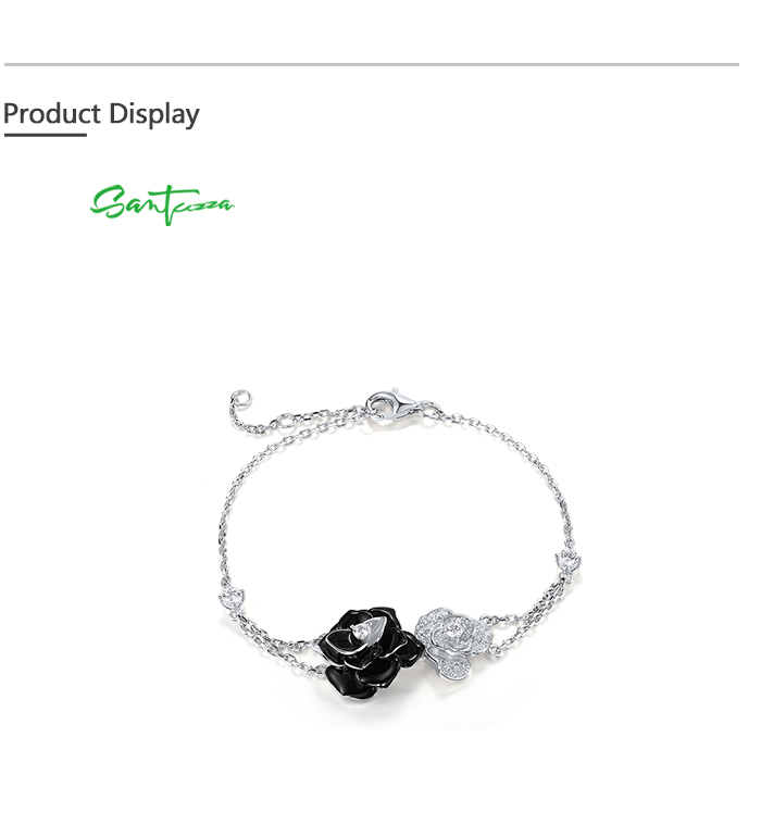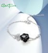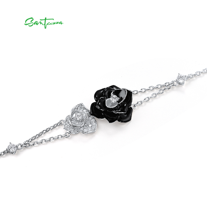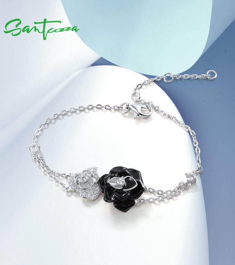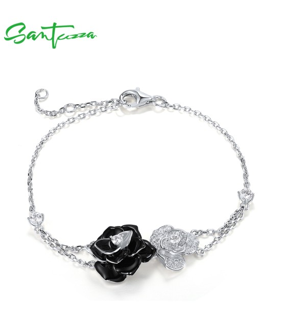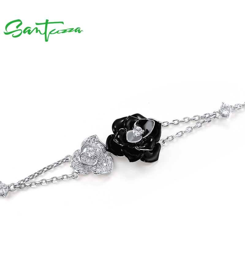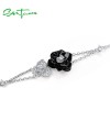 SANTUZZA 925 Sterling Silver Adjustable Bracelet Vintage Black & White Flower Jewelry Enamel