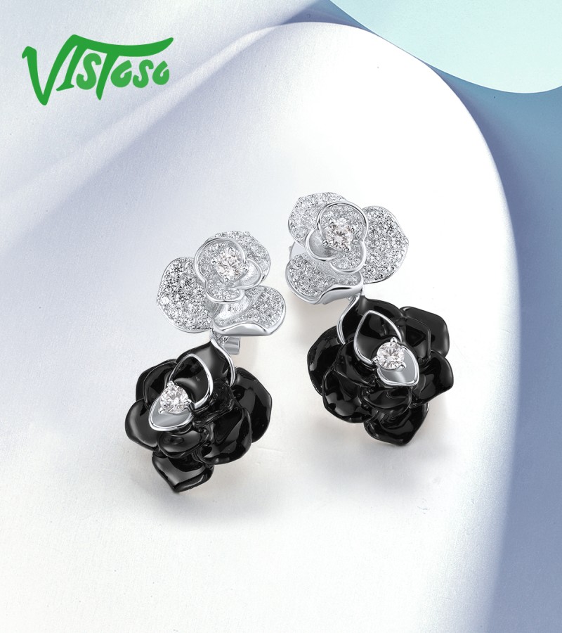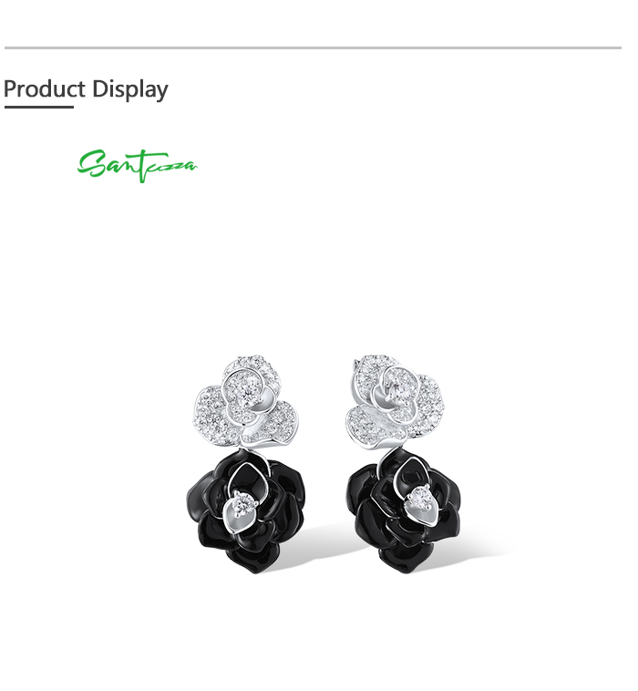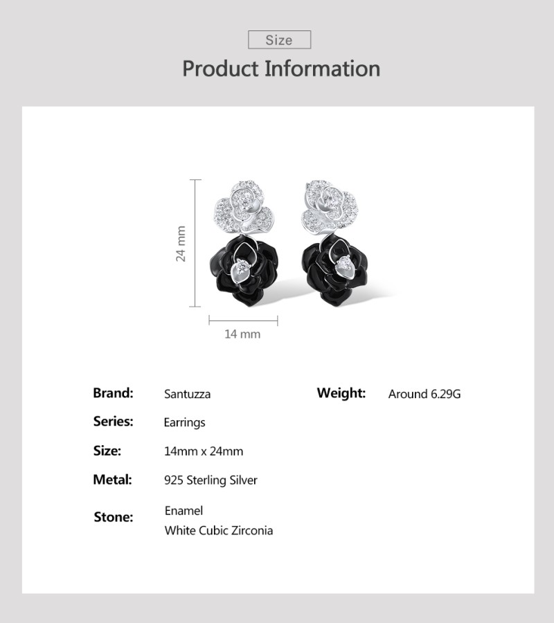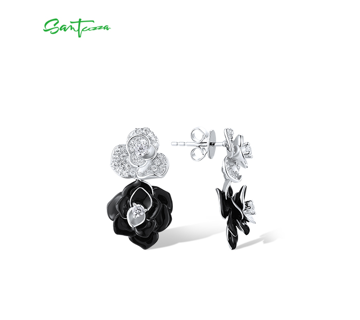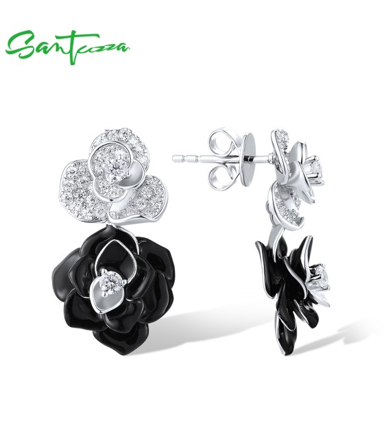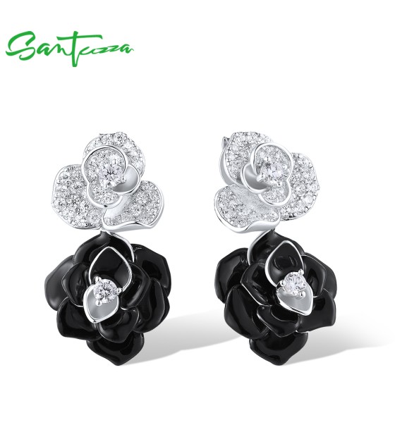 SANTUZZA 925 Sterling Silver Drop Earrings White CZ Elegant Black&White Flower Enamel Jewelry