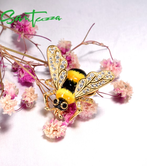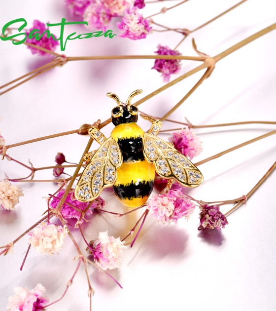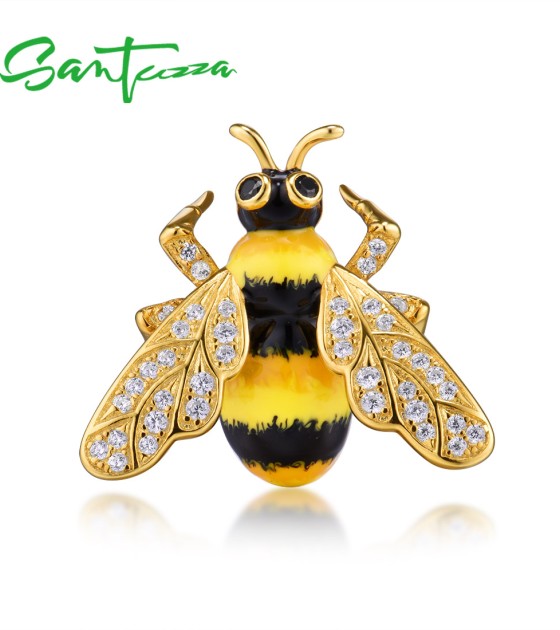 SANTUZZA 925 Sterling Silver Brooch Chic Gold Color Yellow Bee брошь насекомое Jewelry Enamel