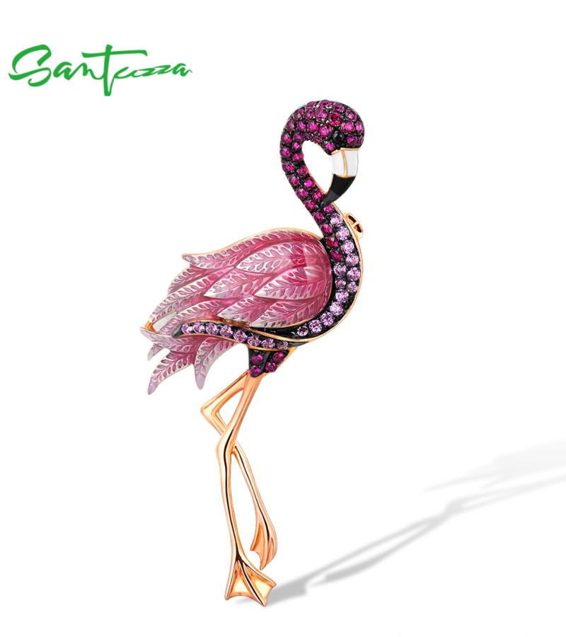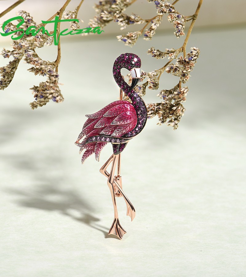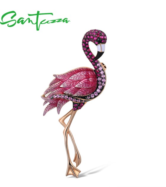 SANTUZZA Silver Brooch 925 Sterling Silver Rose Gold Color Flamingo Bird Animal Jewelry Enamel