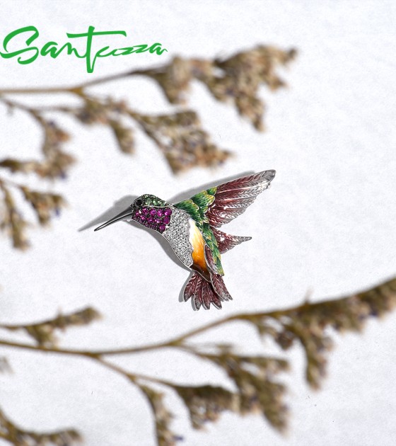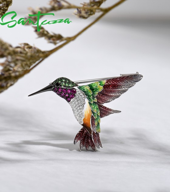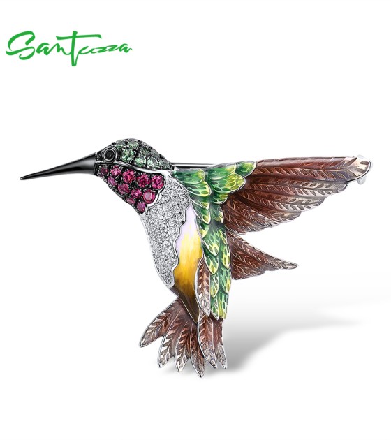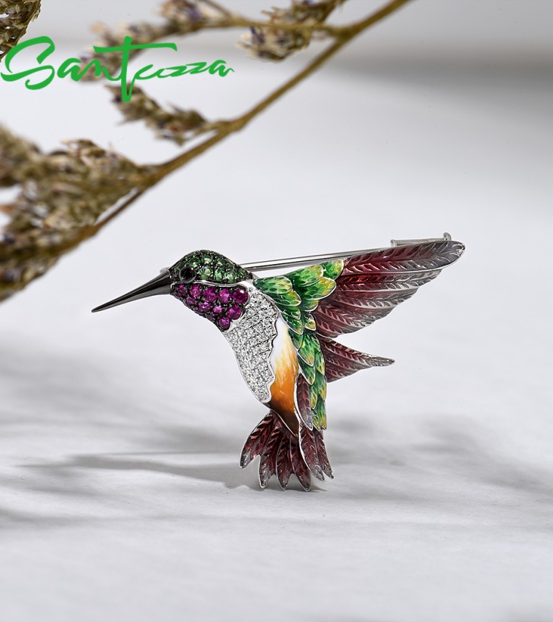 SANTUZZA Silver Brooch Pure 925 Sterling Silver Colorful Hummingbird Animal Jewelry Enamel