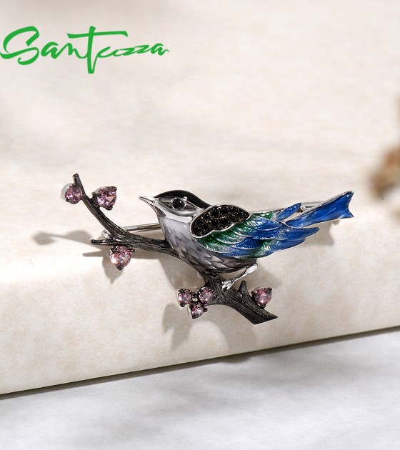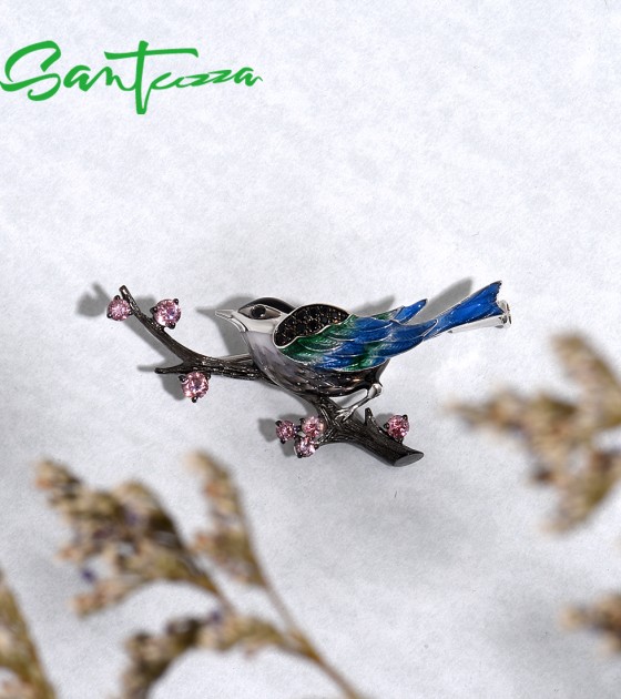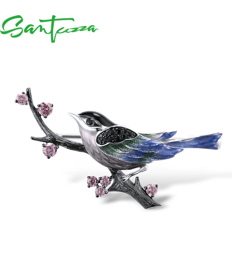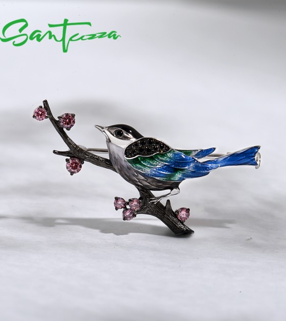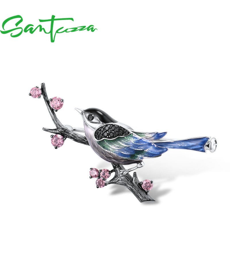 SANTUZZA Silver Brooch 925 Sterling Silver Lovely Magpie Birds Animal Jewelry Enamel