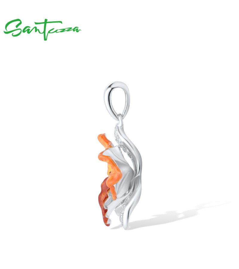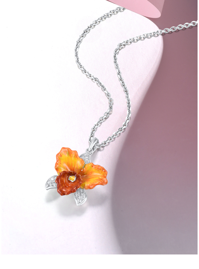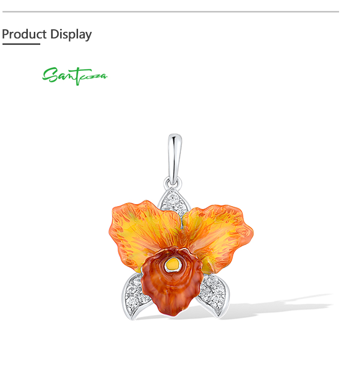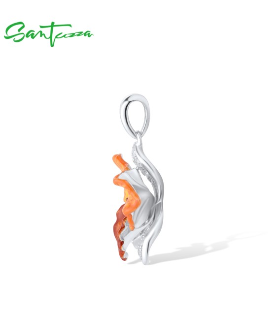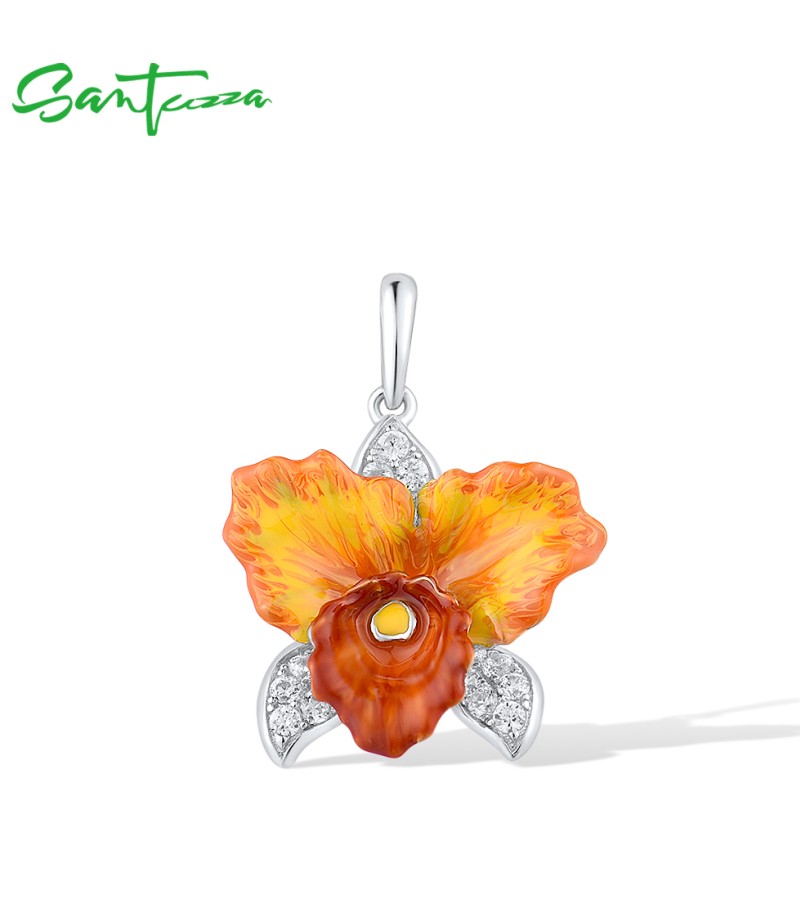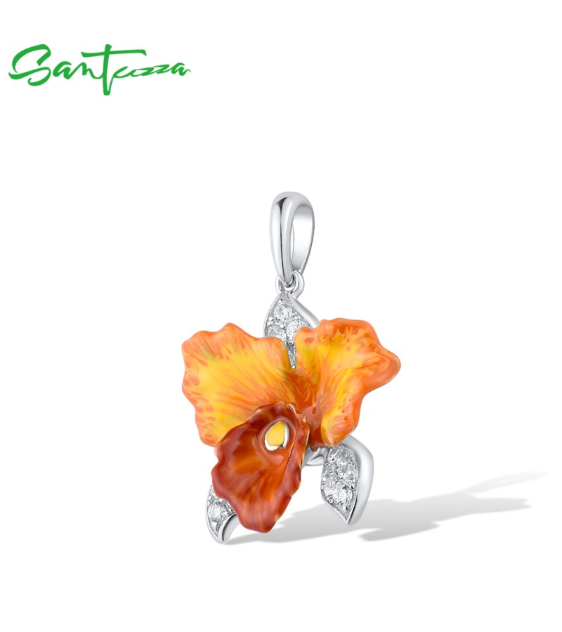 SANTUZZA 925 Sterling Silver Pendant Sparkling Orange Orchid Flower Jewelry Enamel