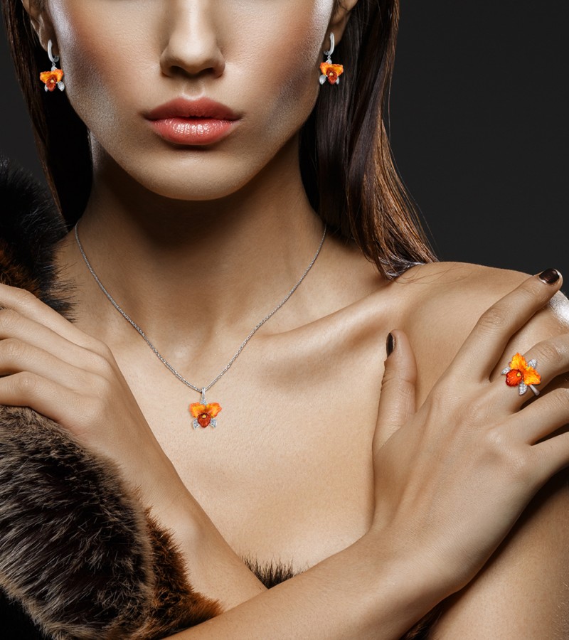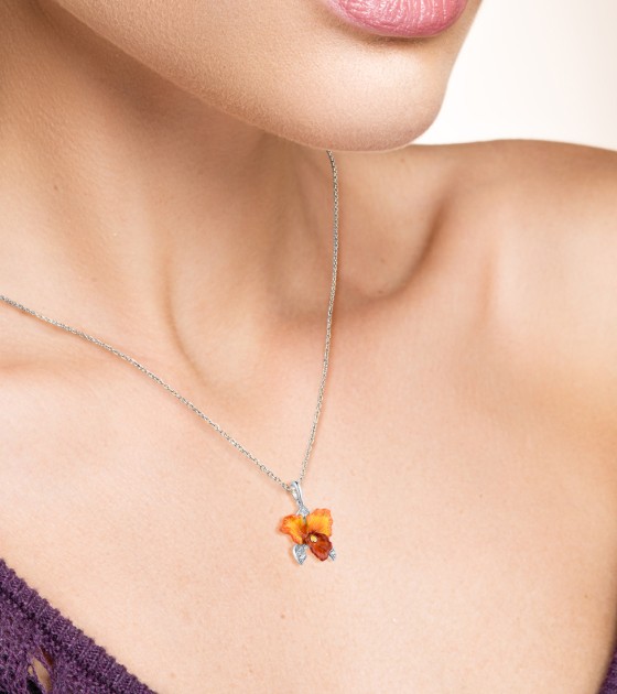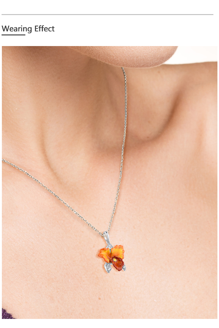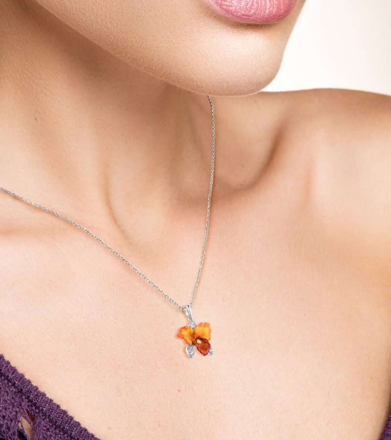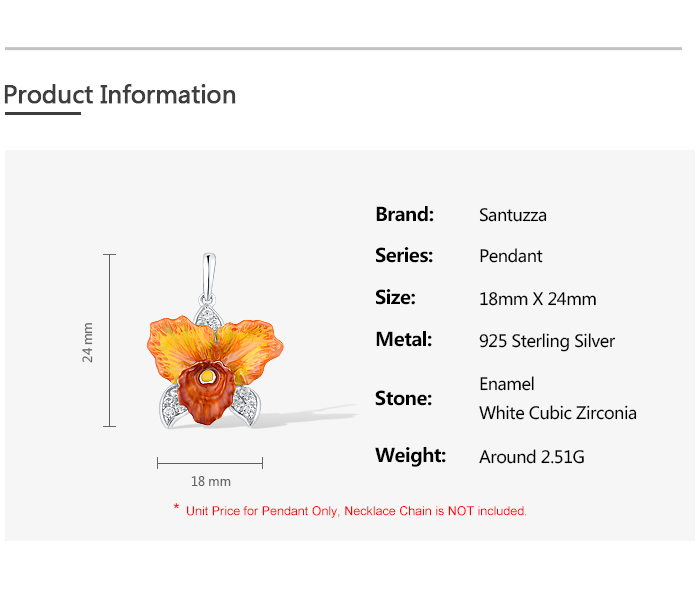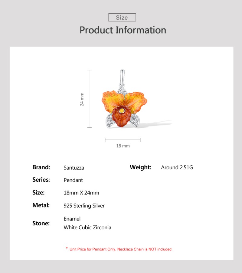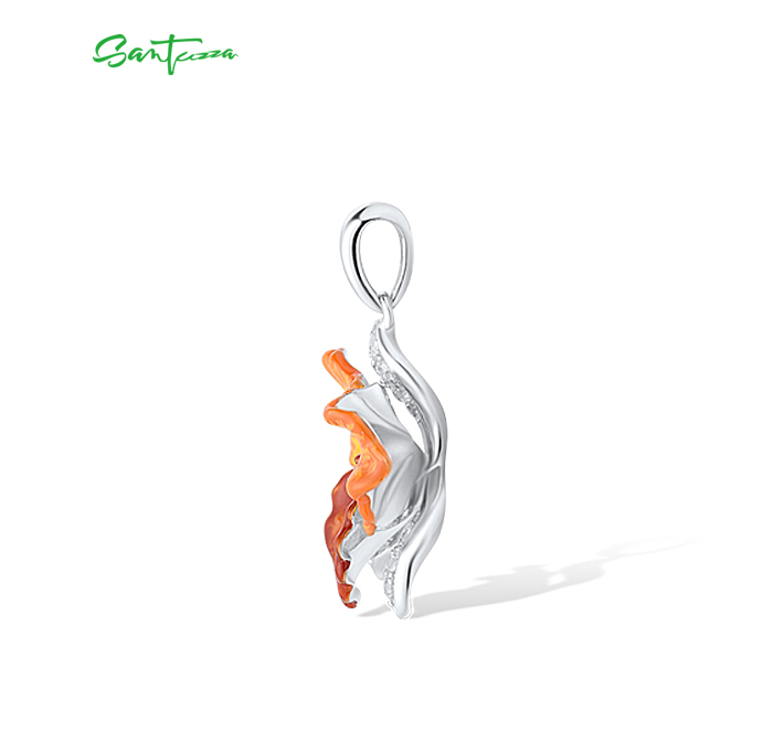SANTUZZA 925 Sterling Silver Pendant Sparkling Orange Orchid Flower Jewelry Enamel
