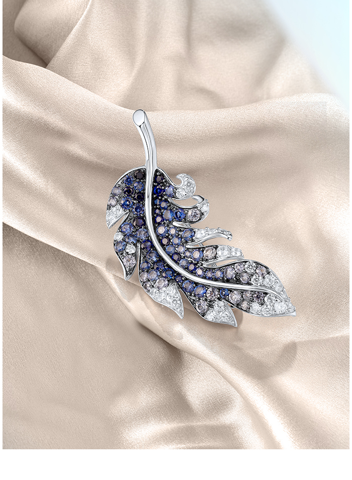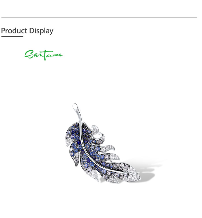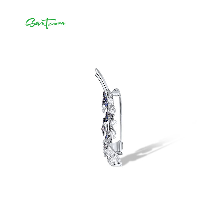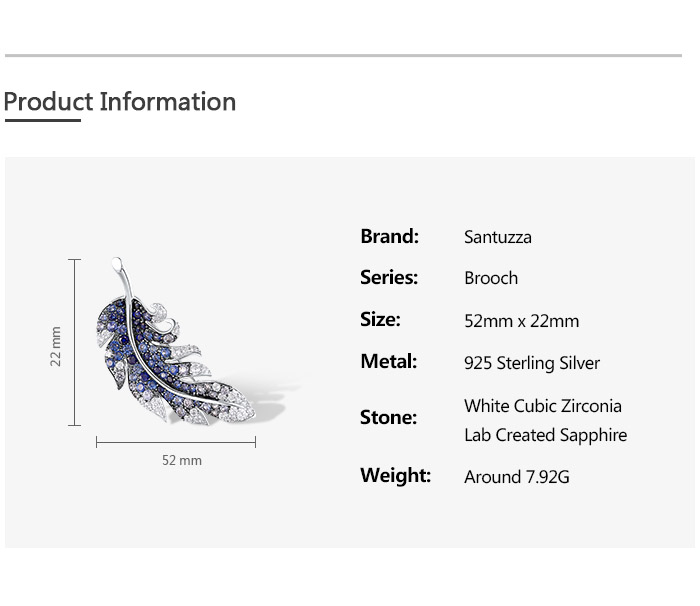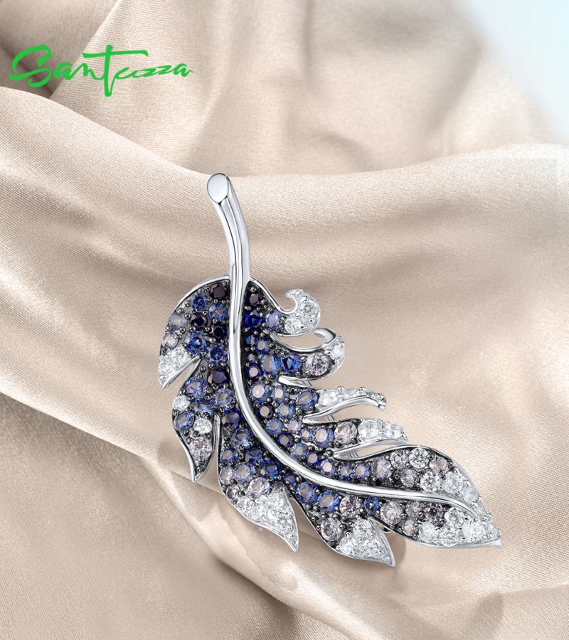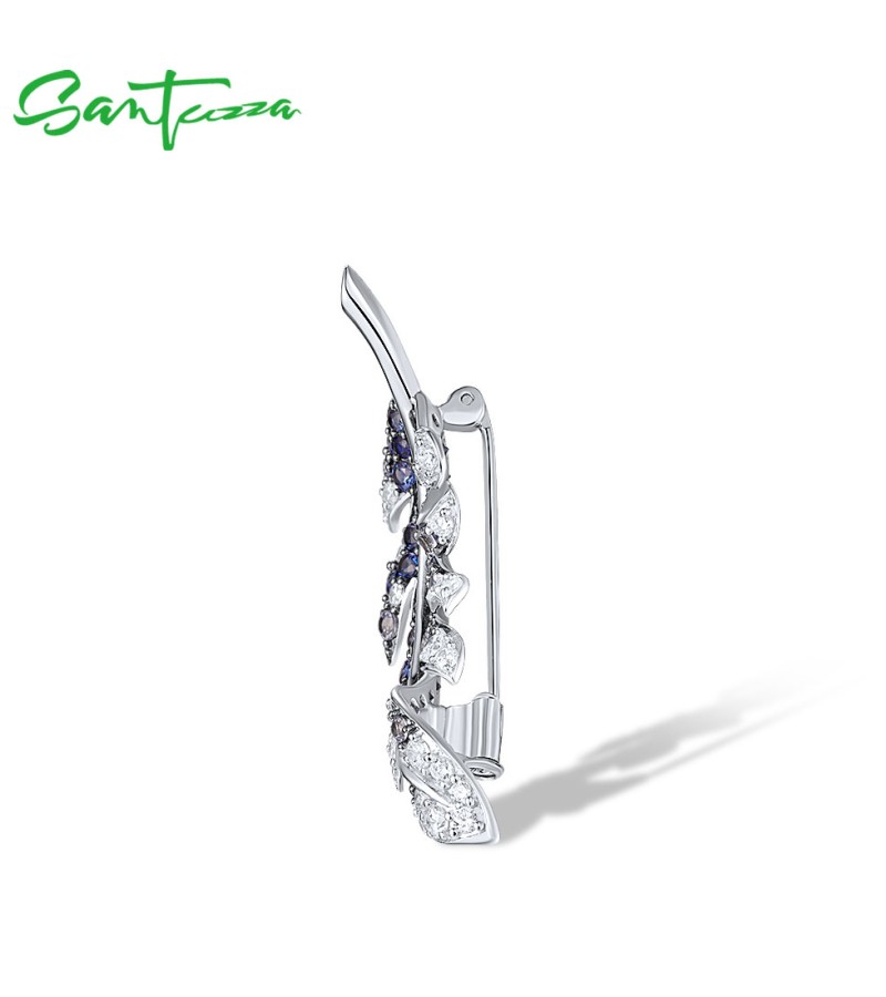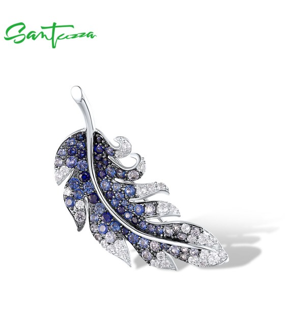 SANTUZZA 925 Sterling Silver Brooch Created Blue Sapphire Elegant Feather Jewelry