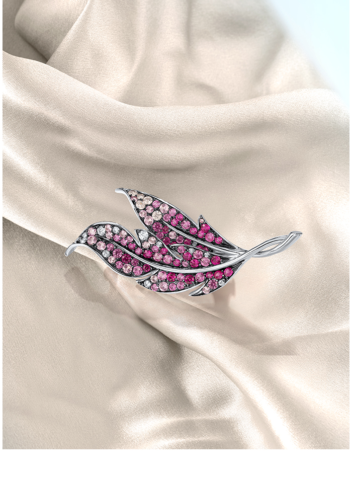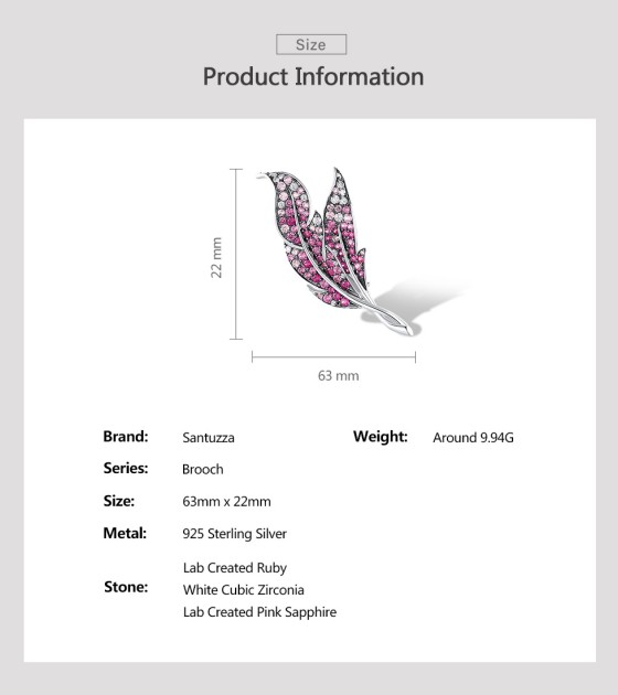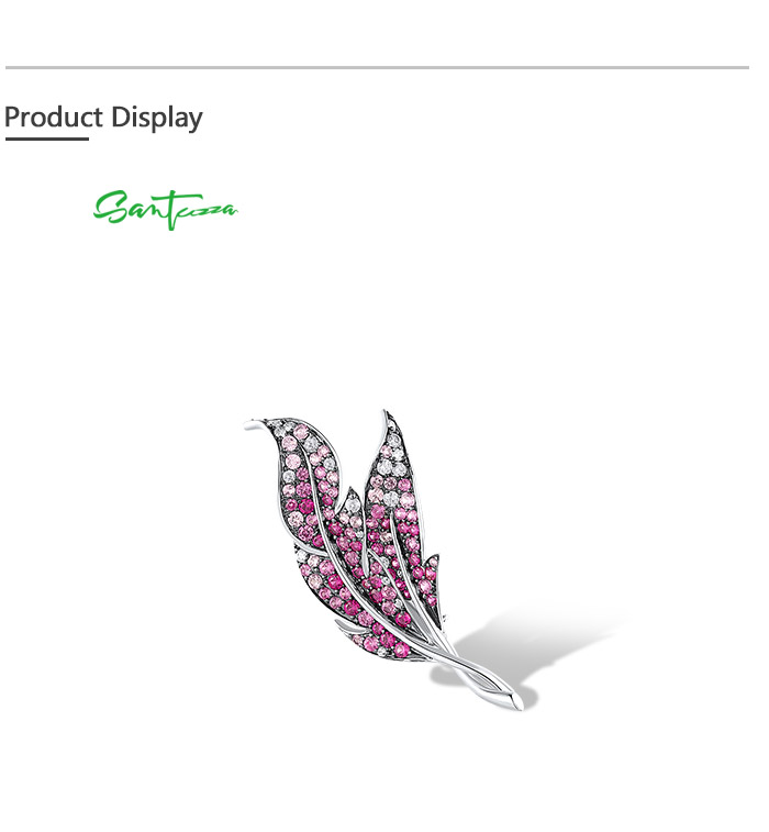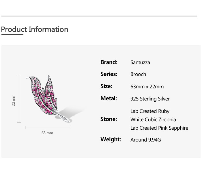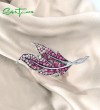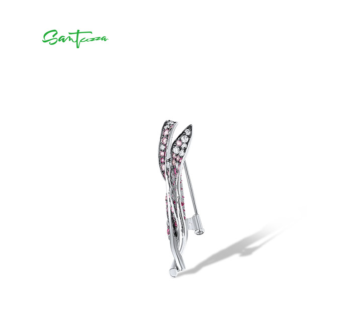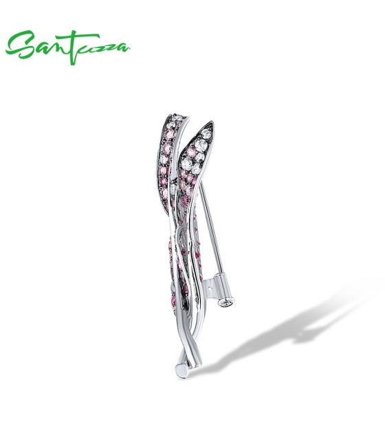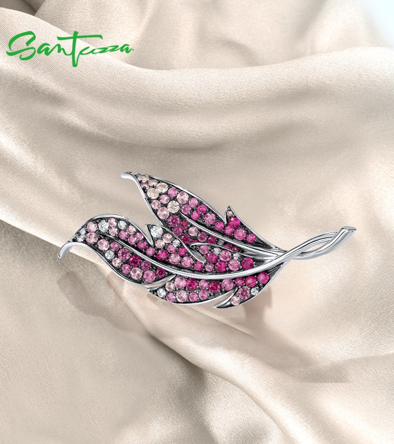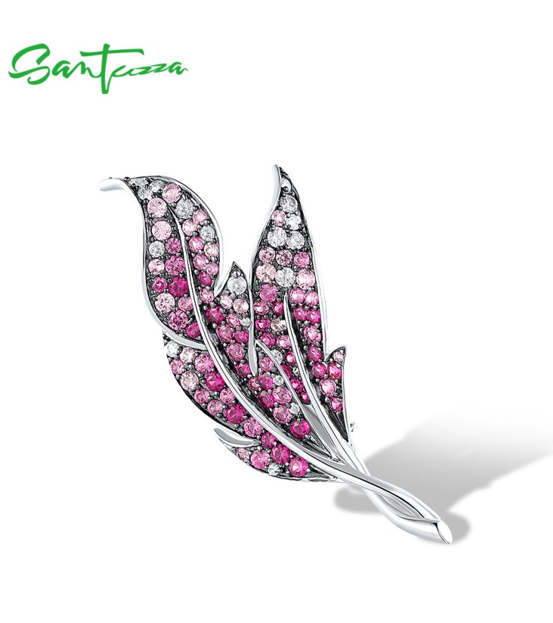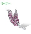 SANTUZZA 925 Sterling Silver Brooch Created Pink Sapphire Fantastic Feather Jewelry