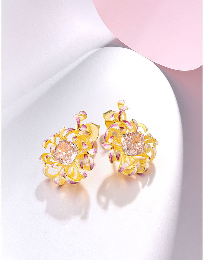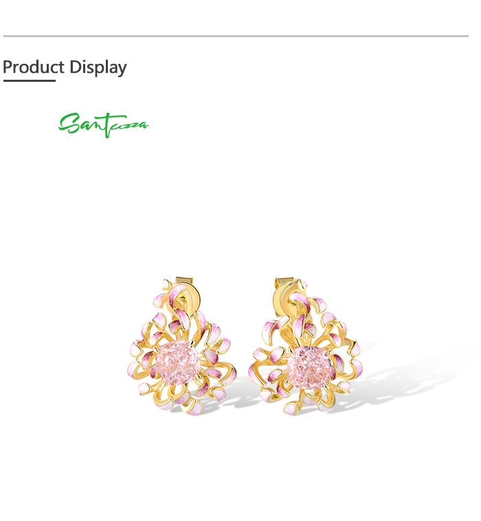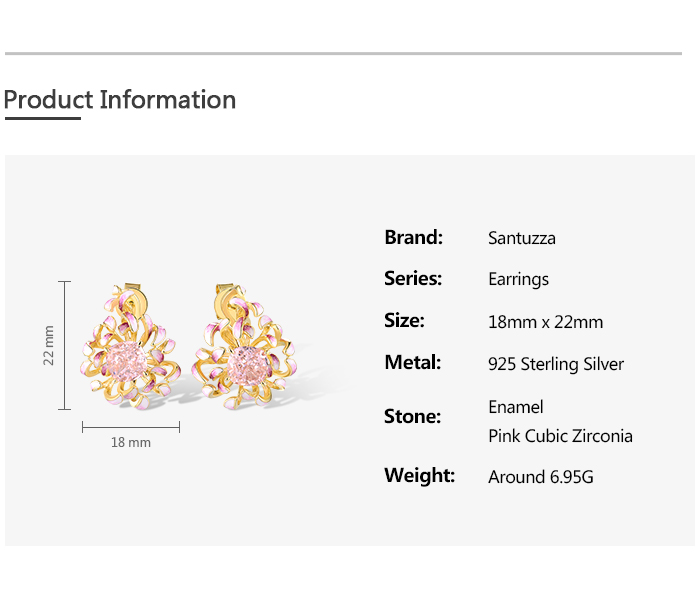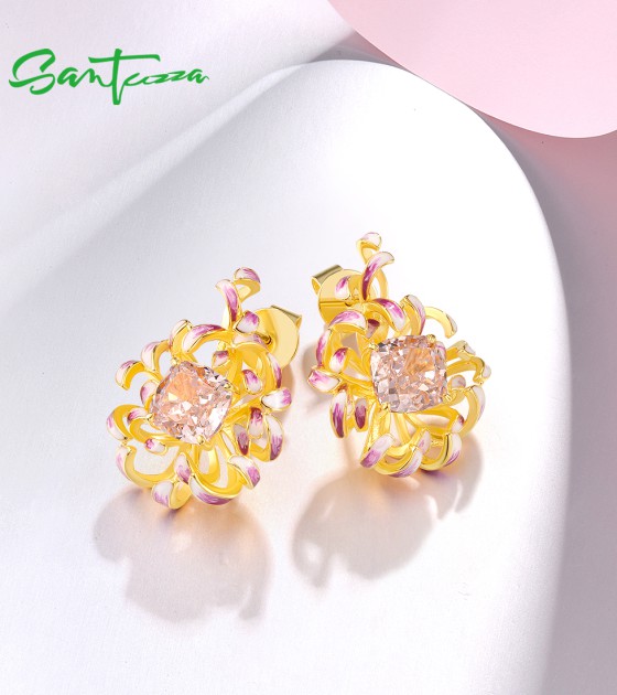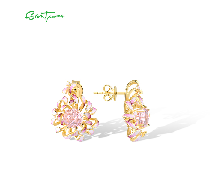 SANTUZZA 925 Sterling Silver Earrings Pink Cubic Zirconia Cornflower Enamel Jewelry
