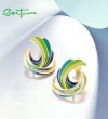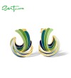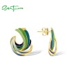 SANTUZZA 925 Sterling Silver Stud Earrings Green Enamel Twisted Pattern Irregular Jewelry