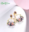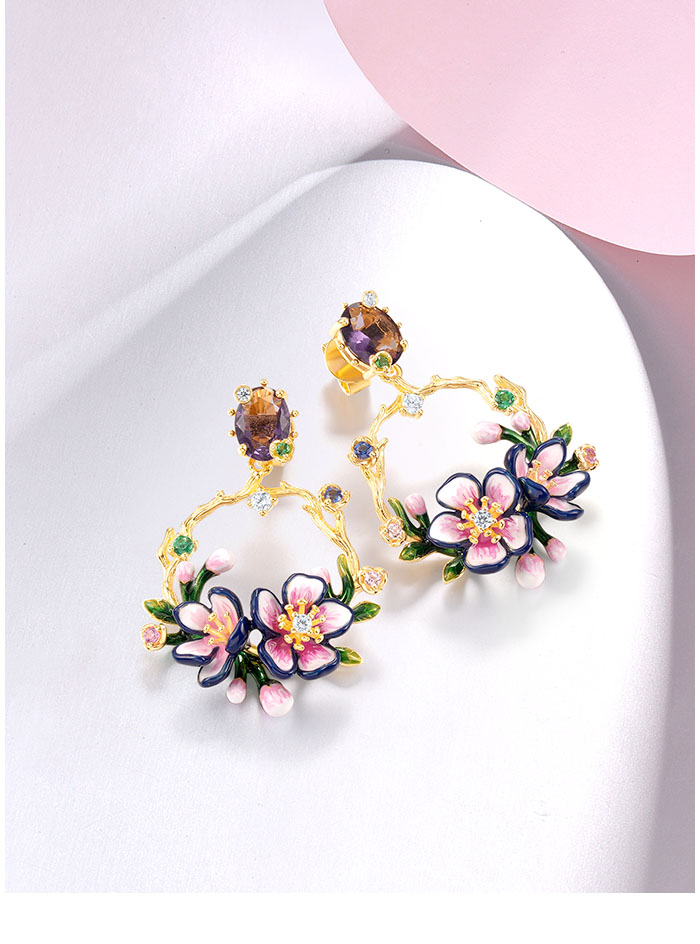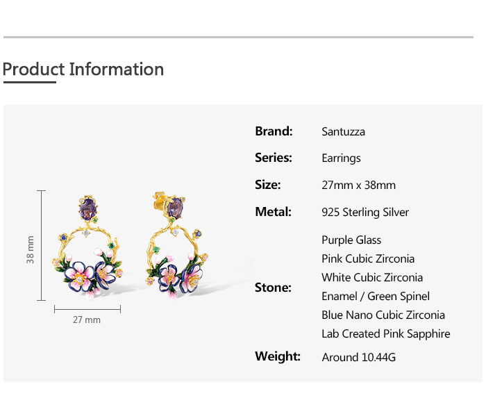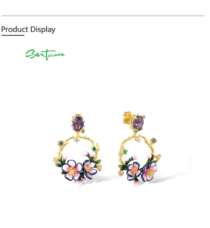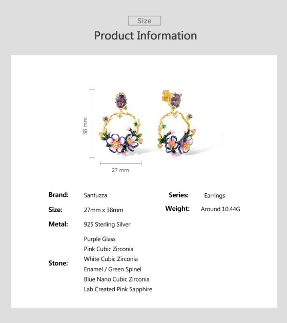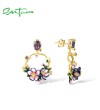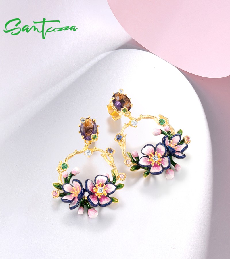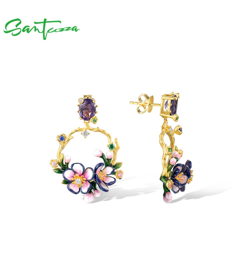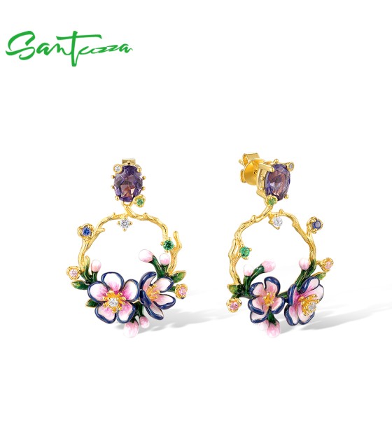 SANTUZZA 925 Sterling Silver Drop Earrings Sparkling Colorful Gems Gorgeous Branch & Purple Enamel Flower Jewelry