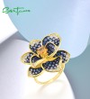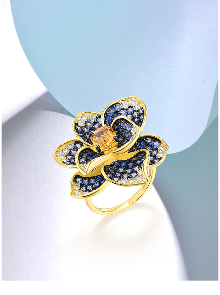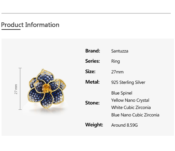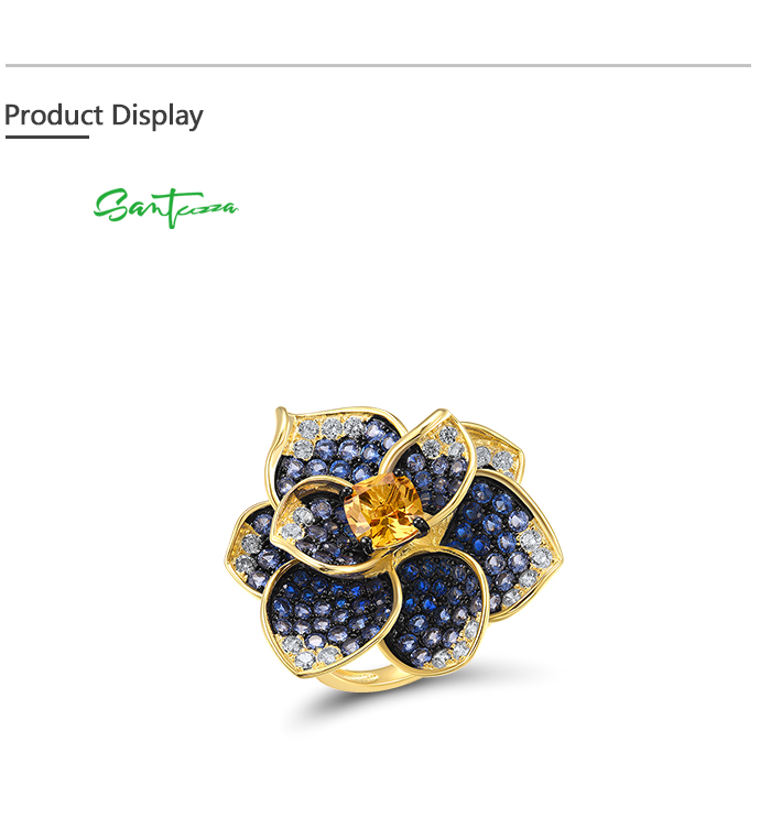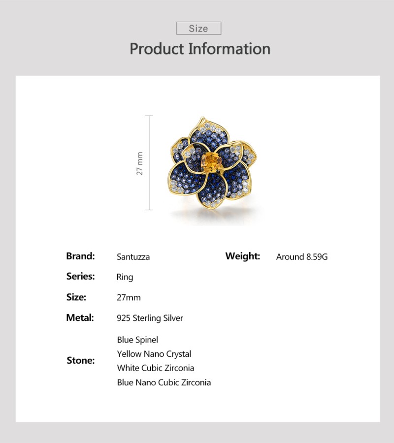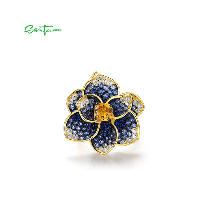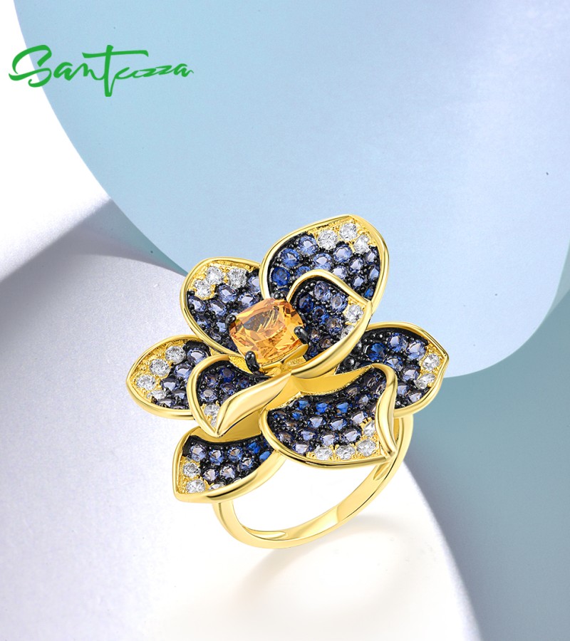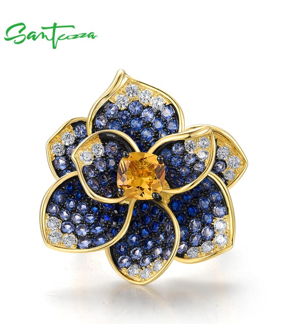 SANTUZZA 925 Sterling Silver Ring Blue Spinel Yellow Crystal Blooming Flower Fine Jewelry