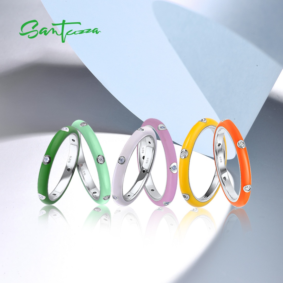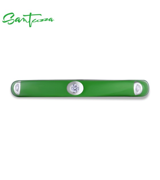 SANTUZZA 925 Sterling Silver White Cubic Zirconia Stackable Ring Jewelry Green Enamel - US 5.5