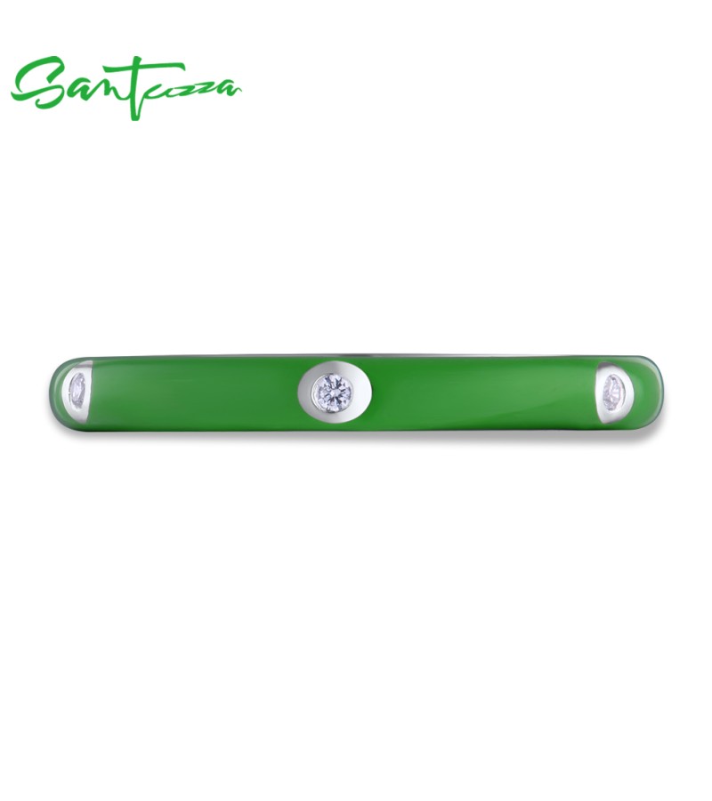 SANTUZZA 925 Sterling Silver White Cubic Zirconia Stackable Ring Jewelry Green Enamel - US 6.5