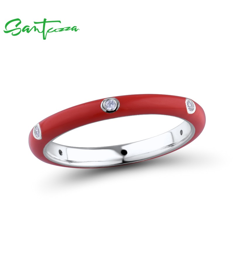 SANTUZZA 925 Sterling Silver White Cubic Zirconia Stackable Ring Jewelry Red Enamel