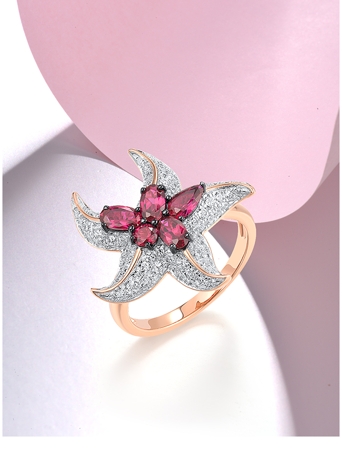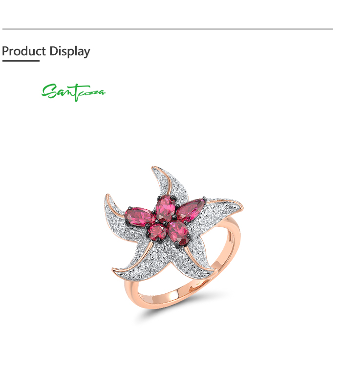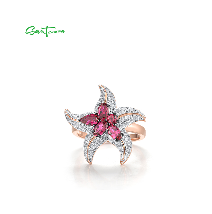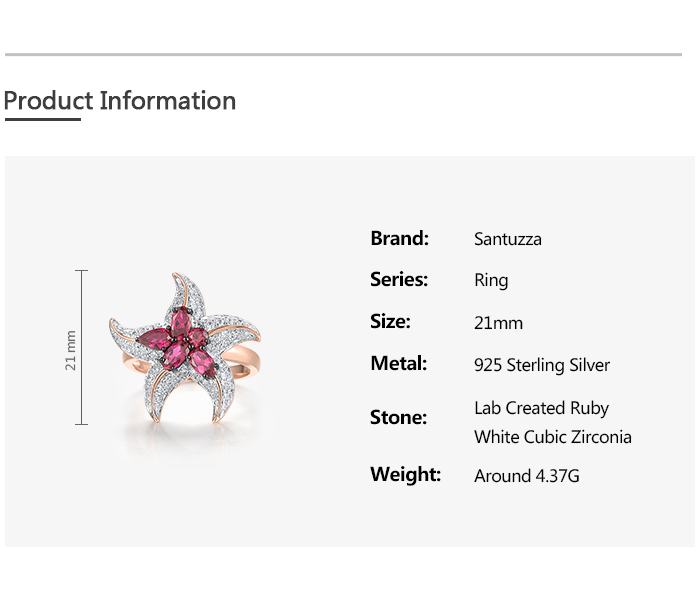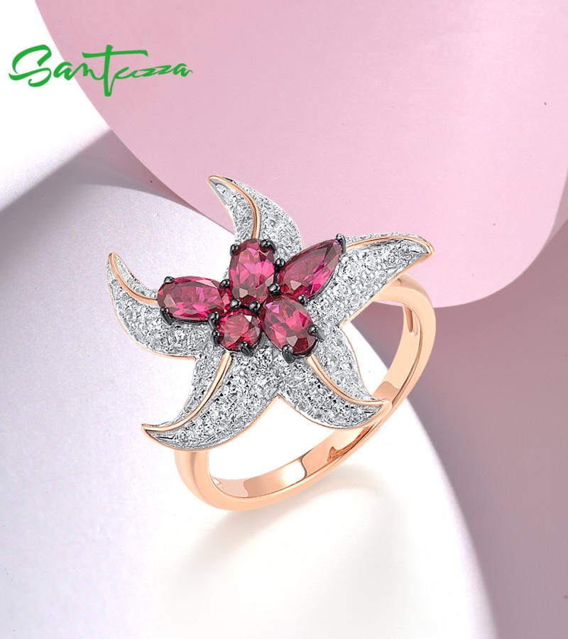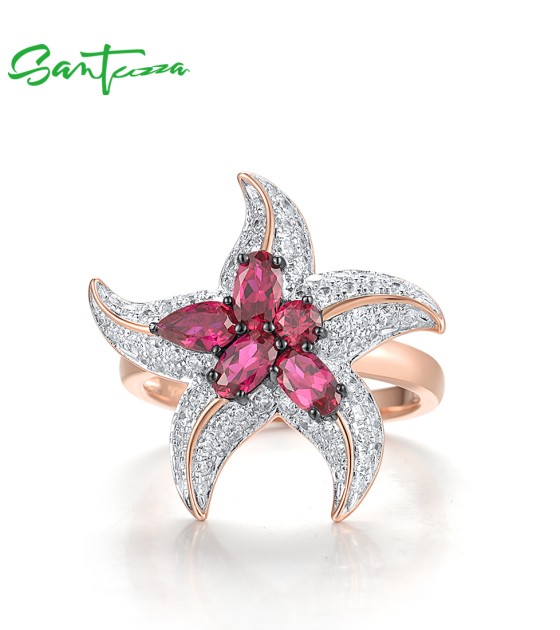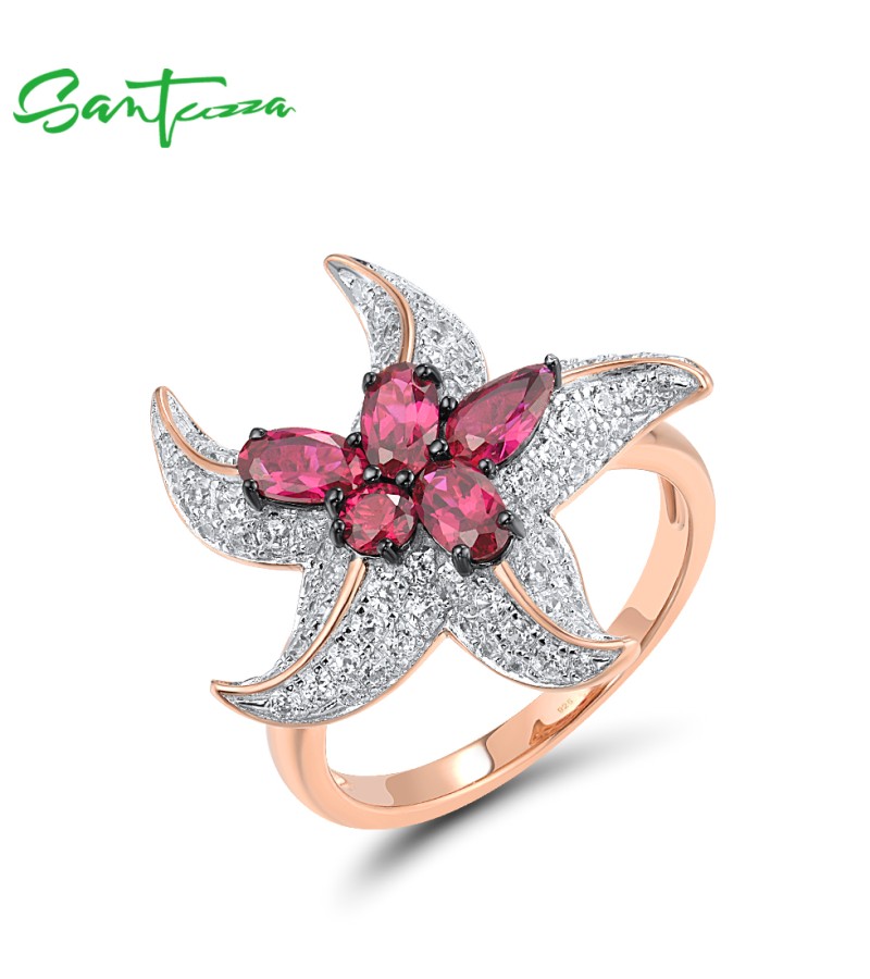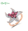 SANTUZZA 925 Sterling Silver Rings White CZ Created Ruby Star Fish Ocean Fine Jewelry