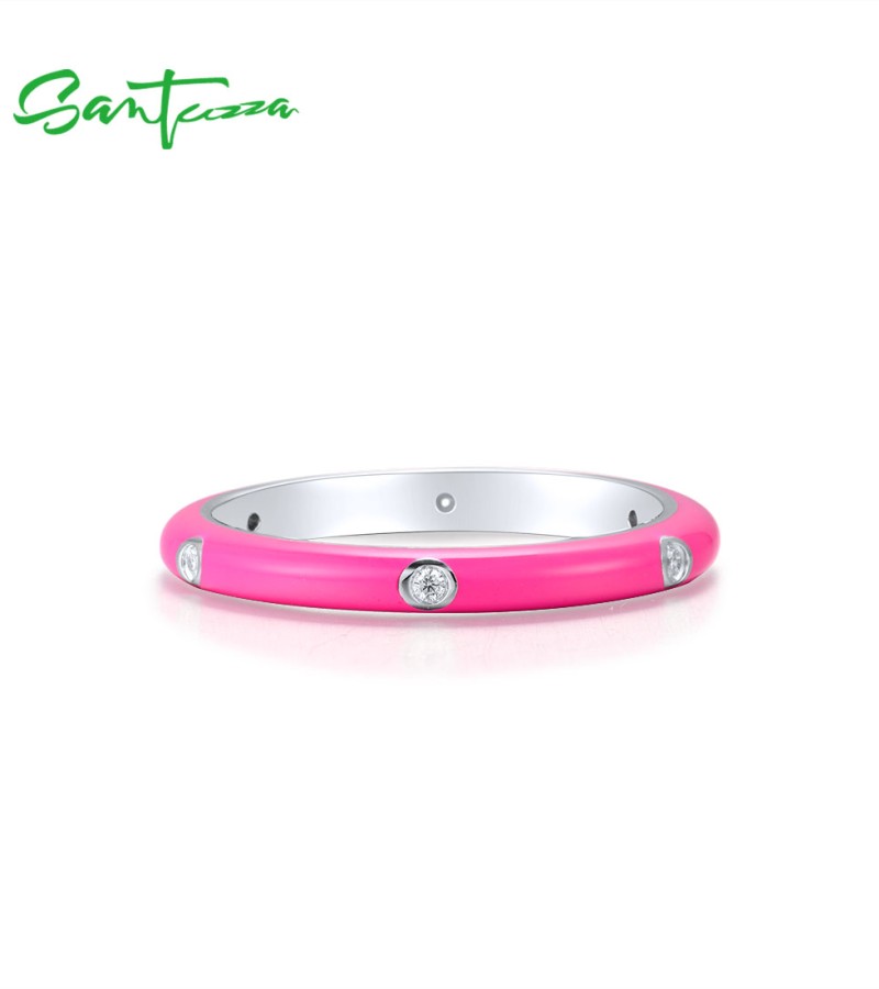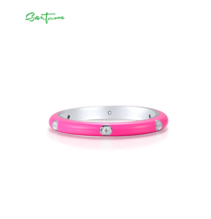 SANTUZZA 925 Sterling Silver White Cubic Zirconia Stackable Ring Jewelry Light Rose Enamel - US 9