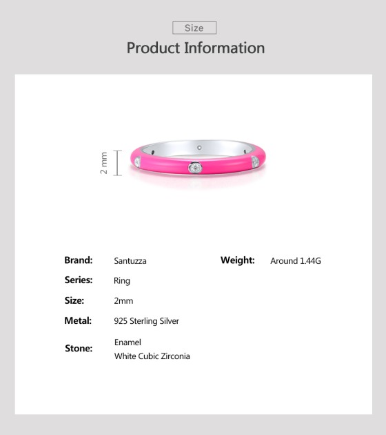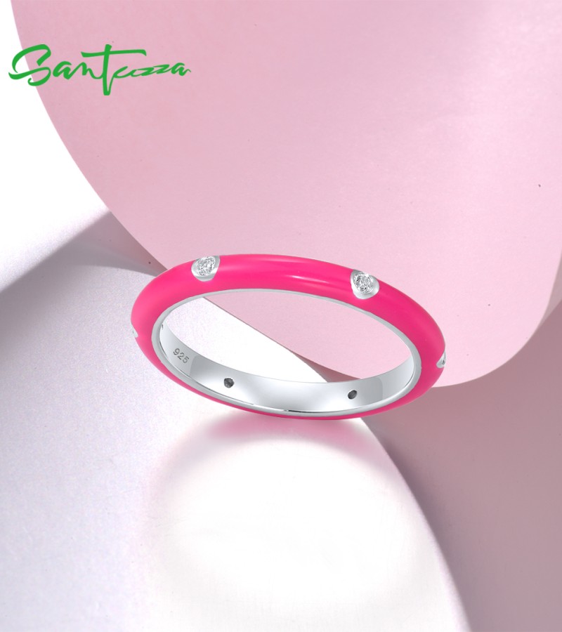 SANTUZZA 925 Sterling Silver White Cubic Zirconia Stackable Ring Jewelry Light Red Enamel - US 9