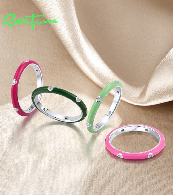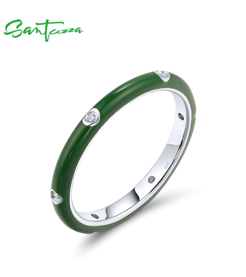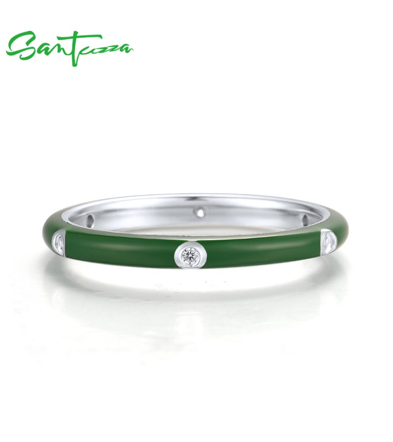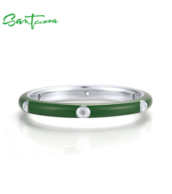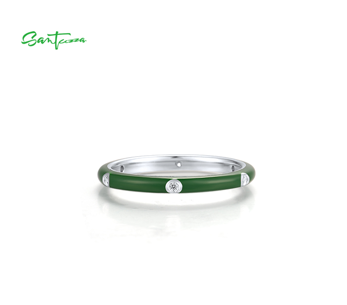 SANTUZZA 925 Sterling Silver White Cubic Zirconia Stackable Ring Jewelry Green Enamel - US 5.5