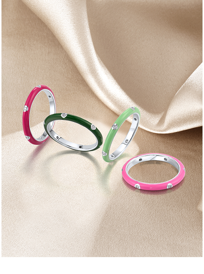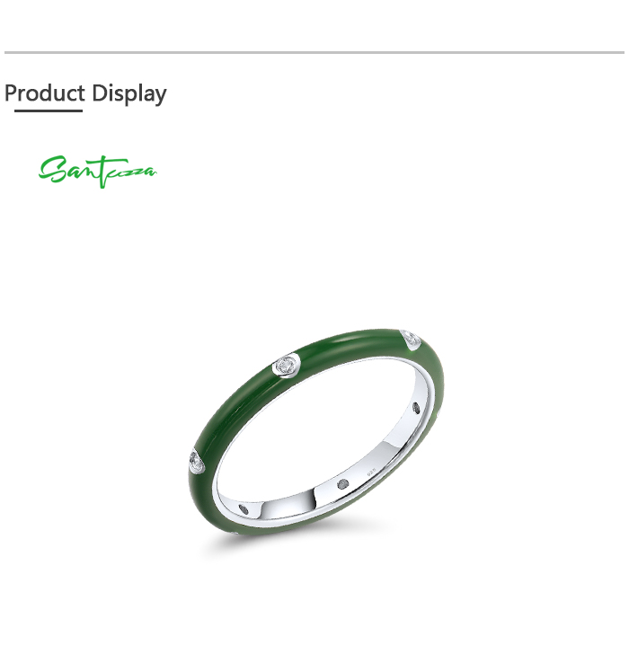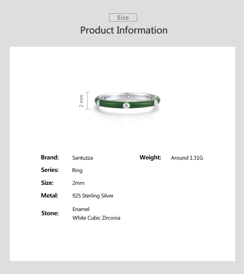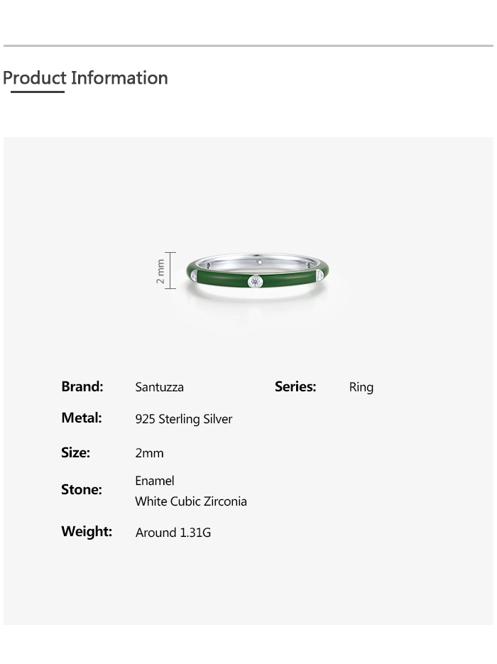 SANTUZZA 925 Sterling Silver White Cubic Zirconia Stackable Ring Jewelry Green Enamel - US 6.5