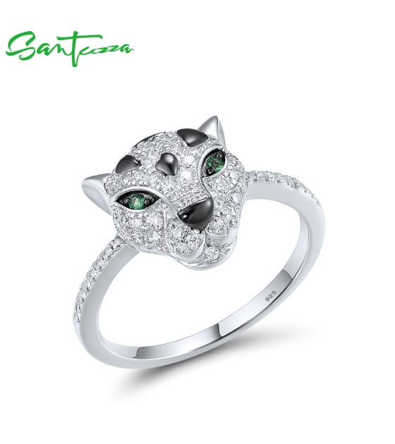 SANTUZZA 925 Sterling Silver Ring Green Spinel White Cubic Zirconia Leopard Animal Jewelry